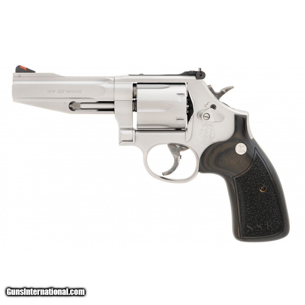 SN:CMT3056. Modern production, .357 magnum with a 4"" barrel. Bore is in excellent condition. L-frame revolver with wooden grips grips stainless steel frame and Custom barrel with recessed precision crown. Overall condition is excellent. comes with box.