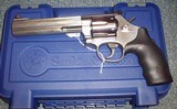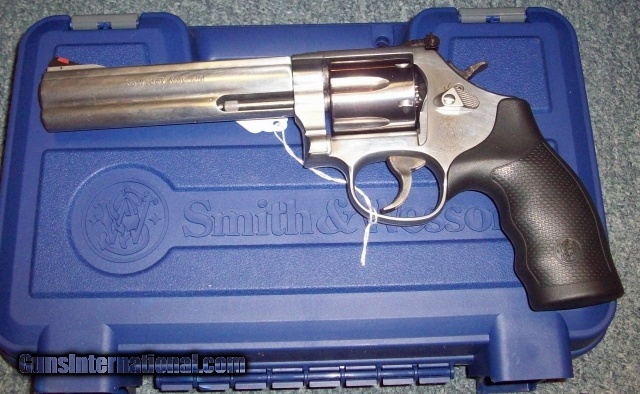 Description: This NEW IN THE BOX STAINLESS STEEL .357 Magnum is the Smith & Wesson 686 PLUS Distinguished Combat Magnum. 7 shot revolver. 6" barrel with adjustable White Outline rear sight and a Red Ramp front sight. . Hogue Rubber Grips. $795.00 SOLD |