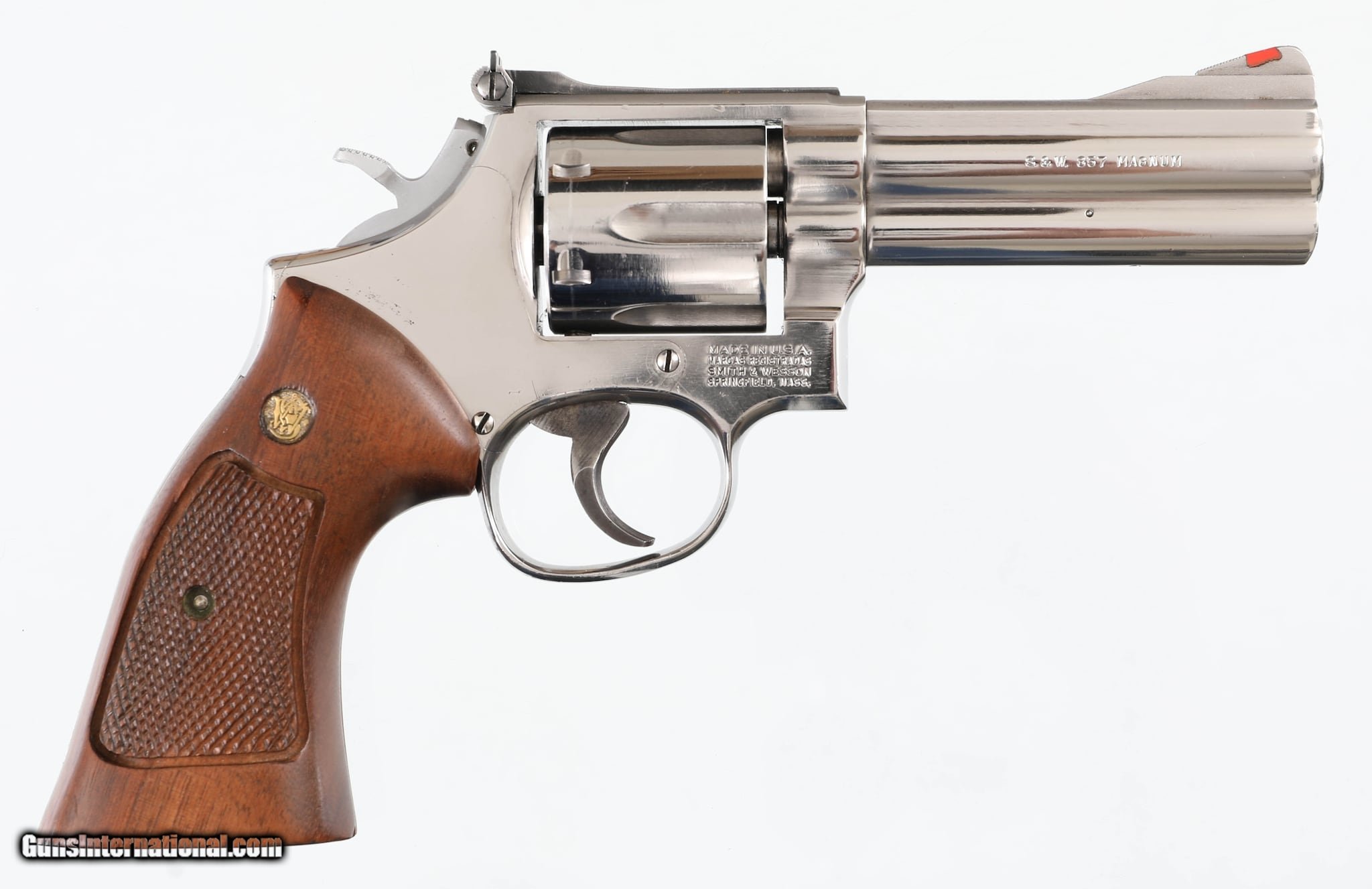 Description: Guns Listing ID: 1222533 MAKE - SMITH & WESSON MODEL - 686 FINISH - STAINLESS STEEL BARREL - 4\" CALIBER - 357 MAGNUM CAPACITY - 6 GRIPS - WOOD CONDITION - VERY GOOD FEATURES - COMES WITH BOX Very good overall condition, metal surfaces appear polished with light handling marks. Mechanically excellent. With factory box, end label illegible. Barrel 4\ SOLD Manufacturer: SMITH & WESSON Model: MODEL 686 NO DASH W/ BOX Caliber Info: .357 MAG Condition: Used - Non-Certified Barrels: 4 BARREL Finish: STAINLESS STEEL |