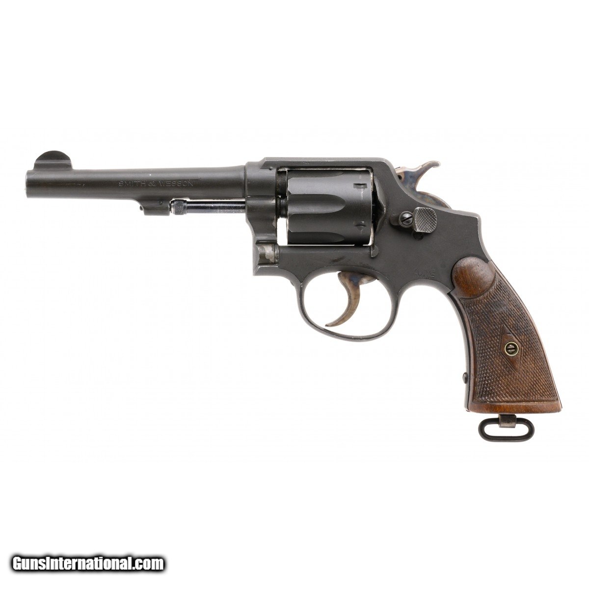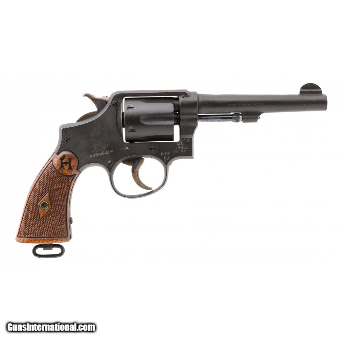 SN: V102732. Made circa 1940's. .38 Special with a 5"" barrel. Bore is shiny with strong rifling. World War 2 Victory model sent to Australia under the Lend Lease Act. Australian import and proof marks can be seen on the right side of the frame. Finish is in very good condition after being arsenal refinished. S&W grips are in good condition with an ""H"" carved into the right grip. Action functions properly. Overall very good condition.