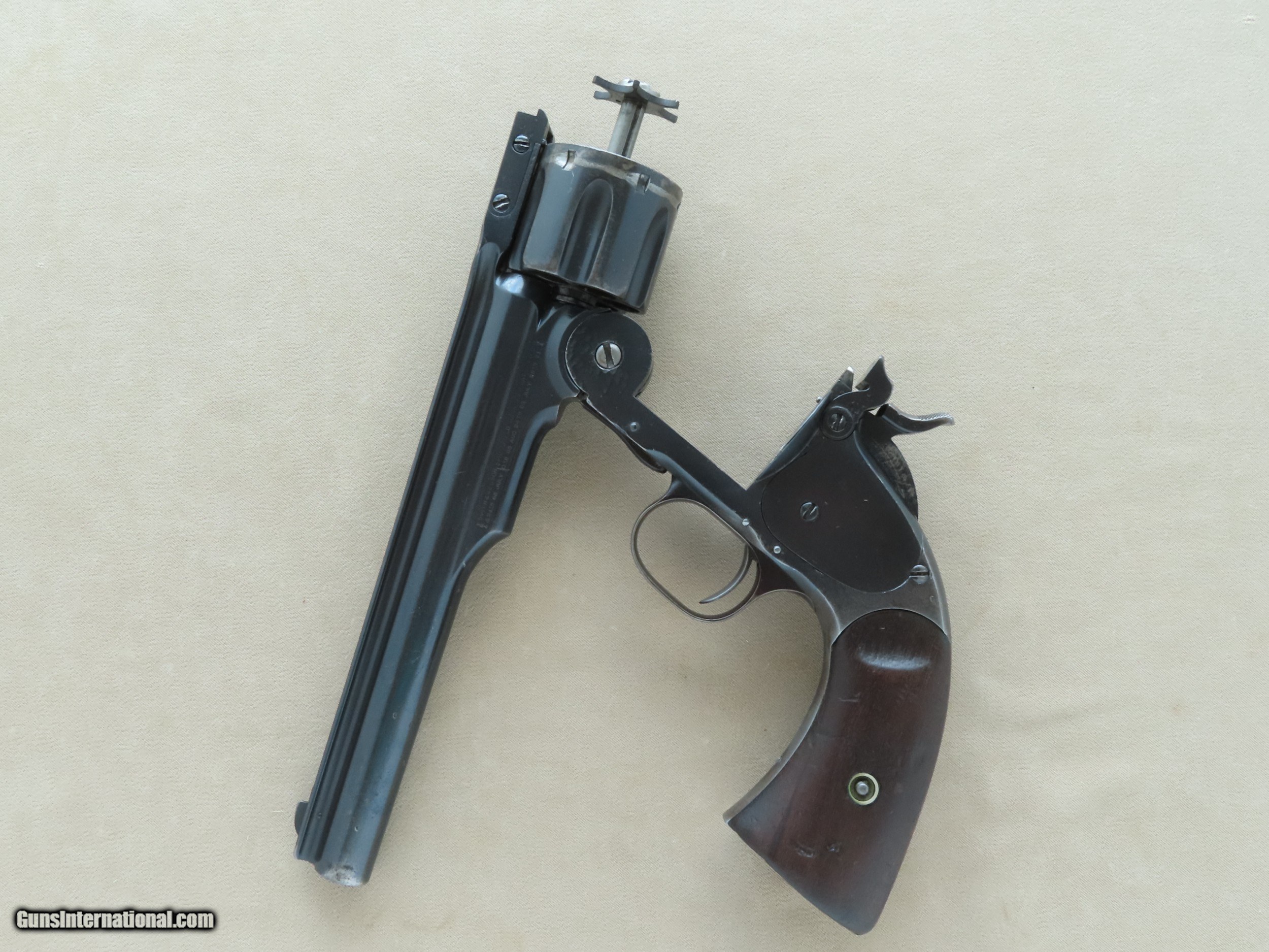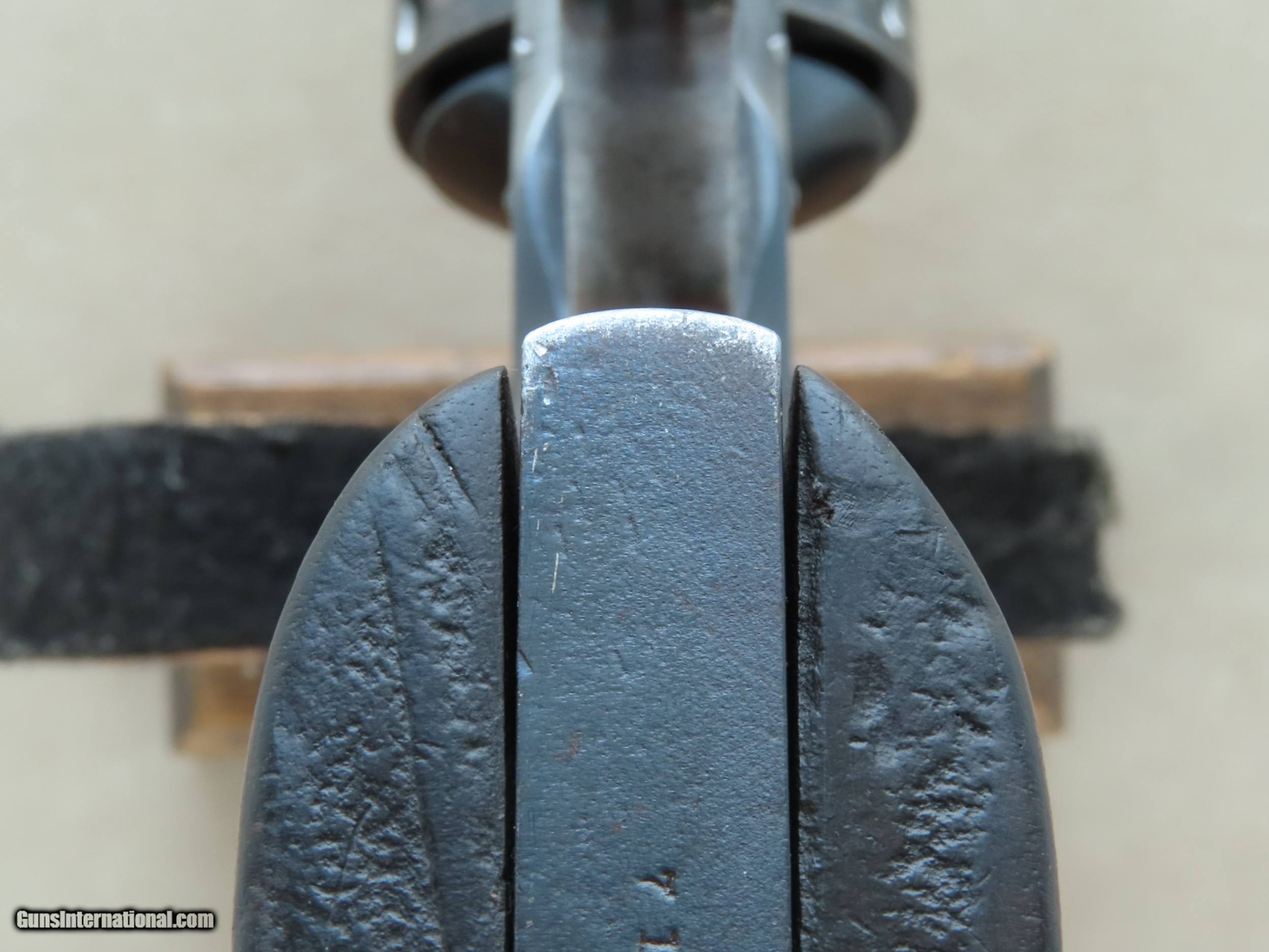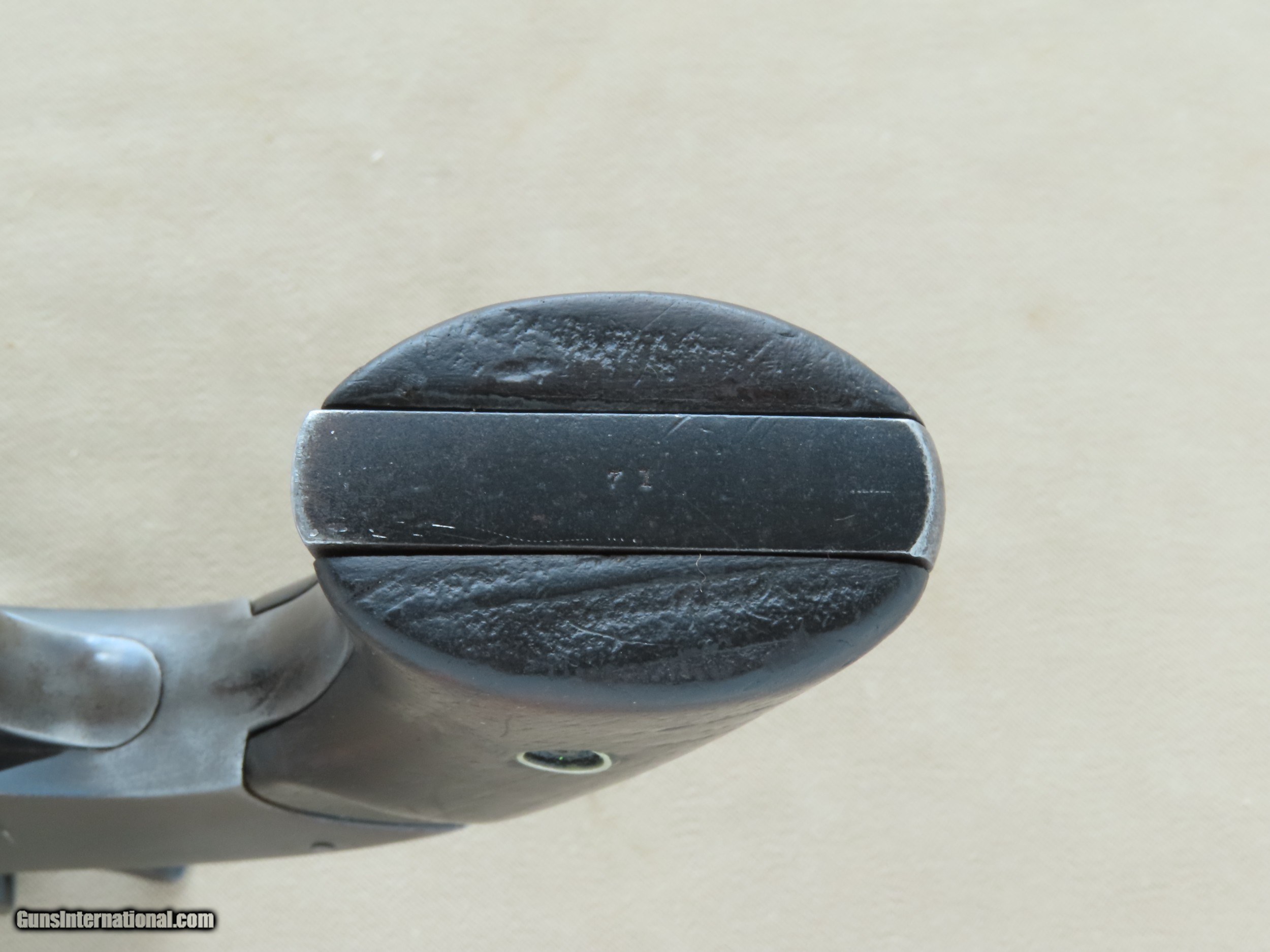 Description: This is a super-early 1st Model U.S. Military Schofield Revolver in .45 S&W otherwise known as .45 Schofield. Refinished some time ago, likely the 1920's or 30's, this 1st Model Schofield is otherwise original and all-matching except for the frame latch, which is also from a 1st Model. The Smith & Wesson Schofield is one of the most famous revolver designs of all time, used by the U.S. Military as well as lawmen, cowboys, outlaws, Wells Fargo, and ordinary Americans. The 4th U.S. Cavalry famously carried the Schofield in the Geronimo campaign, while the 9th and 10th U.S. Cavalry "Buffalo Soldiers" carried the Schofield in the American Southwest where it was used in the American Indian Wars, the Lincoln County War, and battles against the Apaches. Schofield's were also issued in quantity to various state militias all over the United States including New York, Michigan, Indiana, Territory of Washington, California, Kansas, and West Virginia, while small numbers were sent to Arkansas, Colorado, Georgia, Illinois, Tennessee, Florida, Maine, Nevada, North Carolina, Oklahoma, and Pennsylvania. Given the widespread use of the Schofield in the U.S. Military and by various State Militias, the use of the Schofield by famous lawmen including Bill Tilghman and Frank McLowery (of O.K. Corral fame), and the highly publicized use of the Schofield by outlaws such as Jesse James and the James gang, the Smith & Wesson Schofield firmly cemented it's place in American history and lore. Even today, the Schofield is second to only the famous Colt Single Action Army in recognition by both gun collectors and everyday Americans. This particular example has resided within one family for three generations, and has not been for sale on the collector's market since the 1930's. As mentioned before, it has been refinished but it was done a VERY long time ago and it was lightly buffed/cleaned at the very most, as all of the sharp edges and lines are still well-defined and crisp. As you can see from the pictures, the refinished blue is handsome and has an attractive patina, showing wear indicative of it's age but no eyesores. The metal itself shows various light dings and handling marks but no major damage or repairs. All of the original markings are still intact, although the "U.S." on the toe of the butt is extremely faint. The S&W factory markings are all still intact and fully legible on either side of the ejector housing, and all of serial numbers are original factory-stamped. The serial number "71" is stamped on the butt of the frame, on the rear face of the cylinder, on the barrel under the latch, on the barrel-mounted latch itself, and on the inside of the right grip (as proper for this model). As mentioned earlier, the frame-mounted section of the latch is numbered to another gun but is the correct 1st Model style. The U.S. inspector's markings of "L.P." are stamped on the rear face of the cylinder and the rear bottom flat of the barrel, just ahead of the hinge, while the frame is stamped with an "L" on the top of the bottom frame strap. The bore in this S&W is in good condition overall, nice and shiny with good rifling throughout but with some light scattered pitting. The 6 chambers of the cylinder are also in good condition, showing only some scattered minor pitting with the balance smooth and shiny. The original grips on this Schofield are in good shape overall and show wear consistent with the rest of the gun. Both grip panels are solid with no cracks or repairs and fit the gun perfectly with just a tiny touch of warping at the butt. The grip escutcheons and screw are both still intact and in good overall condition. The action on this Schofield is in good working order, smooth and in time. The trigger is very light, breaking cleanly with a very light pull. All of the controls are still in perfect working order, including the auto ejection and latch assembly, which locks up tight with ZERO play between the barrel/cylinder assembly and the frame. If you have been looking for an honest original S&W 1st Model Schofield revolver for your collection that is handsome yet still affordable, serial number "71" would be the perfect choice. You would be hard-pressed to find a more historically important cartridge revolver to 19th century American history than this one, it is truly a "centerpiece" addition to any antique firearms collection. As an antique, this can be shipped directly to the buyer's home, no FFL needed. SOLD Antique: Yes Handgun Caliber: .45 Schofield (.45 S&W Schofield, .45 S&W) Manufacturer: Smith & Wesson Model: Schofield (1st Model - U.S. Military) Serial Number: 71 Barrel Length: 7" Inches Condition: Very Good (As-Refinished) Metal Condition: Good (Old Refinish) Wood Condition: Good Bore Condition: Good Action: Single Action Revolver Finish: Blued (Old Refinish) Sights: Fixed Iron Sights Manufacture Date: 1875 |
