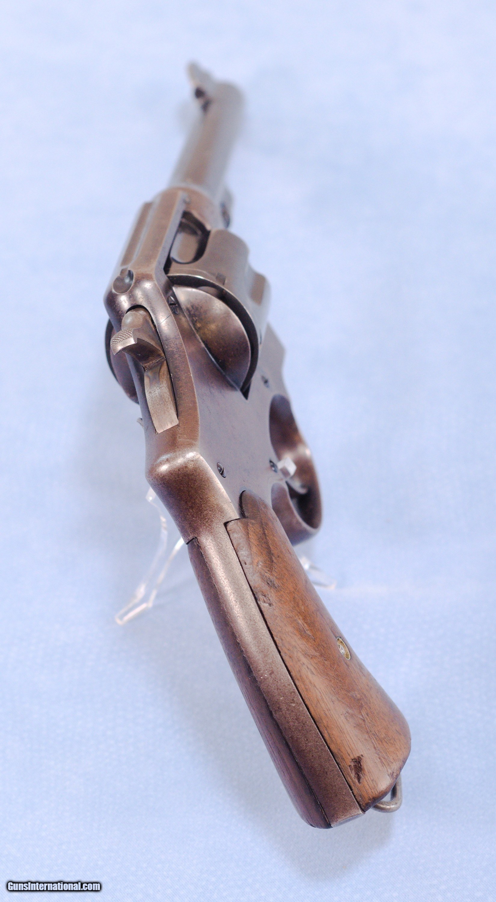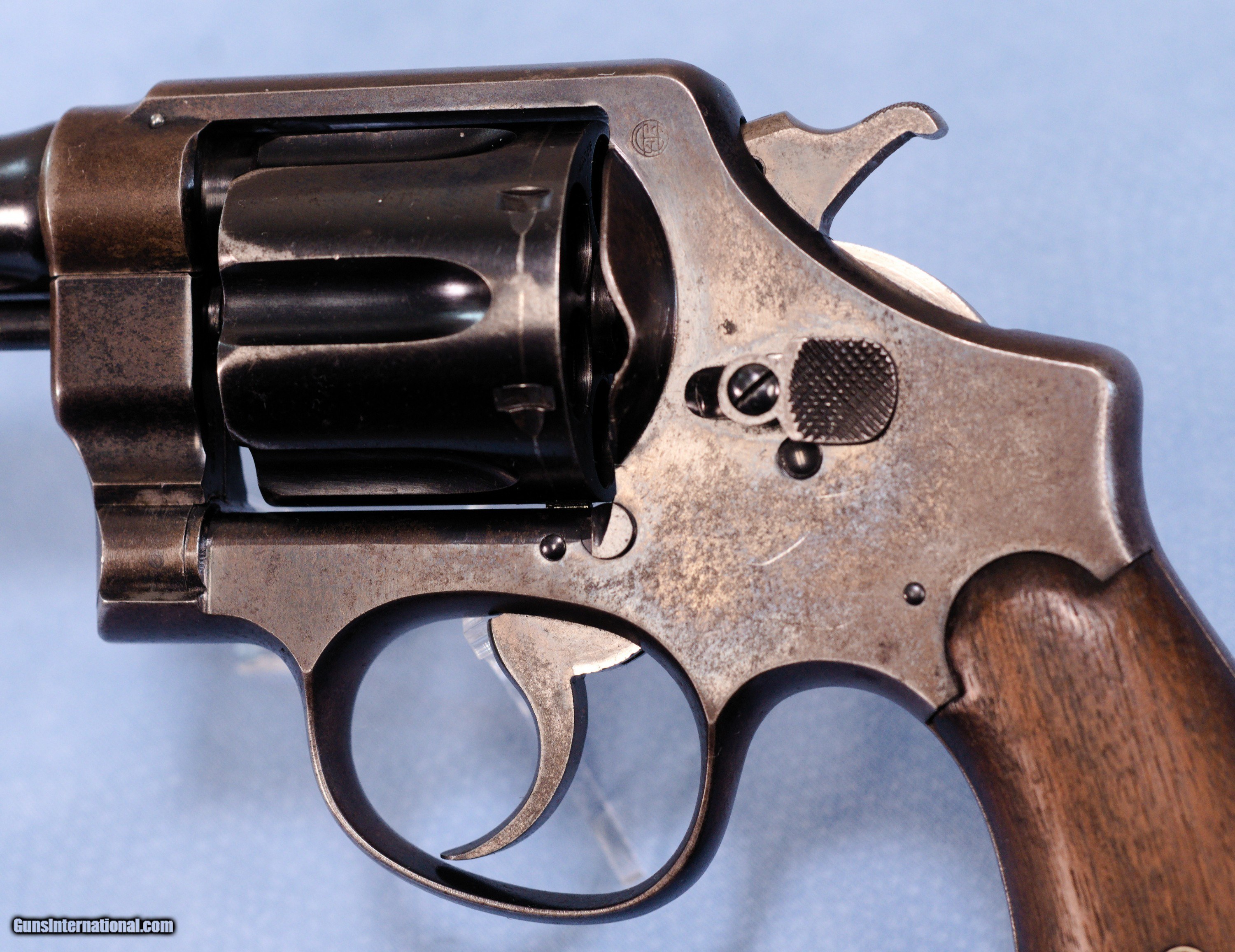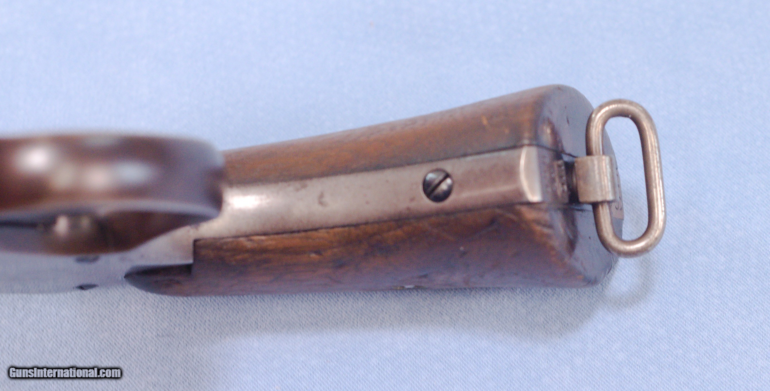 Description: This is a WW1 production Smith & Wesson U.S. Model 1917 revolver in .45ACP. The Model 1917 revolver was put into production during WW1 in 1917 as a supplement to the U.S. Military's standard issue Model 1911 .45 ACP automatic pistol. There simply were not enough 1911's in inventory or in production to arm the rapidly expanding A.E.F. forces. The Model 1917 revolver was manufactured by both Smith and Wesson and the Colt firm during WW1. This 1917 is in very good overall condition with about 60% of the original bluing remaining, the balance being an even patina. The U.S. Property marking on the bottom of the barrel has been removed which is common on on U.S. sidearms that made their way into the civilian world. The action is still tight on this gun and in perfect time, and the barrel has a nice bore with only very light frosting in the grooves. The smooth walnut grips show wear typical of a service revolver of this era. This is a cool shooter grade 1917 revolver that likely saw combat in WW1, and possibly World War 2 as well. PRICE: $750.00 We are Antique & Modern Firearms in Lexington, KY, a dealer of fine firearms since 1974. PH. 859-276-1419 We Buy, Sell, and Trade Firearms & Knives. Have an Individual Firearm, Firearms Collection, or Firearms Estate to sell, let us know, and we can buy or consignment sell it for you. NOTE: No additional fee for a Credit Card payment. SOLD Curio/Relic: Yes Handgun Caliber: .45 ACP (.45 Auto) Manufacturer: Smith & Wesson Model: 1917 Serial Number: 42056 Barrel Length: 5.5 Condition: Good Metal Condition: Good Wood Condition: Good Bore Condition: Very Good strong rifling Action: Double Action |