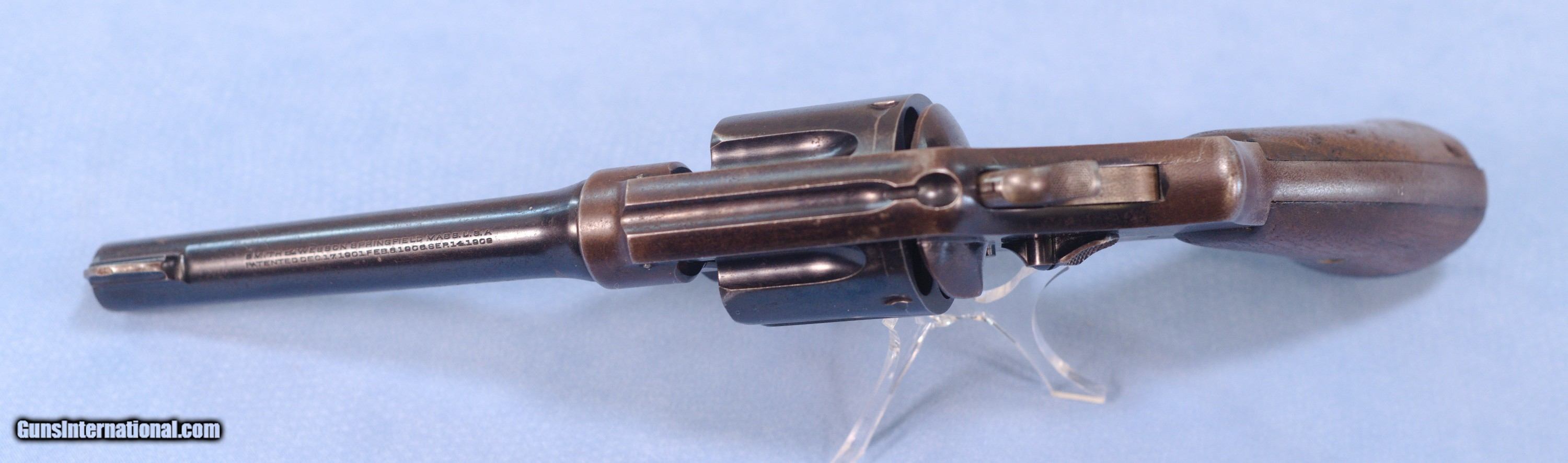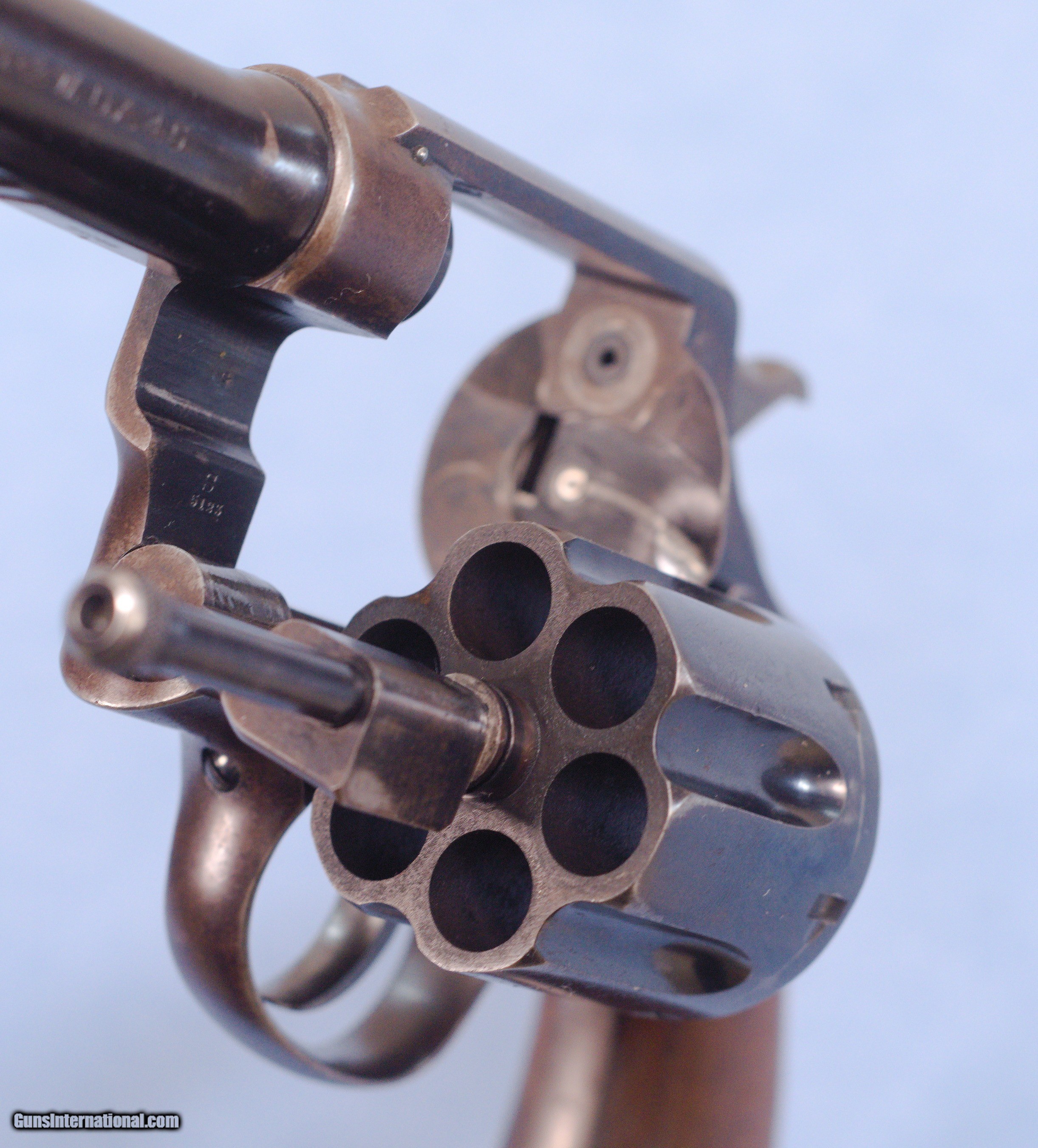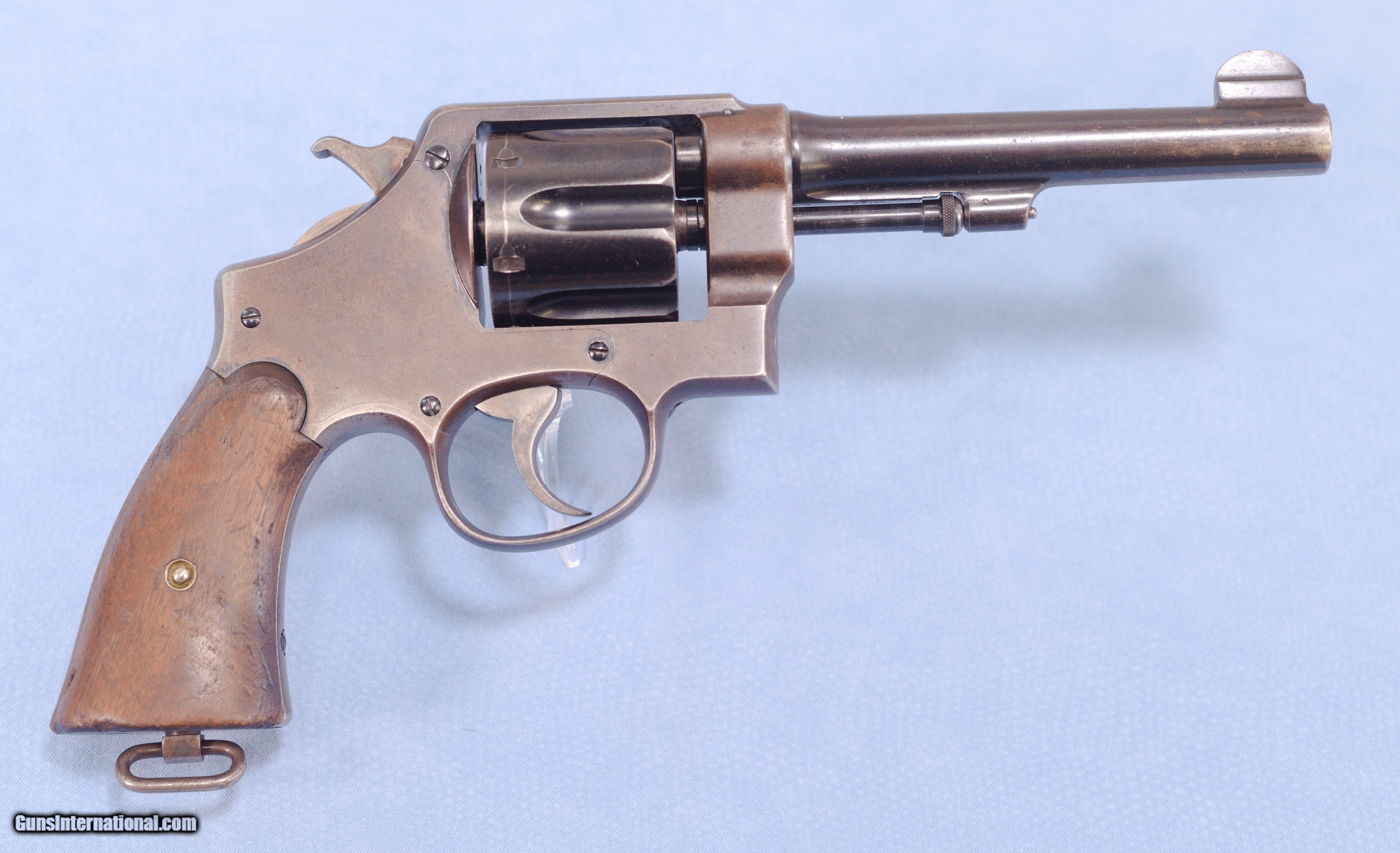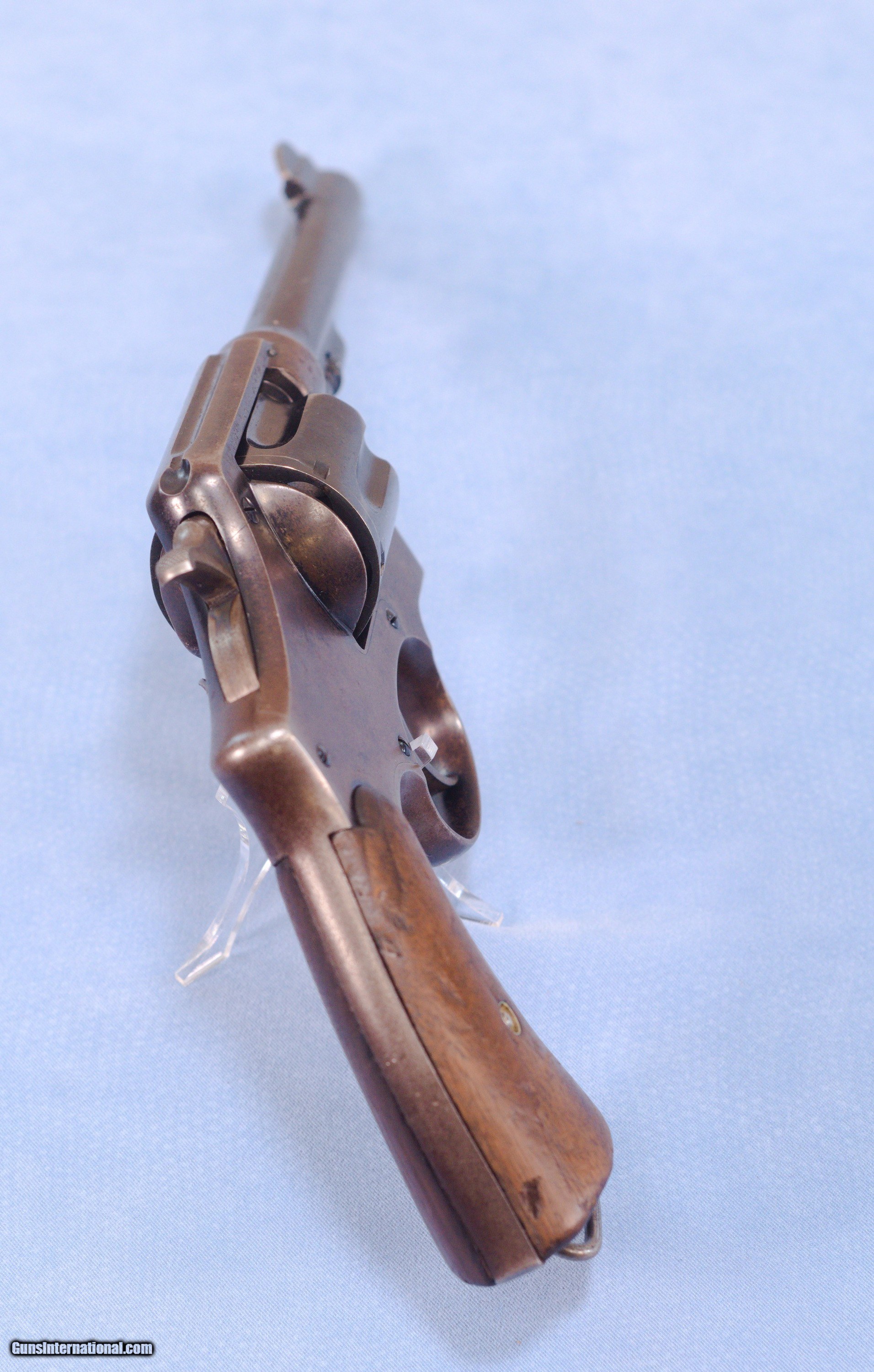 Description: This is a WW1 production Smith & Wesson U.S. Model 1917 revolver in .45ACP. The Model 1917 revolver was put into production during WW1 in 1917 as a supplement to the U.S. Military's standard issue Model 1911 .45 ACP automatic pistol. There simply were not enough 1911's in inventory or in production to arm the rapidly expanding A.E.F. forces. The Model 1917 revolver was manufactured by both Smith and Wesson and the Colt firm during WW1. This 1917 is in very good overall condition with about 60% of the original bluing remaining, the balance being an even patina. The U.S. Property marking on the bottom of the barrel has been removed which is common on on U.S. sidearms that made their way into the civilian world. The action is still tight on this gun and in perfect time, and the barrel has a nice bore with only very light frosting in the grooves. The smooth walnut grips show wear typical of a service revolver of this era. This is a cool shooter grade 1917 revolver that likely saw combat in WW1, and possibly World War 2 as well. PRICE: $750.00 We are Antique & Modern Firearms in Lexington, KY, a dealer of fine firearms since 1974. PH. 859-276-1419 We Buy, Sell, and Trade Firearms & Knives. Have an Individual Firearm, Firearms Collection, or Firearms Estate to sell, let us know, and we can buy or consignment sell it for you. NOTE: No additional fee for a Credit Card payment. SOLD Curio/Relic: Yes Handgun Caliber: .45 ACP (.45 Auto) Manufacturer: Smith & Wesson Model: 1917 Serial Number: 42056 Barrel Length: 5.5 Condition: Good Metal Condition: Good Wood Condition: Good Bore Condition: Very Good strong rifling Action: Double Action |