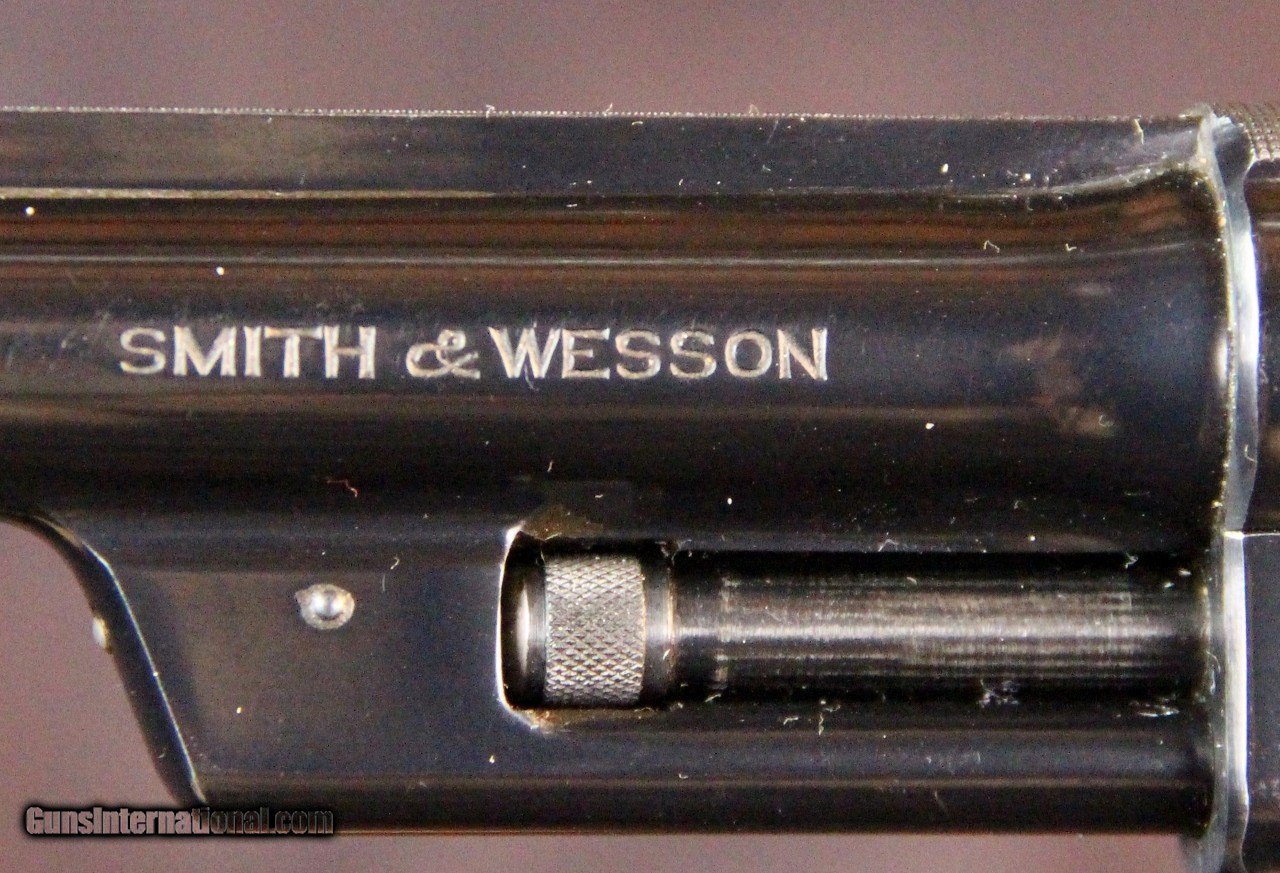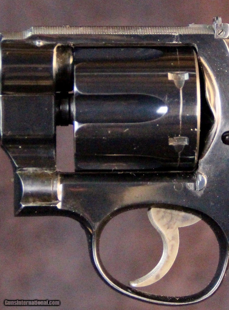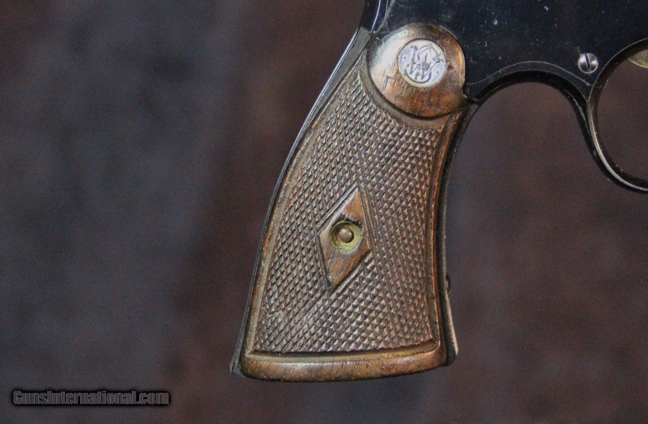 Description: .357 mag, #45459, 8 3/4 inch barrel, blue and case color finish, 2 piece walnut diamond grips, registered number 260, small trade mark on left side of frame, letter applied for, circa 1930's Condition: bright excellent bore, 97% blue overall, small holster rub on left muzzzle, light use scratches, bolt stop drag line on cylinder, 98% case color on trigger, grips are under sized and not original to the revolver, excellent mechanically, excellent marks SOLD Curio/Relic: Yes |