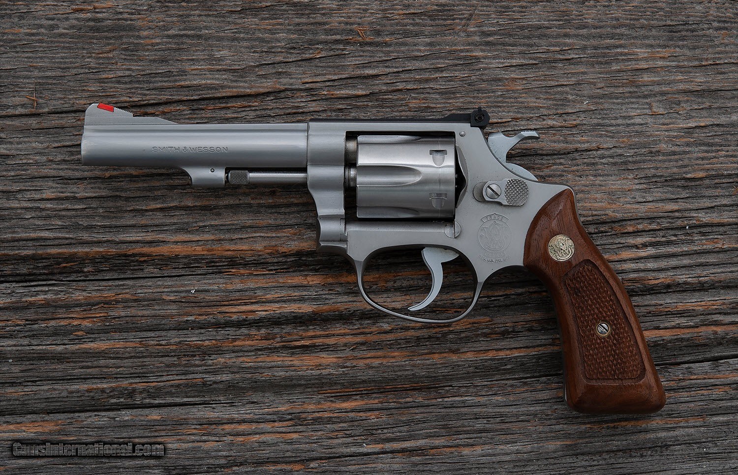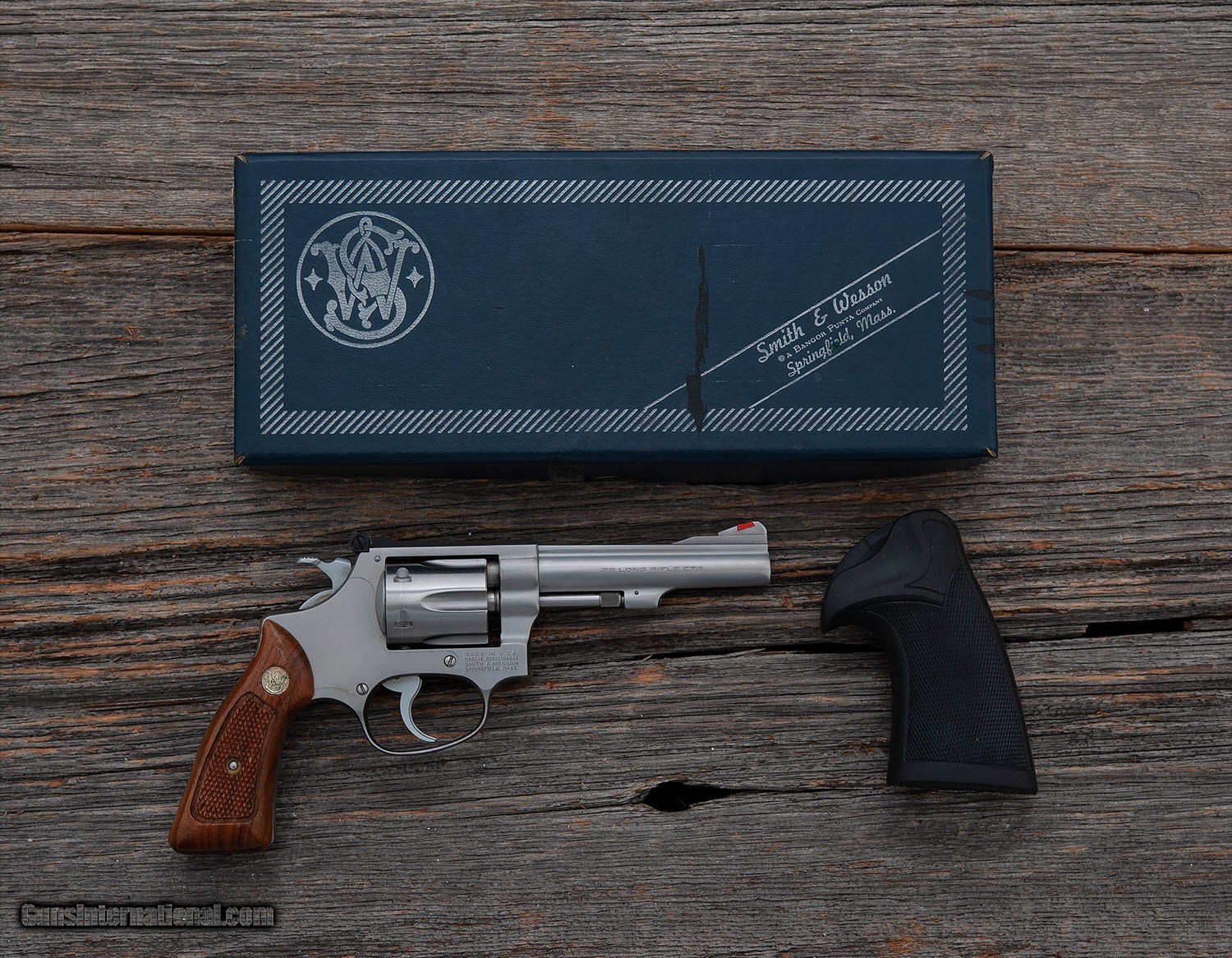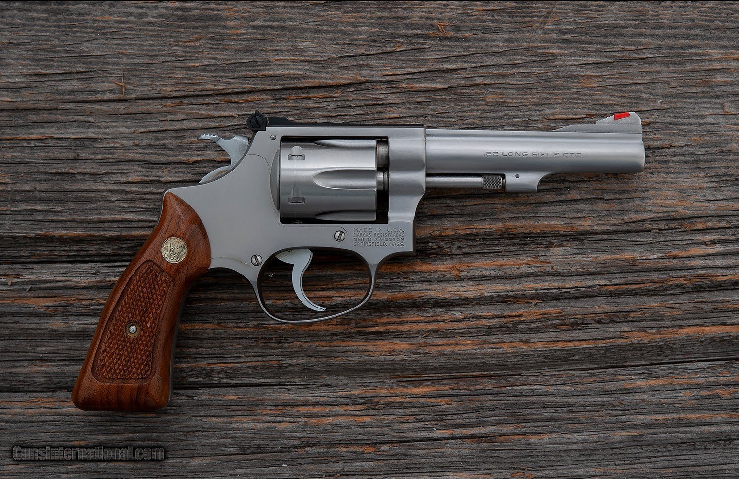 Smith & Wesson - 63 - .22 -  Description: Smith & Wesson - 63 - .22 - Item Number: SMIM176809 Barrel length: 4 Finish: Stainless Lop: NA Lbs: |/23| Ozs: 10 Overall condition: Very Good Stock condition: Very Good Metal condition: Very Good Stock:Original Metal:Original Type of Case: Factory Box Manufactured in: USA Comments: Smith and Wesson Model 63 built on the Square butt J-Frame in stainless steel with fully adjustable rear sights for windage and elevation, and red ramp front sights.The JFrame is S&W's smallest frame and these guns were known as "Kit Guns" as they would fit in your fishing kit to be used as snake guns.This revolver comes with an extra set of Pachmyer grips. Very clean, factory box, extra grips, no paperwork. HG-29 Very clean, factory box, extra grips, no paperwork. HG-29 SOLD |