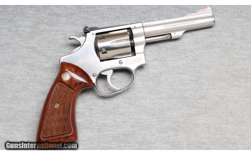 Smith & Wesson ~ 63 ~ .22 LR  Description: Very good condition, light finish wear, small nicks and scratches. S&W .22 rimfire 6 shot revolver with 4" barrel, stainless finish, adjustable sights, double and single action trigger and S&W factory wood grips. .22 Long Rifle SOLD Chambers: Revolver Metal Condition: Very good Wood Condition: Grips are very good Bore Condition: Bright Barrels: 4 Triggers: Double and single action Butt Pad: Wood grips Sights: Adjustable Item Location: La Vista, NE |