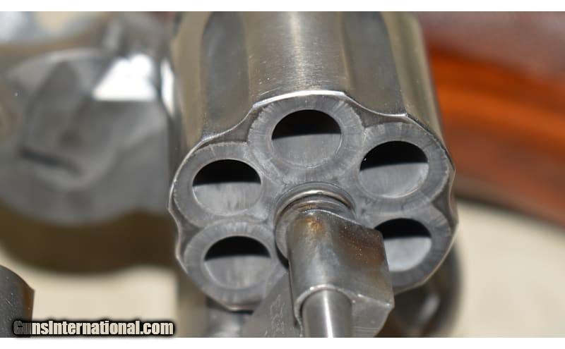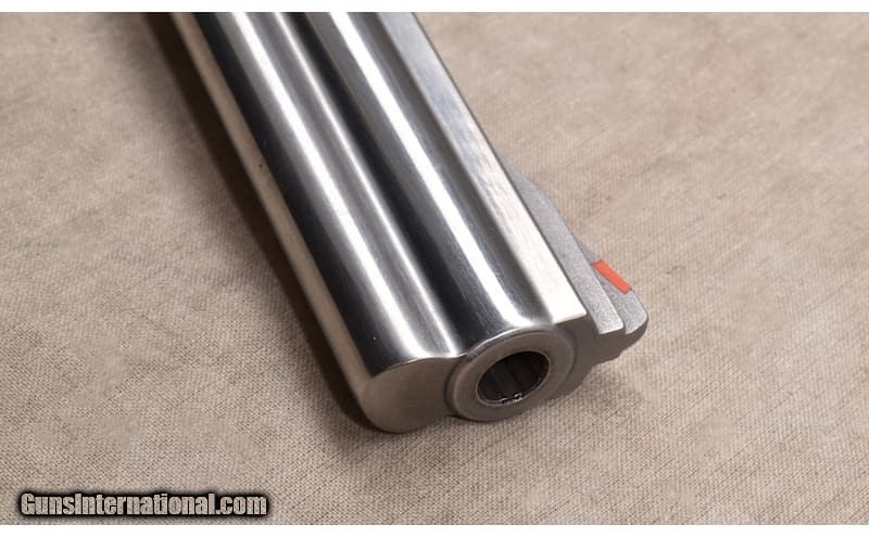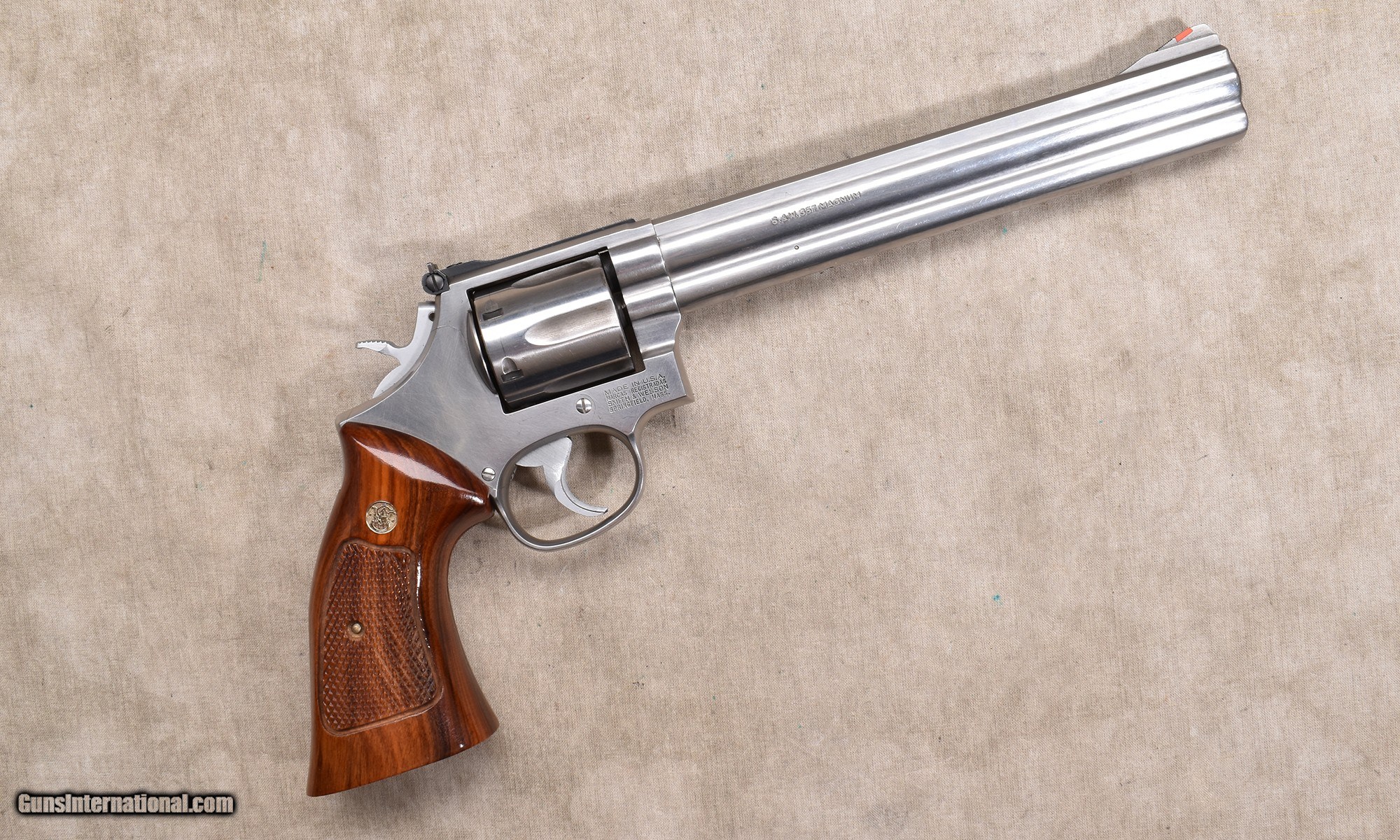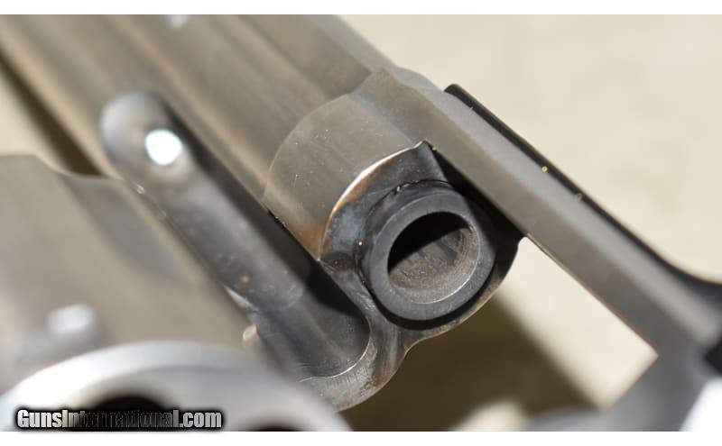 Description: This Smith and Wesson is configured with a long barrel to make it a hunting or target revolver. It has adjustable target sights, wide target trigger, and knurled hammer. .357 Magnum Chambers: 6 rounds Metal Condition: Very good. Firing residue on the cylinder face. Wood Condition: Very good to excellent. Bore Condition: Shiny and bright with good rifling. Barrels: 8-3/8 inches Triggers: Factory double and single action trigger. Butt Pad: Checkered walnut with S&W medallions. Weight: 53 oz Sights: Serrated ramp with red insert and white outline adjustable notch. Item Location: Rogers Price: $849.99 Contact Seller |