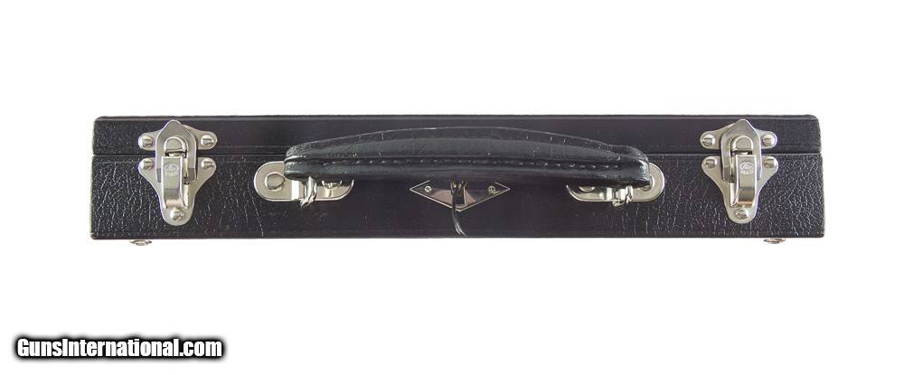 Description: This magnificent and highly unique Harry Jarvis Factory Class A Engraved Smith & Wesson Pre Model 27 has been in one collection since the early 1980's and is only now coming to the market for the first time in over forty years! The gun is published in Michael J. Kennelly's 'Smith & Wesson Engraving' on pages 202-203. Included is a factory letter confirming the configuration and detailing its original shipment on April 21, 1954 to Rex Firearms in New York, New with a 6 1/2" barrel, special red post front sight, target hammer, deluxe checkered rosewood diamond target stocks and Class A factory engraving. A truly special and heirloom grade N-frame that comes in a french fitted Moroccan leather Marvin Huey custom handmade pistol case complete with tools and key. The gun rates 99%+ on any scale and features an unusual and highly detailed engraving pattern with tight and delicate floral vine-work climbing against a fine punchdot background. Note the surprising amount of embellishment especially in the protected areas and on the special ordered front sight. Positively the finest Harry Jarvis Factory Engraved Pre Model 27 to be found! The impeccable provenance and publishing credit are even further enhanced by the fantastic Marvin Huey french fitted case. A must own N-frame that is its own one-gun collection! Buyer pays $75 for fully insured shipping. Call or text anytime and be sure to check out our other listings! SOLD |