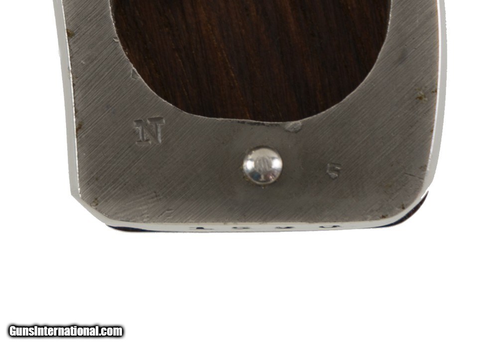 Description: A factory letter accompanies this extremely rare revolver confirming the configuration and detailing its original shipment on March 24, 1952 to Firearms International Inc. in Washington, DC. This was part of a 10 unit order, bringing the total number of known examples up to 13. This is the most difficult post war J-frame to acquire! The gun comes in a proper red box with the NOX-Rust Paper. The gun retains virtually 99% of the original nickel finish which is bright and clear with only the faintest of collector-type handling evidence and aging present. In a lifetime of searching you will likely never find another such example in any condition, and you will never upgrade this one! A supremely fine original nickel Baby Chief. Buyer pays $35 for shipping. Call anytime day or night. Be sure to check out our other listings! SOLD Curio/Relic: Yes Manufacturer: Smith & Wesson Serial Number: 1590 |