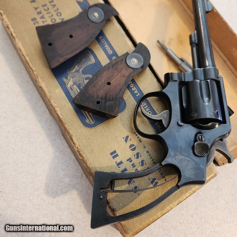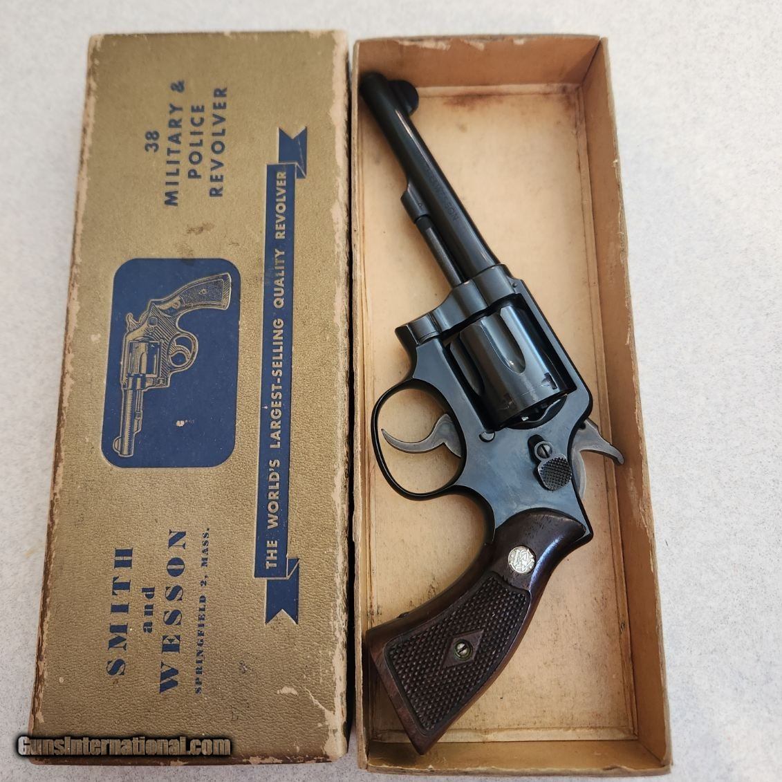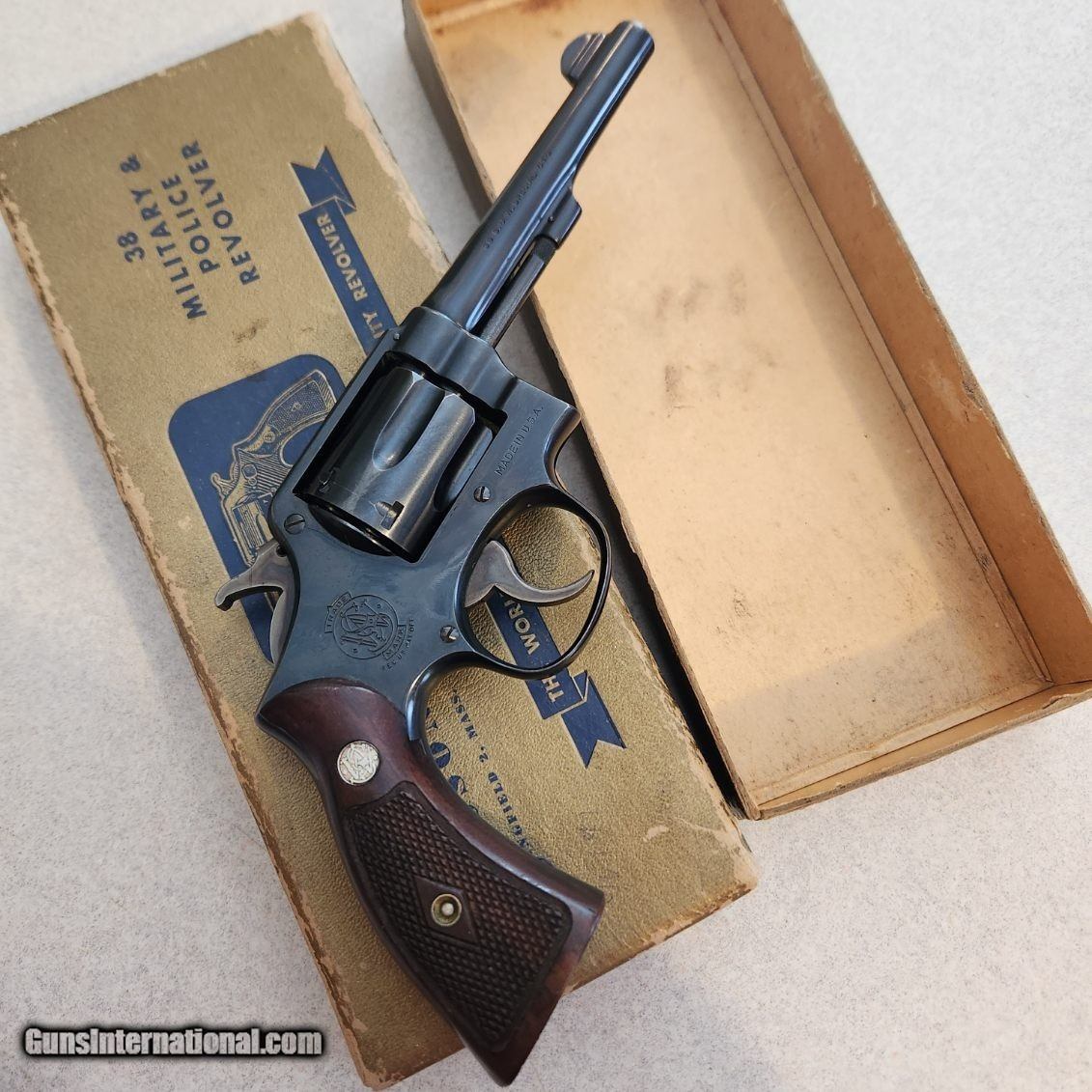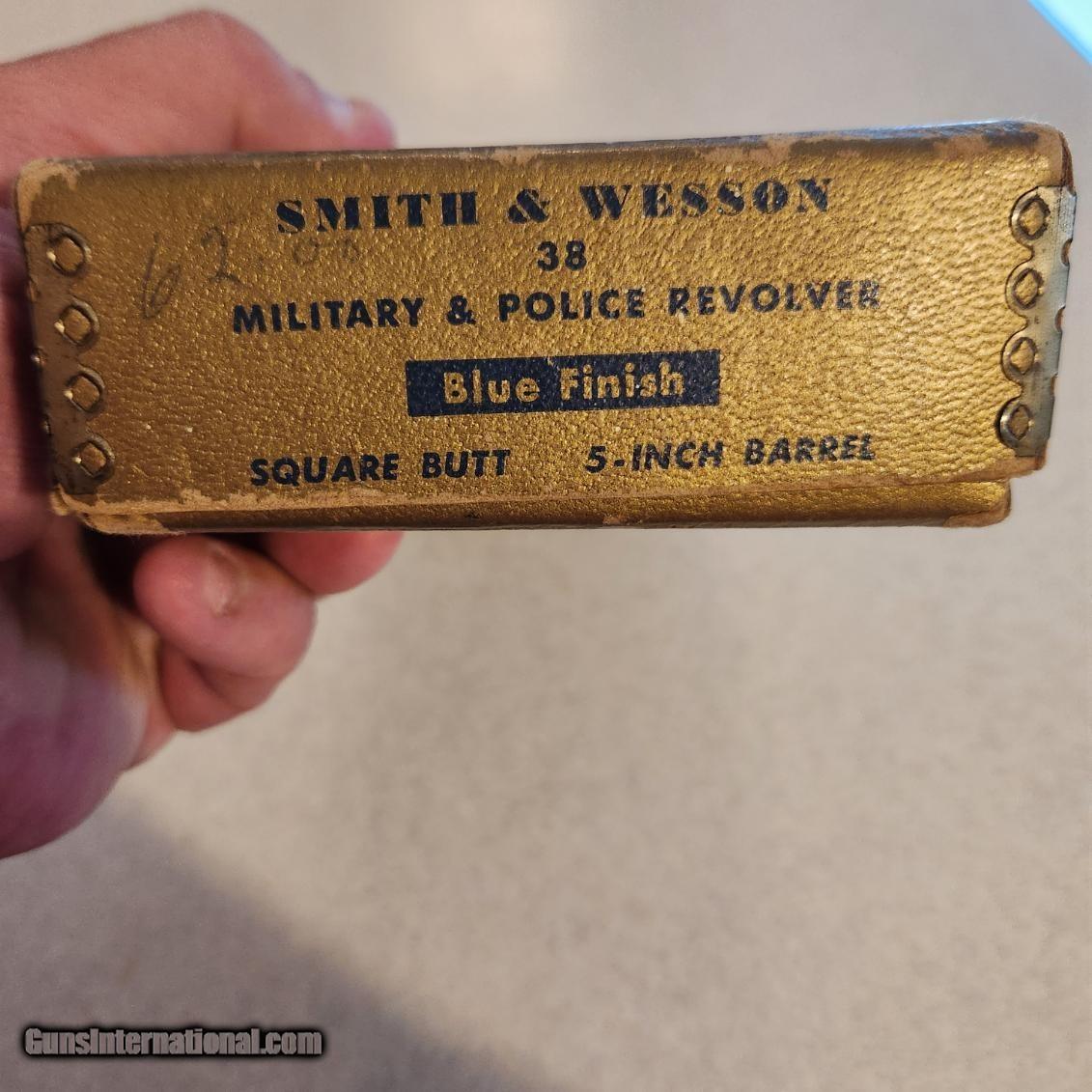 Description: Smith and Wesson pre model 10 M&P revolver. Very good original condition, gold box is decent no tears or rips. 5" barrel 38 special. Made late 40s . Interesting serial number as shown. Price is shipped to your FFL providing they accept from shipmygun. Otherwise add $40 if it comes from my FFL SOLD Handgun Caliber: .38 Special Manufacturer: Smith and Wesson Model: M&P pre model 10 Barrel Length: 5 Condition: Very good Metal Condition: Very good Wood Condition: Very good Bore Condition: Very good Action: Revolver |