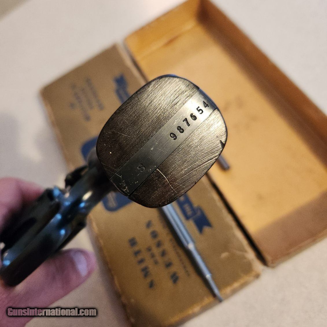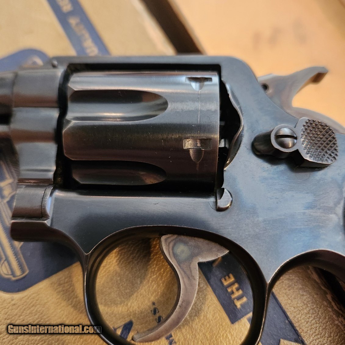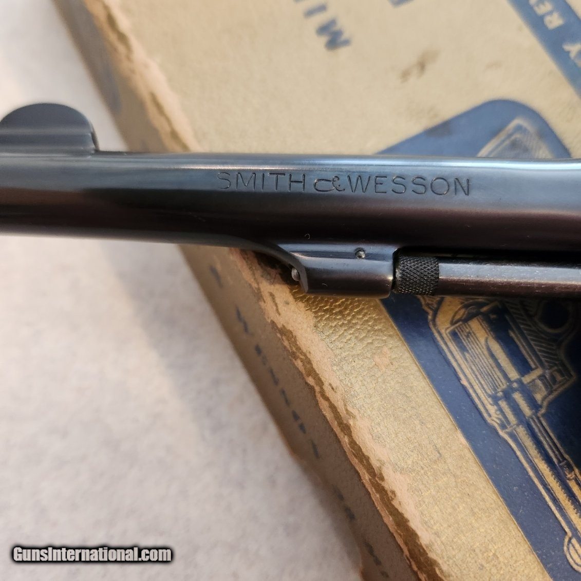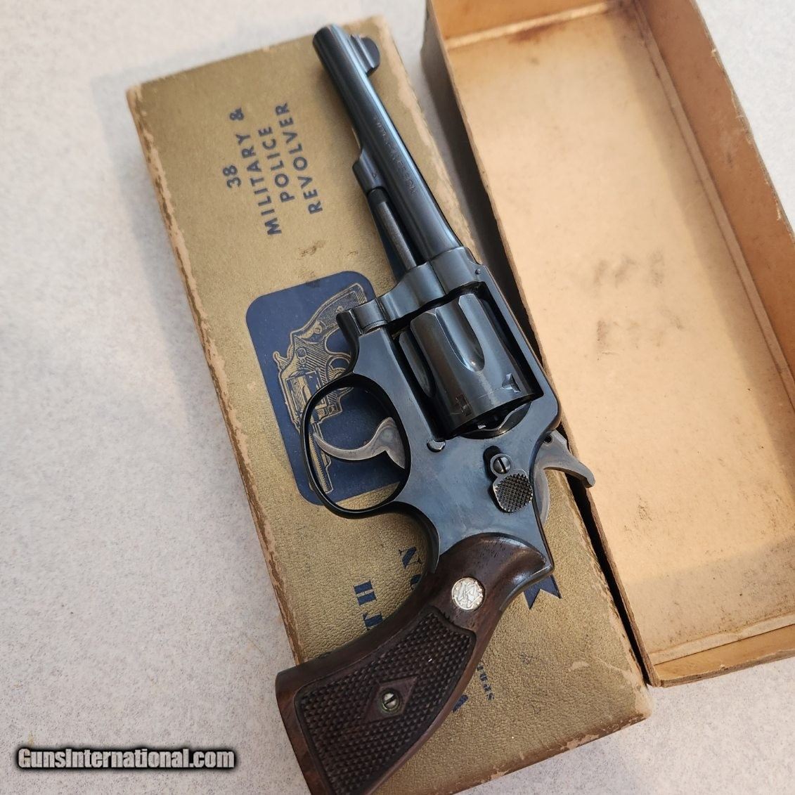 Description: Smith and Wesson pre model 10 M&P revolver. Very good original condition, gold box is decent no tears or rips. 5" barrel 38 special. Made late 40s . Interesting serial number as shown. Price is shipped to your FFL providing they accept from shipmygun. Otherwise add $40 if it comes from my FFL SOLD Handgun Caliber: .38 Special Manufacturer: Smith and Wesson Model: M&P pre model 10 Barrel Length: 5 Condition: Very good Metal Condition: Very good Wood Condition: Very good Bore Condition: Very good Action: Revolver |