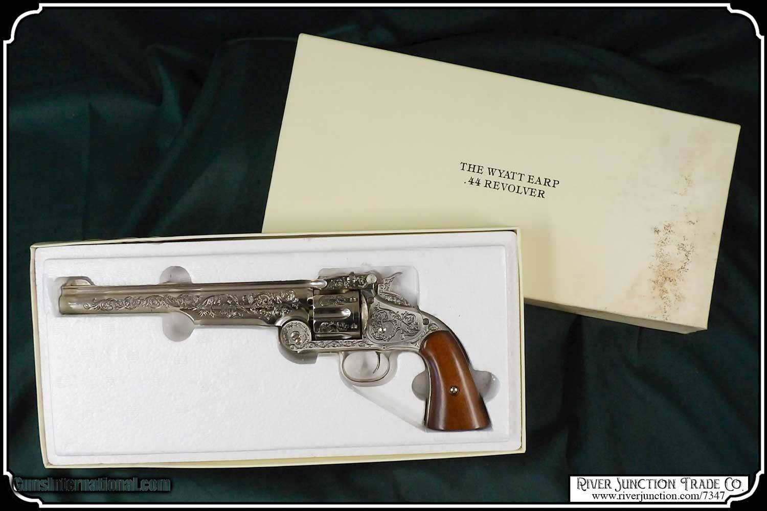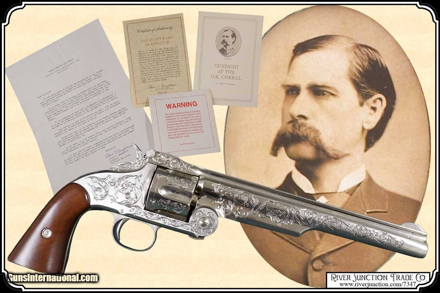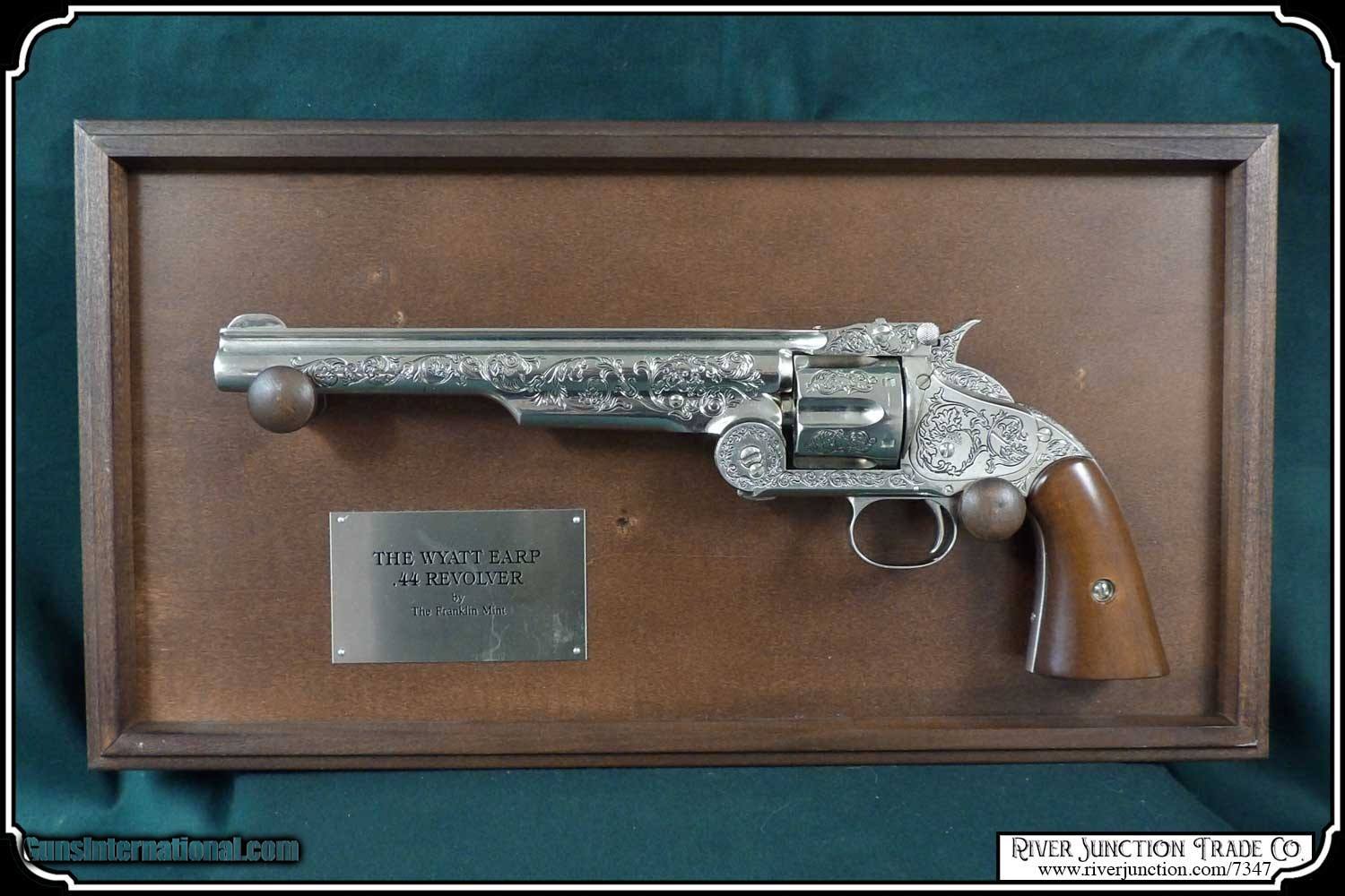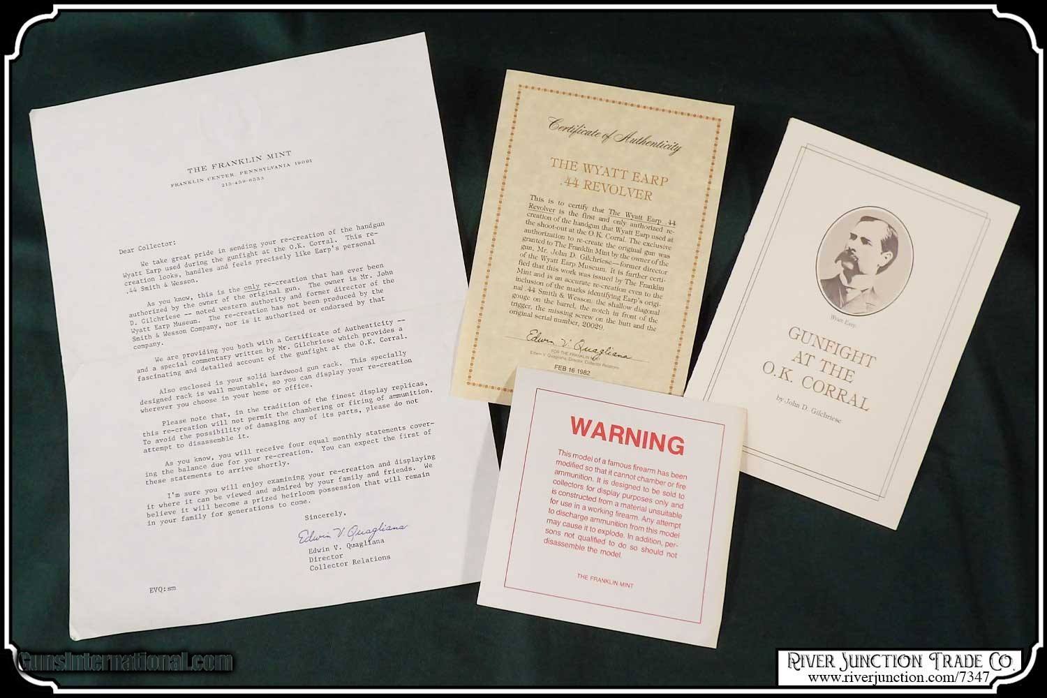 Description: The Franklin Mint Presents a tribute to WYATT EARP OK Coral and the smell of Gunsmoke With this accurate recreation of the SMITH & WESSON AMERICAN REVOLVER. This non firing revolver otherwise functions in every way exactly like the original S&W American. It has the heft and the feel of the American. With the first click of the hammer the cylinder is released to spin free. When the hammer is pulled to full cock the cylinder locks into batter. When the hammer falls the cylinder remains locked until you click the hammer to safety position. At that point you release the top barrel latch to break open and the ejector raises as if it were ejecting spent cartridges. Included are documents that support this work of fine art. Price: $595.00 Buy Now Contact Seller |
