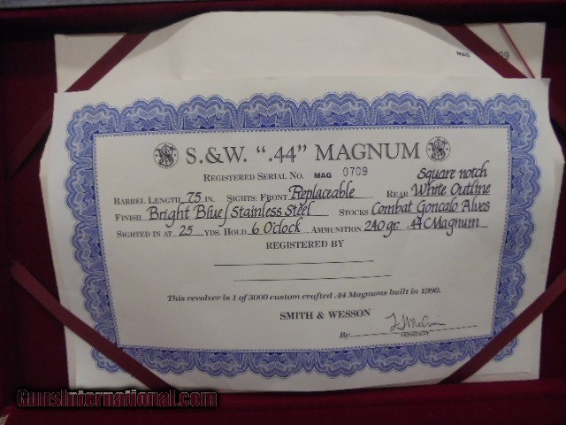 Description: CONSIGNMENT VERY GOOD CONDITION SMITH & WESSON 29 MAGNACLASSIC 29-5 .44 MAG -- BRIGHT BLUE FINISH / STAINLESS STEEL -- 7.5" BARREL -- WHITE OUTLINE REAR SIGHT FRONT SIGHT REPLACEABLE ( 7 EXTRA INSERTS) -- COMBAT GONCALO ALVES GRIPS -- BUILT IN 1990 HAS PRESENTATION CASE AND ALL PAPER WORK INCLUDING TARGET THERE IS A CYLINDER RING BUT APPEARS TO BE UNFIRED EXPECT AT FACTORY ****PLEASE CALL IN THE WITH THE SELLER’S INVENTORY NUMBER IF INQUIRING ABOUT A FIREARM****** WE DO NOT SHIP FIREARMS AND/OR FIREARMS’ PARTS OUT OF THE 50 UNITED STATES, SO DON’T ASK PRICE REFLECTS PAYMENT BY MONEY ORDER / CASHIERS CHECK. A 3% PREMIUM IS ADDED FOR CREDIT CARDS. WE DO ACCEPT PERSONAL OR BUSINESS CHECKS, BUT THERE IS A GRACE PERIOD OF 10 BUSINESSS DAYS ON THEM. Shipping is $40 for handgun and $30 for long gun. Shipping to Alaska and Hawaii will be more based on weight of firearm. WE DO OFFER LAYAWAY PLANS FOR 30,60, OR 90 DAYS. THERE IS A $5.00 CHARGE FOR EVERY 30 DAYS ITEM IS ON LAYAWAY. WE ALSO REQUIRE A 20% DOWN PAYMENT ON TOTAL OF LAYAWAY SALE. LAYAWAYS ARE NON- REFUNDABLE. HERE IS HOW THIS PROCESS WORKS. YOU WOULD CALL US AT 540-337-9218 WITH LISTER # TO PURCHASE THE GUN. THEN ONCE I HAVE RECEIVED PAYMENT AND AN FFL (FEDERAL FIREARMS LICENSE) FROM A LICENSED DEALER IN YOUR AREA OF YOUR CHOICE. WE WILL THEN SHIP THE GUN TO THEM. YOU WOULD THEN PICK UP THE GUN AT YOUR LOCAL DEALER AND DO PAPER WORK THERE. Please have your FFL Dealers contact information when you call. DOMINION OUTDOORS 15 ANGELA COURT FISHERSVILLE, VA 22939 540-337-9218 540-337-2422 fax M – F 9 to 6 ETZ Sat 9 – 4 ETZ ****PLEASE CALL IN THE WITH THE SELLER’S INVENTORY NUMBER**** ***PLANO HARD CASES AVAIABLE FOR PURCHASE $19.99 WITH THE PURCHASE OF A FIREARM** *** Online prices compared to in store prices will vary. *** SOLD |