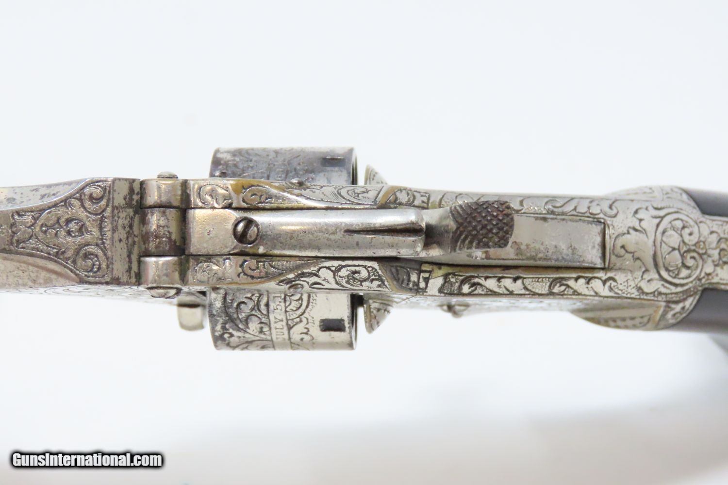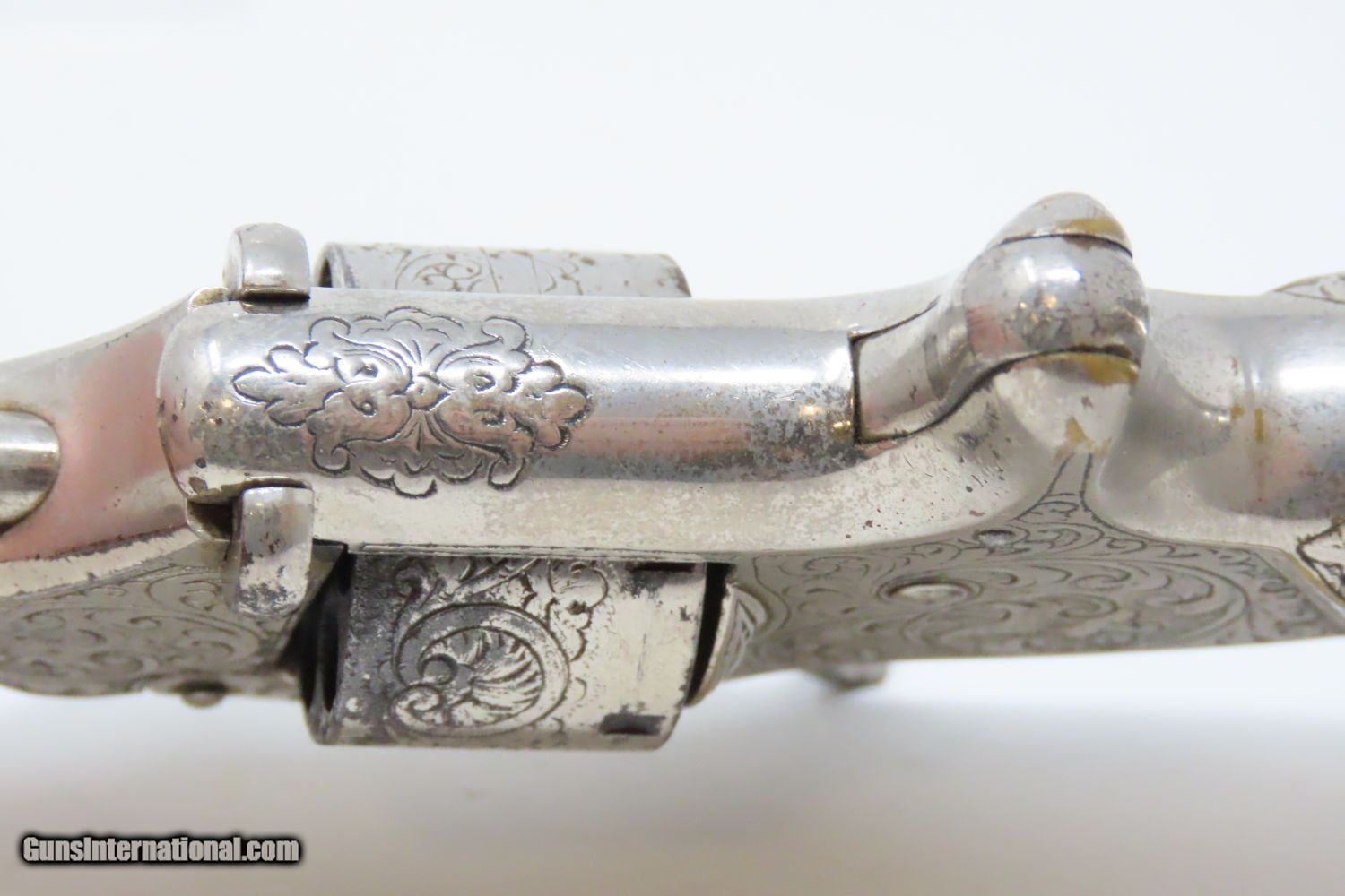 Description: 1860s ENGRAVED, PLATED SMITH & WESSON No. 1 7-Shot .22 S&W REVOLVER Antique S&W’s Flagship Revolver Design! Here we present an Engraved Smith & Wesson Model No. 1, Second Issue Revolver, manufactured circa 1860 to 1868 in Springfield, Massachusetts. Smith & Wesson manufactured approximately 115,000 of these revolvers between 1860 and 1868. Serial numbers started around 11000 where the 1st Issue left off and continued to 126400. The No. 1 was Smith & Wesson’s first metallic cartridge firearm. It utilized the idea of the “bored through cylinder”, which was patented by Rollin White and subsequently exclusively licensed by Smith & Wesson. This concept has forever changed revolving firearms design, and is the same idea used in revolvers today. S&W, via Rollin White himself, aggressively sued any patent infringers and were able to hold their monopoly on the American market for cartridge revolvers from about 1857 to 1870, whereupon their patent expired. The results were a very profitable business, a broke Rollin White, and a grudging U.S. Chief of Ordnance Alexander Dyer, who was still angry in 1870 about not being able to use the technology during the Civil War. The U.S. government ended up giving Colt their contracts since they valued the larger .44 caliber in the Colt 1860 Armies over the .32 caliber full sized No. 2 Armies. This small revolver is a 7-shot .22 rimfire. It was specifically designed to be a pocket gun, being very small and light. The No. 1 was the precursor to larger firearms that were simply scaled up to be more suitable for use as martial weapons. This one features period engraving that we believe is not factory commissioned. Three main monster heads appear on each side of the frame and on the right side of the barrel, surrounded by Germanic scroll engraving with a punch-dot background. Nickel plated over all. The overall condition is near fine. Bright nickel finish. The action is strong. The bore is in good shape. Both rosewood grips are in very nice shape with minimal wear. This is a very handsome piece of history from Smith & Wesson! Own the original! This is a legitimate antique and not a reproduction. Barrel is 3-3/16 inches. Caliber: .22 Rimfire (short, black powder) Overall condition as seen in photos. Very Fast. Very Safe. FREE SHIPPING WORLDWIDE. Delivered directly to your door by express mail! Guaranteed AUTHENTIC & Includes CERTIFICATE OF AUTHENTICITY. ancestryguns $1635 #210572 SOLD Antique: Yes |