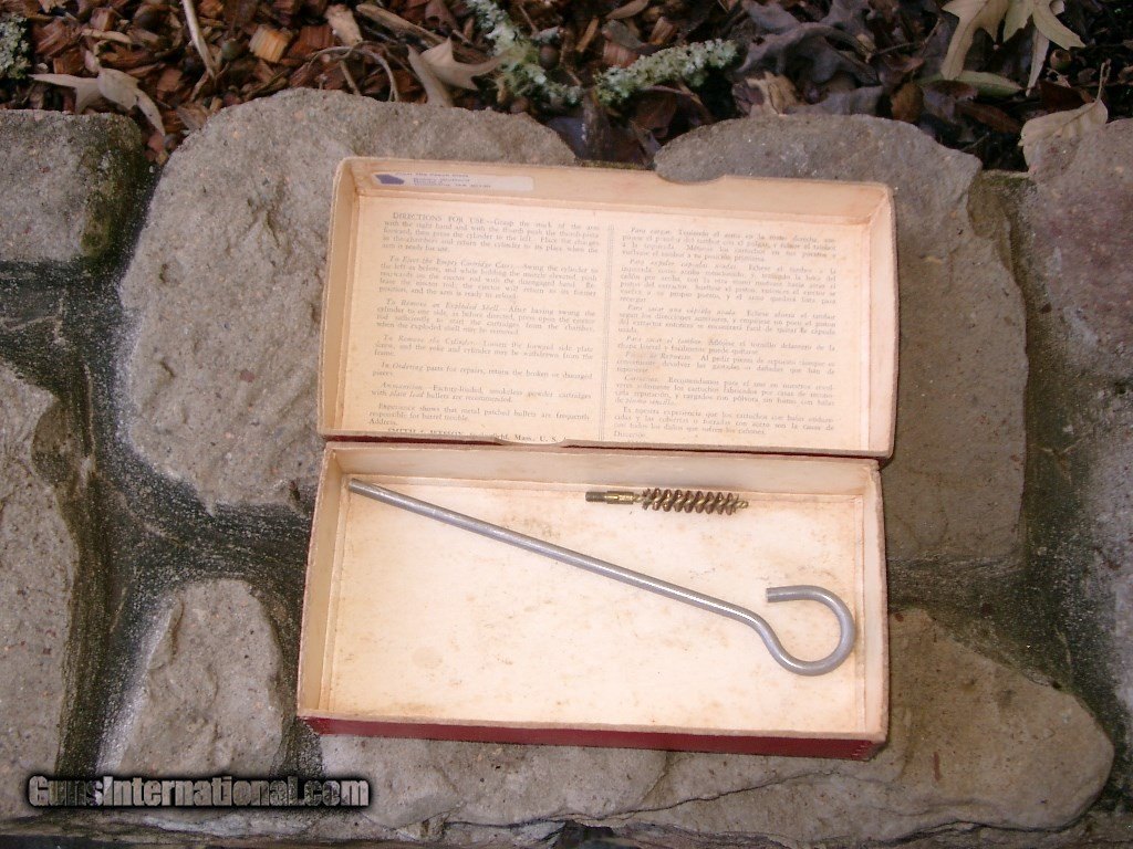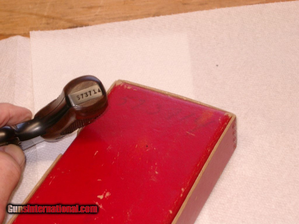 Description: SN 5753714. Caliber .32 S&W Long , I frame Round Butt, 5 screw, 2" barrel introduced 1949. Correct Red Box numbered to the gun. Blue is 100% with some light corrosion freckles visible, they are there, but not horrible, 100% case, 100% correct diamond grips. Box is 98% with original cleaning rod & brush. Great RARE gun in exceptional condition. Buyer pays $13 Priority Mail shipping to your FFL. Out of my personal collection. PLEASE CONTACT ME VIA EMAIL AS I AM VERY HARD OF HEARING. nick.gunsitegmail SOLD Handgun Caliber: .32 S&W Long (.32 Colt New Police) Manufacturer: Smith & Wesson Model: .32 Hand Ejector Pre Model 30 Serial Number: 5753714 Barrel Length: 2 Condition: Minty Manufacture Date: 1949-1951 |
