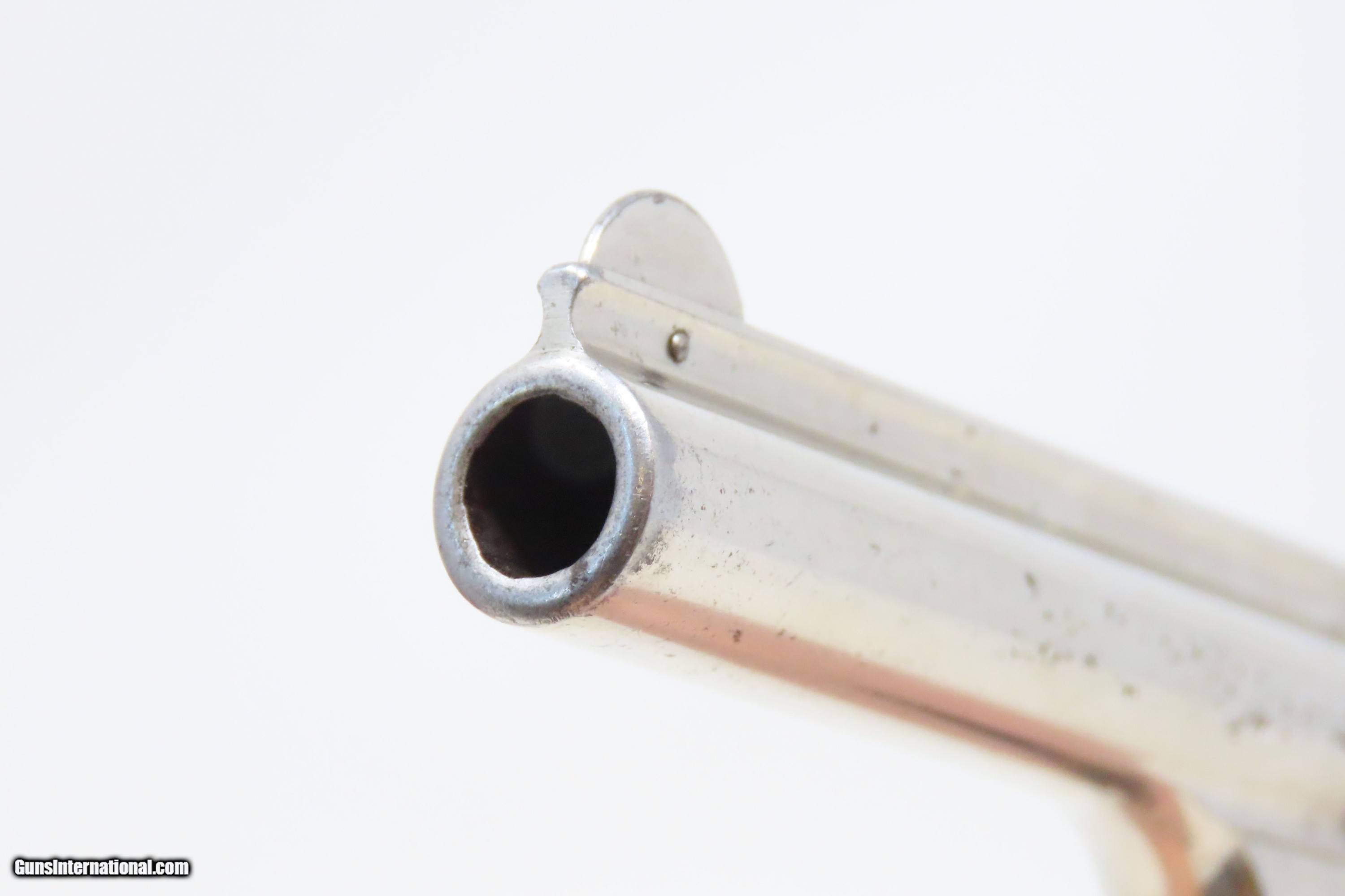 Description: Nickel Plated w/ FACTORY BOX Smith & Wesson .32 DA Revolver C&R PEARL GRIP TURN OF THE CENTURY Self Defense Revolver Here we present a C&R 4th Model Smith & Wesson .32 Double Action Revolver, made circa the early 1900s in Springfield, Massachusetts. The Smith & Wesson Fourth Models were produced between 1883 and 1909 with a total production of approximately 239,600 examples. As mentioned above, this revolver was chambered for the .32 S&W cartridge and was usually equipped with a 3” or 3-1/2” barrel. They were fitted with a 5-shot fluted cylinder and were either blue finished or nickel plated. They came with a top break design and round butt. The serial number ranged from 43406 to 282999. This model was quite similar in appearance to the Third Model, except the trigger guard is oval shaped instead of squared back as in the previous models. These were petite and handy little guns that chambered 5 cartridges, perfect for the pocket and enough to get out of most scrapes. With gangsters, and career criminals running rampant, this example would have been the “pocket advantage” a person needed. The overall condition is good. Original finish. The action functions, although the cylinder does not lock up. Bright, rifled bore. Markings are legible. Numbers match. Both pearl grips are vibrant and remain in very good shape. The included box is good, and period correct, but is for a .38 New Departure. This firearm is classified as a Curio & Relic. Barrel is 3-1/2 inches. Caliber: .32 S&W Overall condition as seen in photos. Very Fast. Very Safe. FREE SHIPPING. Will need to be sent to your local FFL or C&R licensee. This firearm is classified as a Curio & Relic. Guaranteed AUTHENTIC & Includes CERTIFICATE OF AUTHENTICITY. ancestryguns $1400 #233483 SOLD Curio/Relic: Yes |