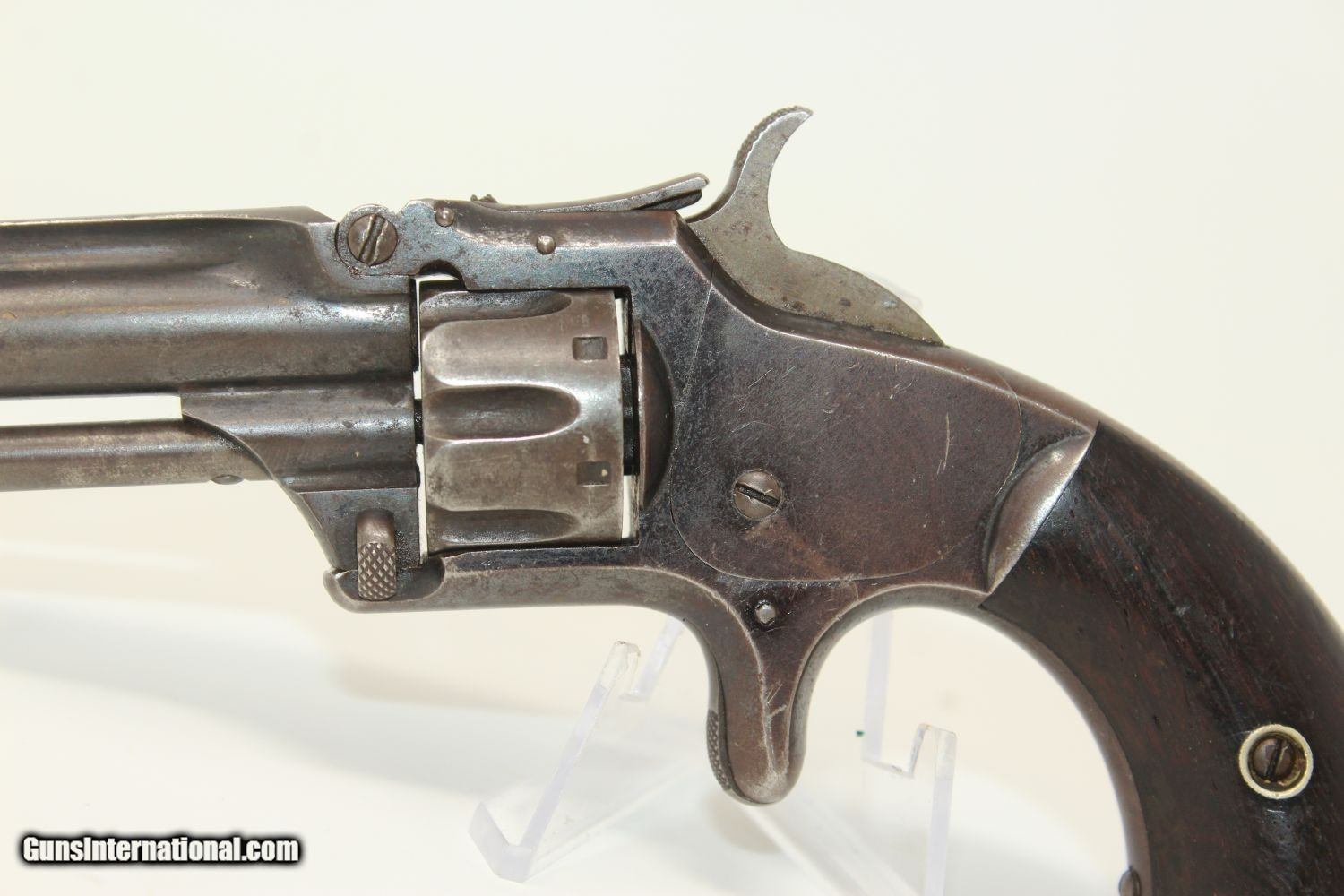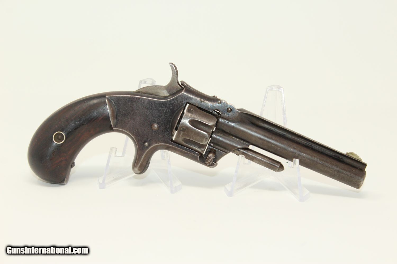Description: OLD WEST Antique SMITH & WESSON No. 1 .22 Revolver 19th Century POCKET CARRY for the Armed Citizen Here we present an antique Smith & Wesson Number 1, Third Issue Revolver, made circa 1868-81. The No. 1 was Smith & Wesson’s first metallic cartridge firearm. It utilized the idea of the “bored through cylinder”, which was patented by Rollin White and subsequently exclusively licensed by Smith & Wesson. This concept has forever changed revolving firearms design, and is the same idea used in revolvers today. S&W, via Rollin White himself, aggressively sued any patent infringers and were able to hold their monopoly on the American market for cartridge revolvers from about 1857 to 1870, whereupon their patent expired. The results were a very profitable business, a broke Rollin White, and a grudging U.S. Chief of Ordnance Alexander Dyer, who was still angry in 1870 about not being able to use the technology during the Civil War. The U.S. government ended up giving Colt their contracts since they valued the larger .44 caliber in the Colt 1860 Armies over the .32 caliber full sized No. 2 Armies. The Third Issue was S&W’s final improved version of the revolver. The rounded birds head grips, fluted cylinder and round barrel made this an even sleeker variant of the revolver that started it all. This small revolver is a 7-shot .22 rimfire. It was specifically designed to be a pocket gun, being very small and light. For those not wanting or needing a full-sized gun or for those who wanted a backup this revolver was the ideal firearm for the turbulent 19th century. The overall condition is very good. 60% of the original blue finish remains. Clear markings. The rosewood grips are in good condition. The bore is fair. The action is strong. The cylinder stop is weak so the cylinder does not lock up. Own the original! This is a legitimate antique and not a reproduction. Barrel is 3-3/16 inches. Caliber: .22 Rimfire Overall condition as seen in photos. Very Fast. Very Safe. FREE SHIPPING WORLDWIDE. Delivered directly to your door by express mail! Guaranteed AUTHENTIC & Includes CERTIFICATE OF AUTHENTICITY. ancestryguns $750 #190495 SOLD Antique: Yes |