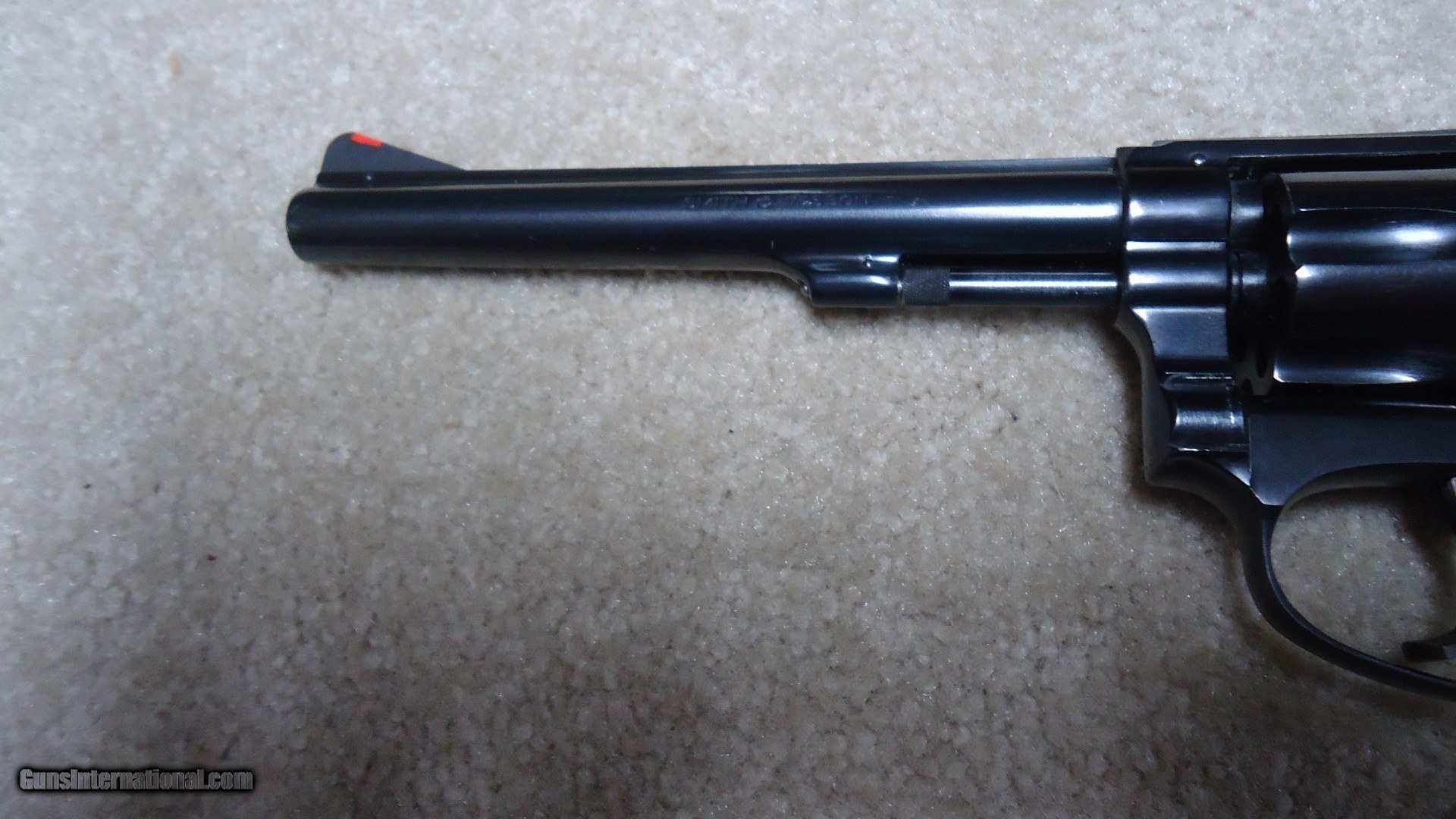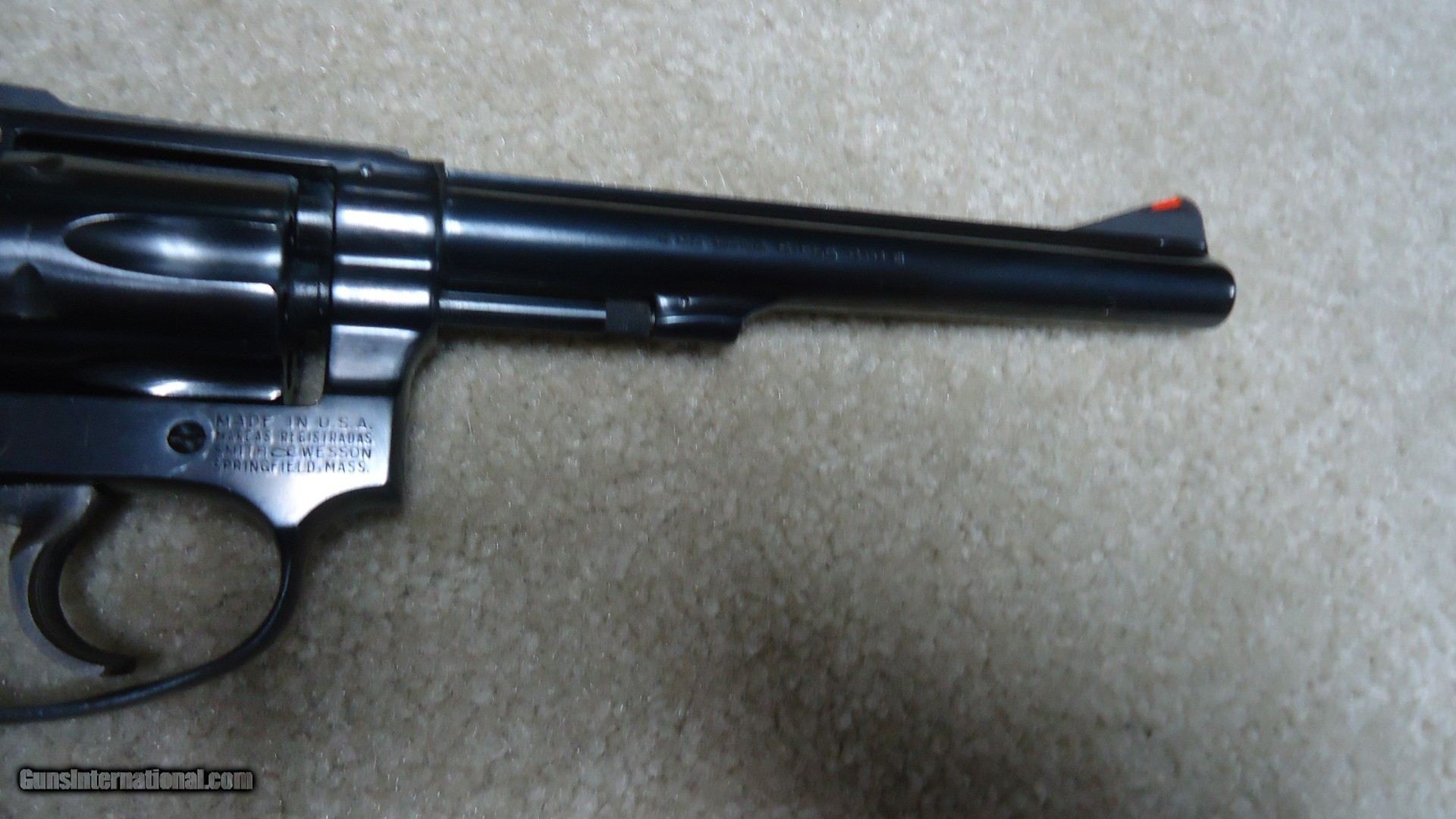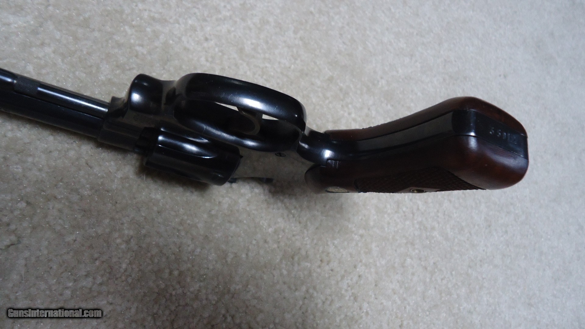 Description: PRE-MODEL 35, 6" .22LR "KIT GUN" #35912, MADE ABOUT 1953. this is another mystery gun that I can't quite figure out. the number on the frame matches the number on the early style diamond checkered grips and the assembly number on the crane matches the number on the grip strap under the grips. However, the barrel with red ramp front sight appears to be of a later style and is not serial numbered and the cylinder has no serial number. The overall revolver is in about new condition and shows no sign of being worked on or refinished in any way. Opening the cylinder, the frame that in later guns has the model designation stamping shows the letter "M" with a "5" with a circle around it. Seems to me that if someone damaged the barrel and sent it back to the factory at a later date for replacement, there would be a date stamped on the frame under the grips PLUS why would the cylinder need replacing? Again, even if someone wanted to turn a standard 4" Kit Gun (M-34) into a 6" (M-35) why swap cylinders? A Smith & Wesson letter might prove interesting on this one. Regardless, it is in like new condition with correct flat latch etc. Only a student of S&W would even question the aspects mentioned. (note: any flaws in the blue is just oil and light reflection) SOLD Curio/Relic: Yes Handgun Caliber: .22 Long Rifle Manufacturer: SMITH & WESSON Model: PRE-35 Serial Number: 35XXX Barrel Length: 6 Condition: NEAR NEW |