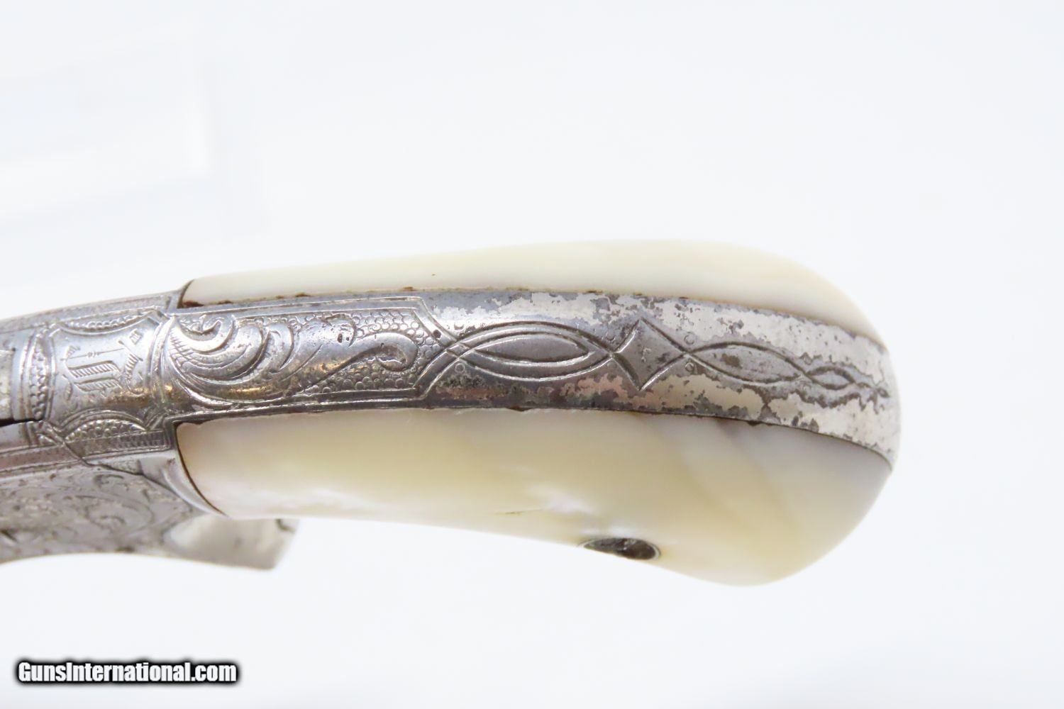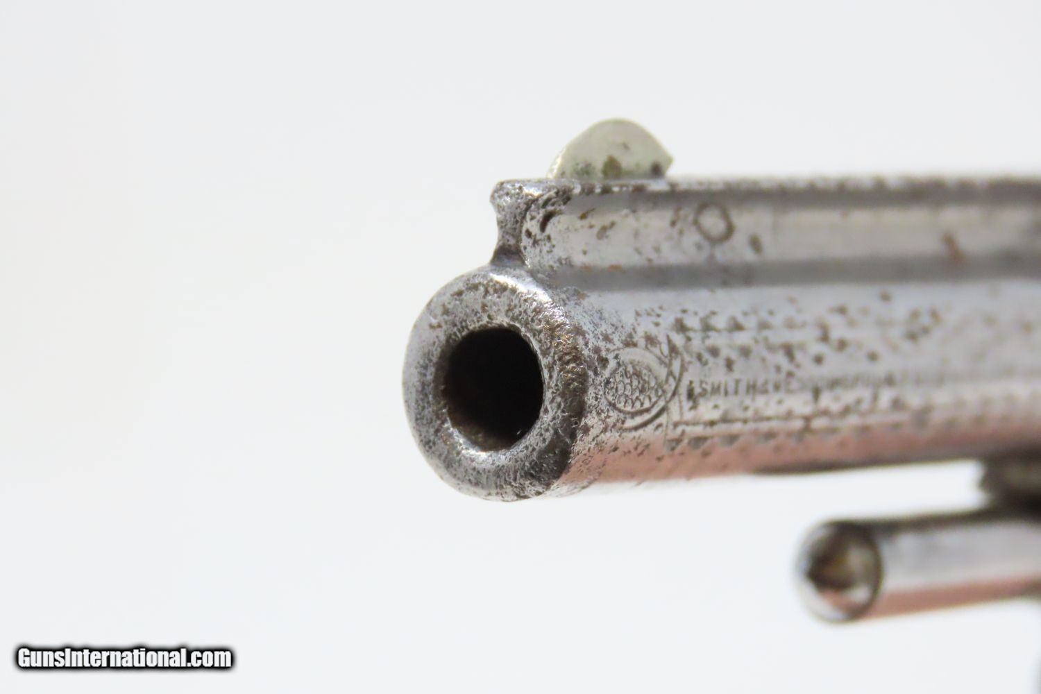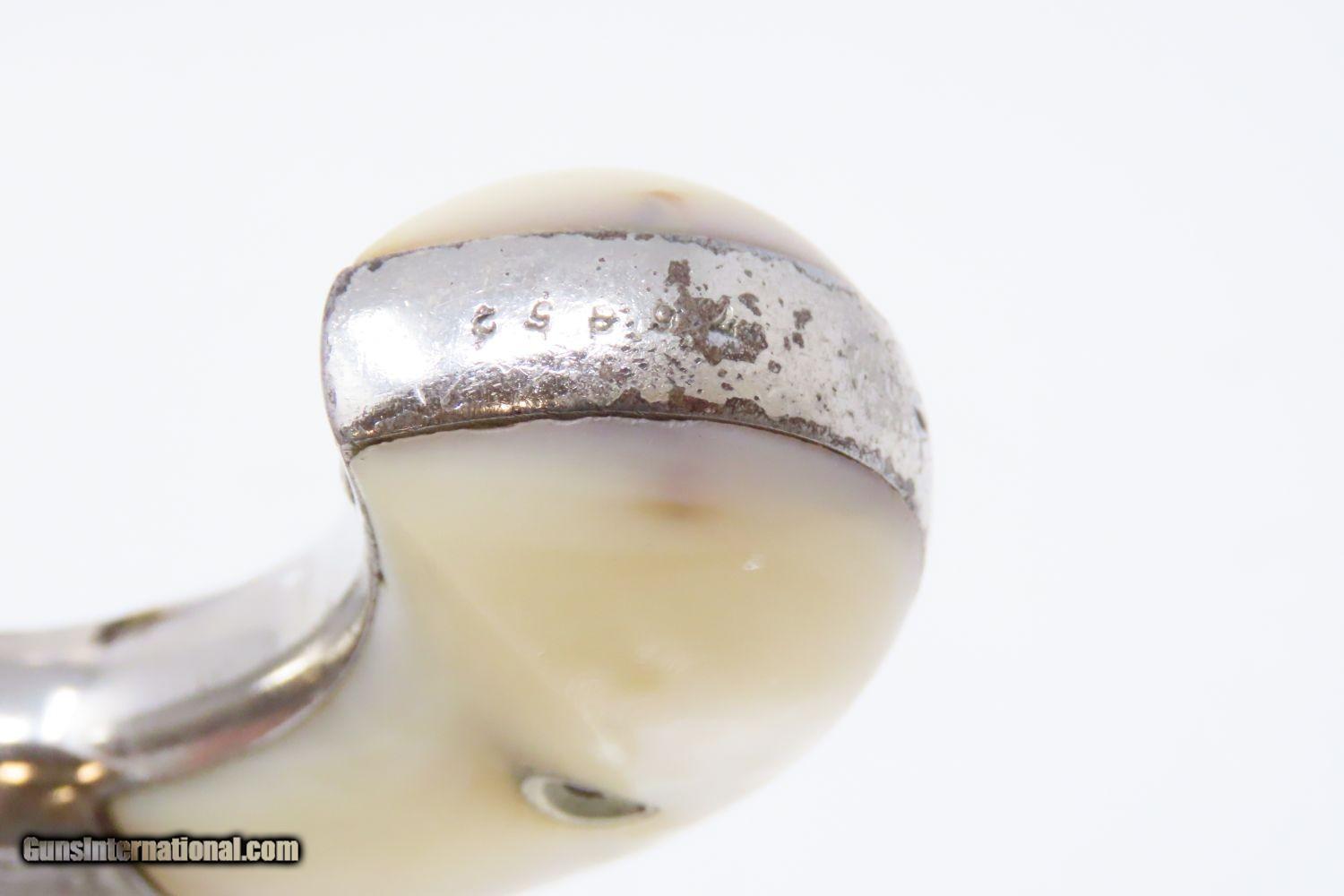 Description: Rare Short-Barreled ENGRAVED Nickel PEARL 1870s SMITH & WESSON No1 Revolver Very Handsome 7-Shot S&W in .22! Here we present an antique Factory Engraved Smith & Wesson Number 1, Third Issue Revolver in .22, made circa 1868-81. The No. 1 was Smith & Wesson’s first metallic cartridge firearm. It was designed to hold 7 shots of .22 rimfire (short; black powder), and would have made a great pocket sidearm. This one features the rare 2-11/16 inch barrel with the barrel address on the left side rather than on top. It is finished in nickel with solid mother-of-pearl grips. The overall condition is very good. The action is strong. The bore is in good shape for age. Both of the mother-of-pearl grips are in good shape with expected wear with a vibrant color. Deep traditional floral designs engraved on the frame, backstrap, and barrel. A jewel of a pocket gun by S&W! Own the original! This is a legitimate antique and not a reproduction. Barrel is 2 11/16 inches. Caliber: .22 Rimfire Overall condition as seen in photos. Very Fast. Very Safe. FREE SHIPPING WORLDWIDE. Delivered directly to your door by express mail! Guaranteed AUTHENTIC & Includes CERTIFICATE OF AUTHENTICITY. ancestryguns $1625 #210580 SOLD Antique: Yes |