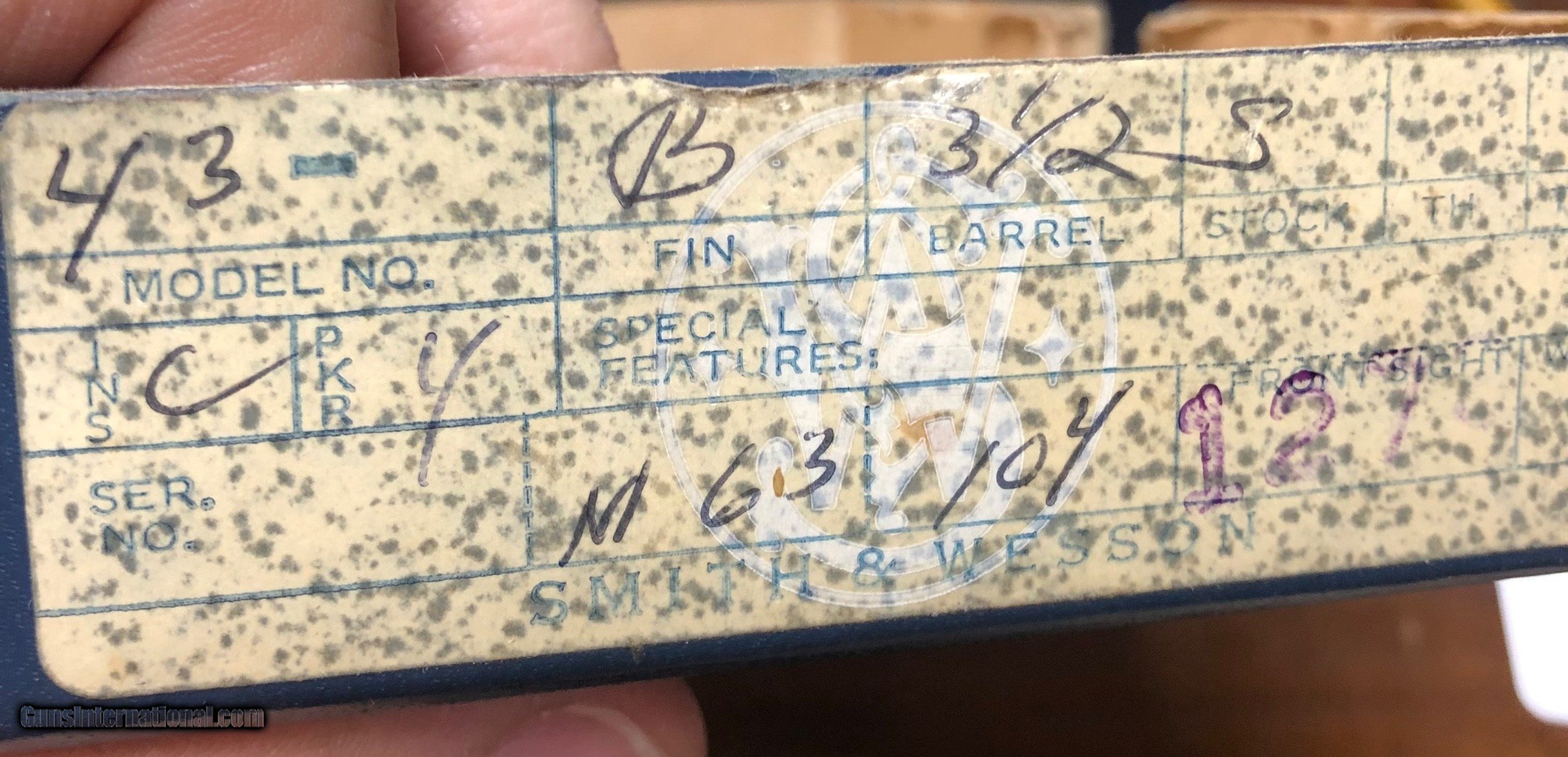 Description: I love the 43!! This 22 lr features 3 1/2 inch pinned barrel, recessed alloy cylinder, blue alloy frame, target sights, and service square butt grips. Original numbered box, tools, and paper. Absolutely gorgeous gun! Please email with questions. Shipping included (west coast add $75). Cards add 3% SOLD Manufacturer: Smith and Wesson Model: 43 Barrel Length: 3.5 in Condition: LNIB Metal Condition: Excellent Wood Condition: Excellent Bore Condition: Excellent Action: Da, sa Finish: Blue Sights: Target Case: Yes Item Location: 37075 |