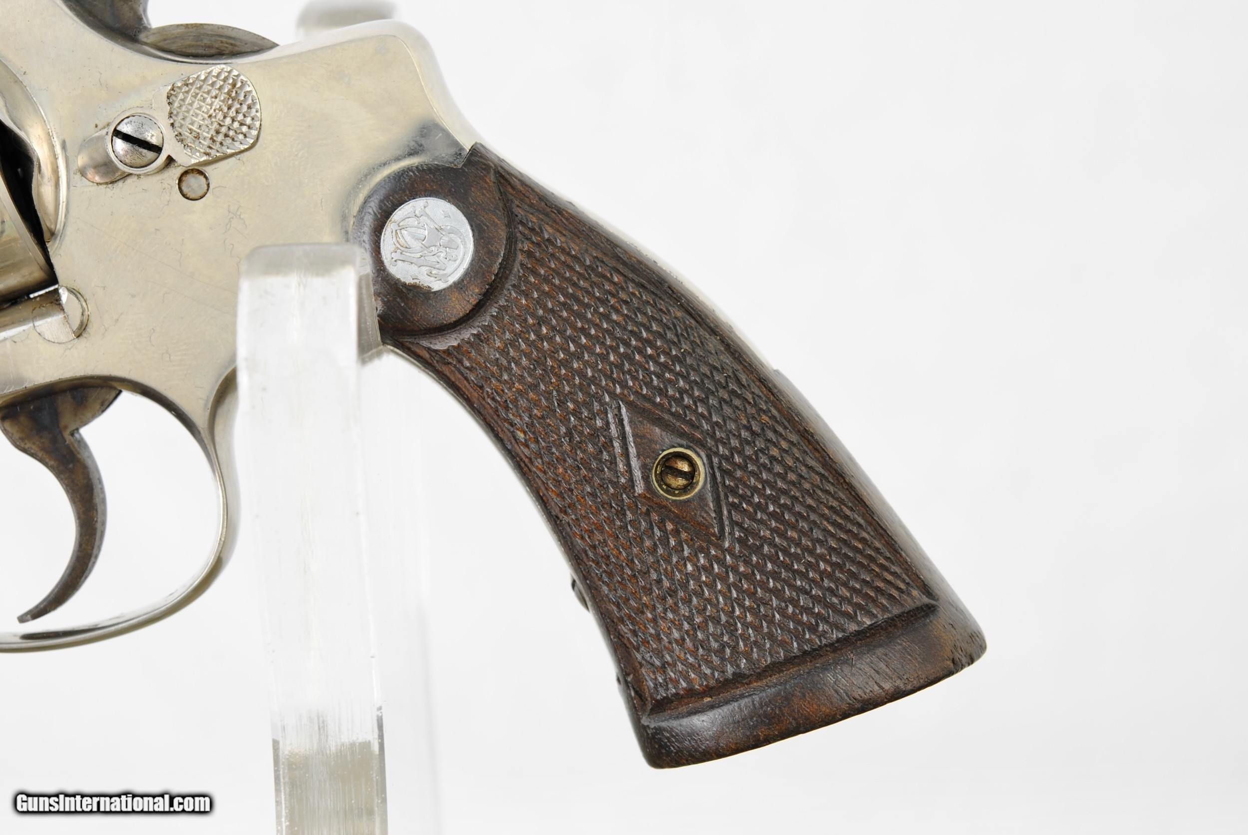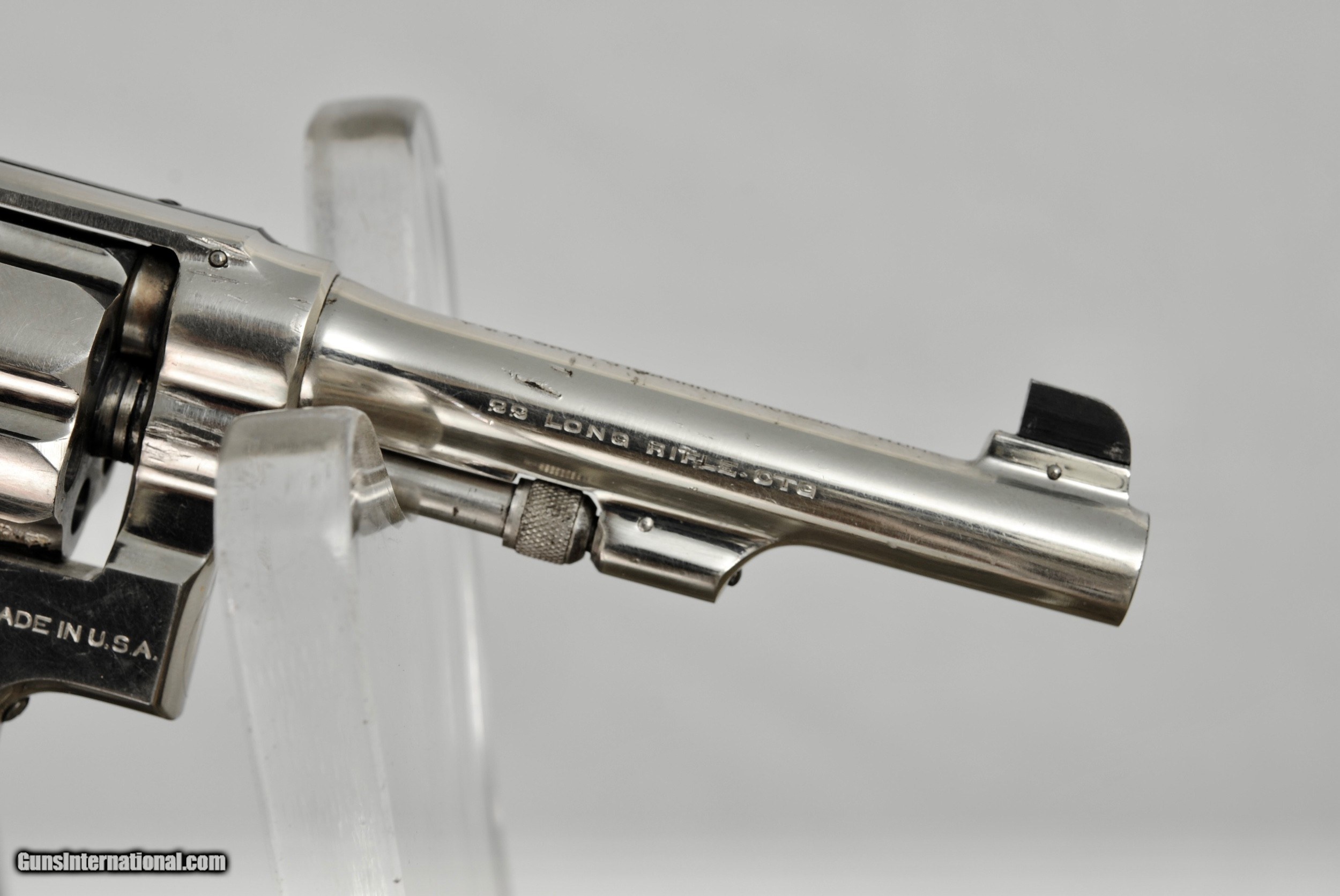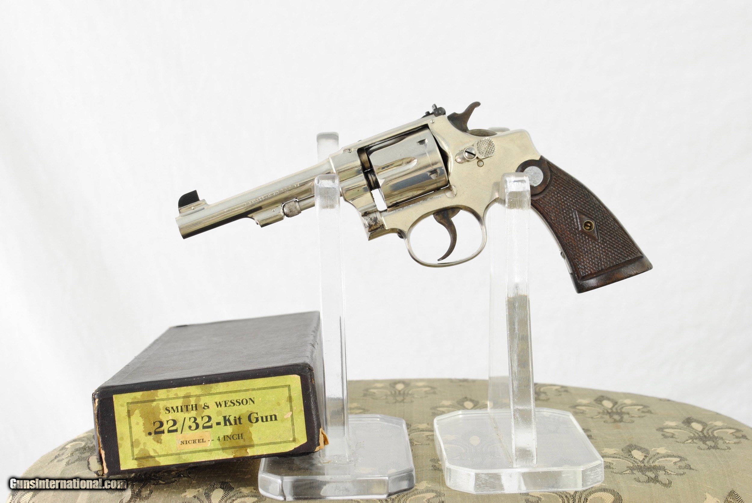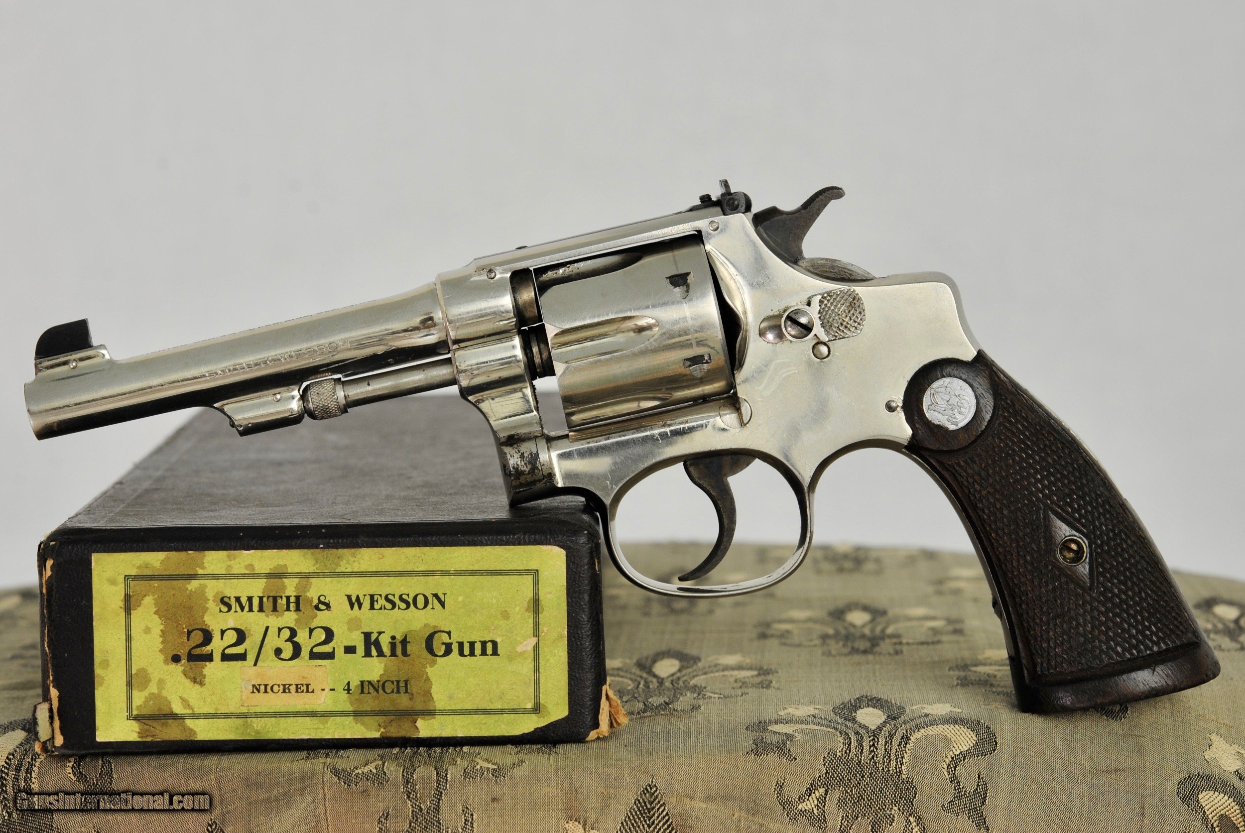 Description: Extremely rare Smith & Wesson nickel plated kit gun in 22 LR made in 1940. Original box in good condition. Smith & Wesson Historical Foundation Letter included. Nickel plating has a few areas of flaking on the crane, barrel, cylinder and under the grips. Barrel is 4". Excellent timing and lockup. Excellent bore. Diamond round butt grips. The Blue Book of Gun Values indicates that there are only three known pre-war nickel finish Kit Guns in existence. Express insured shipping $90. Credit cards are OK with no additional fee. SOLD Handgun Caliber: .22 Long Rifle |