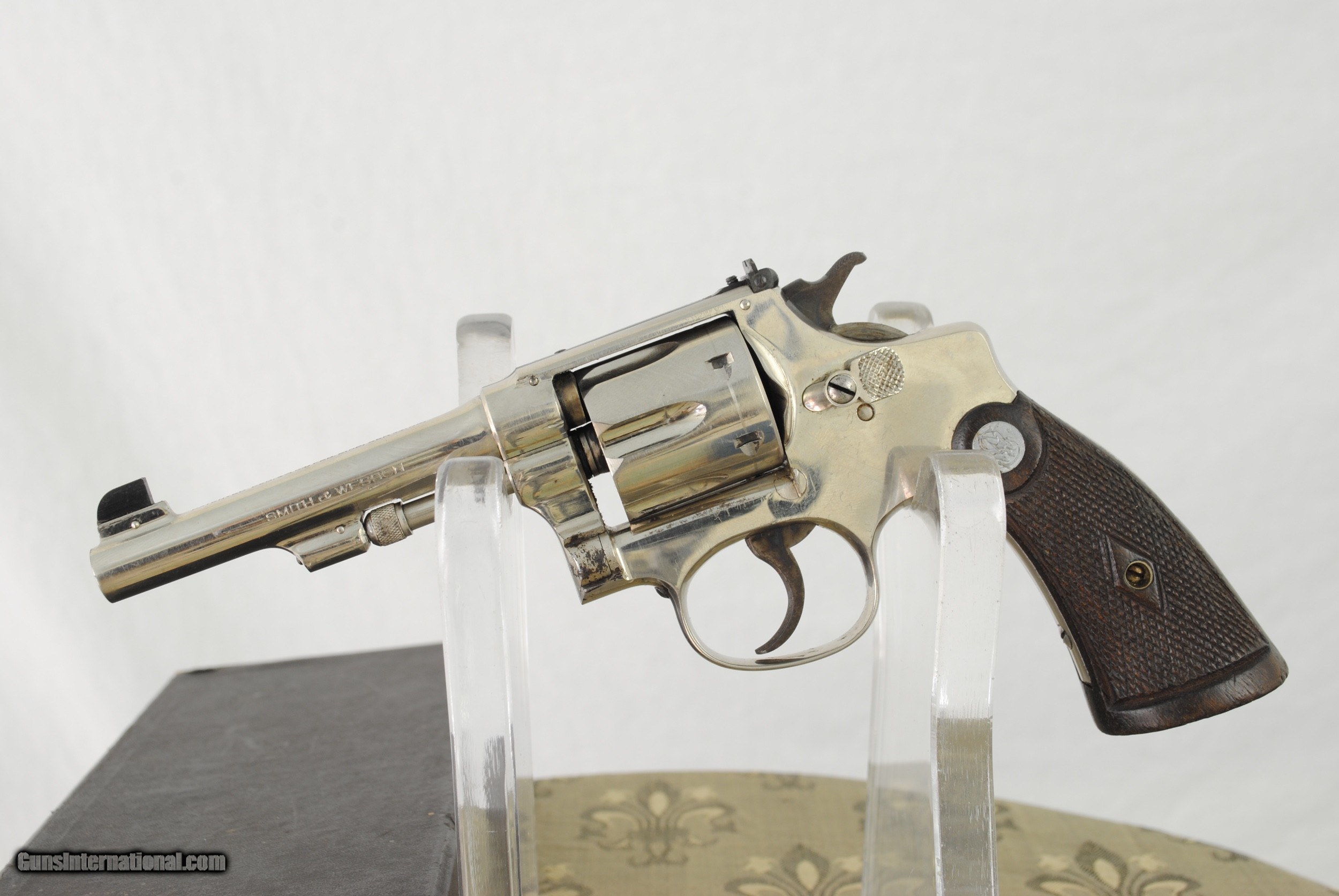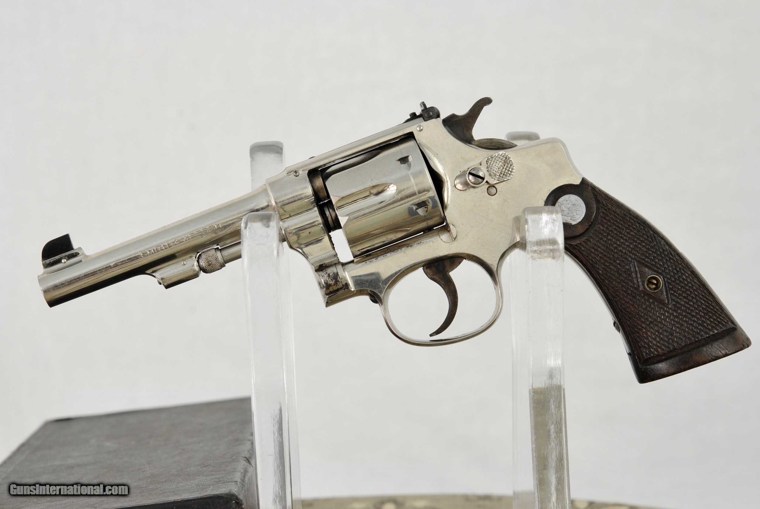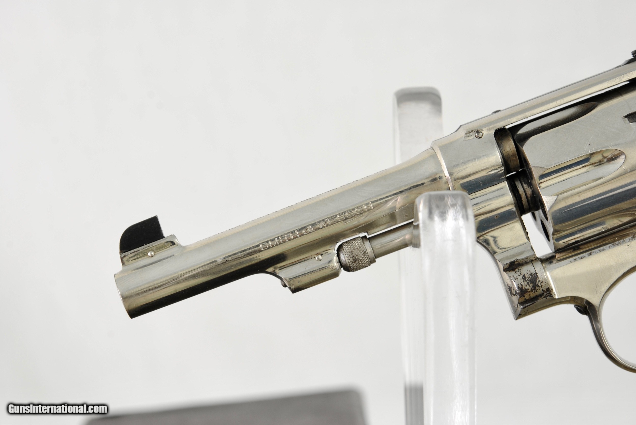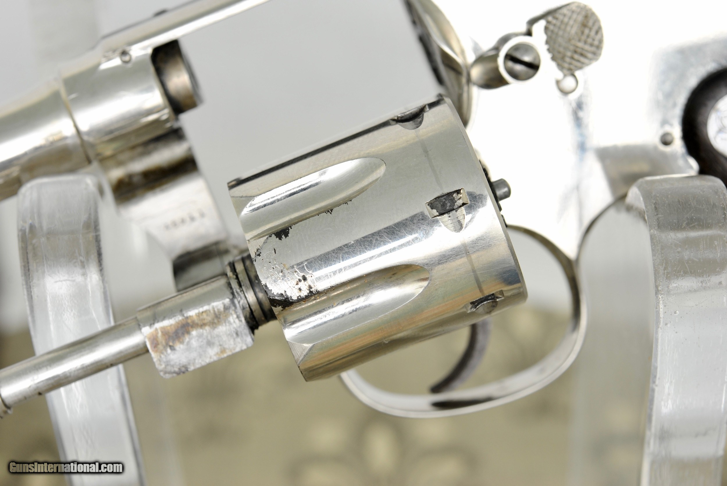 Description: Extremely rare Smith & Wesson nickel plated kit gun in 22 LR made in 1940. Original box in good condition. Smith & Wesson Historical Foundation Letter included. Nickel plating has a few areas of flaking on the crane, barrel, cylinder and under the grips. Barrel is 4". Excellent timing and lockup. Excellent bore. Diamond round butt grips. The Blue Book of Gun Values indicates that there are only three known pre-war nickel finish Kit Guns in existence. Express insured shipping $90. Credit cards are OK with no additional fee. SOLD Handgun Caliber: .22 Long Rifle |