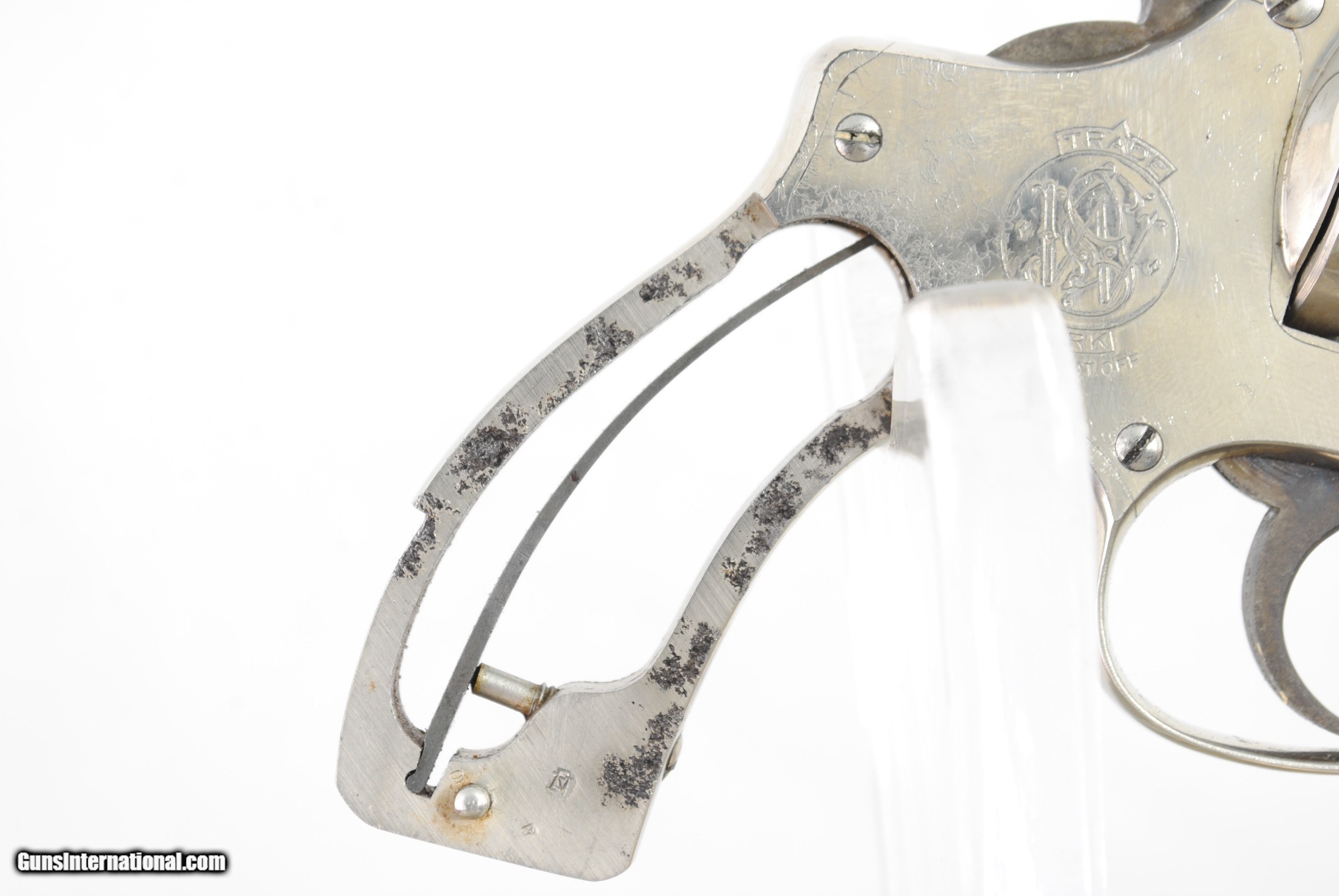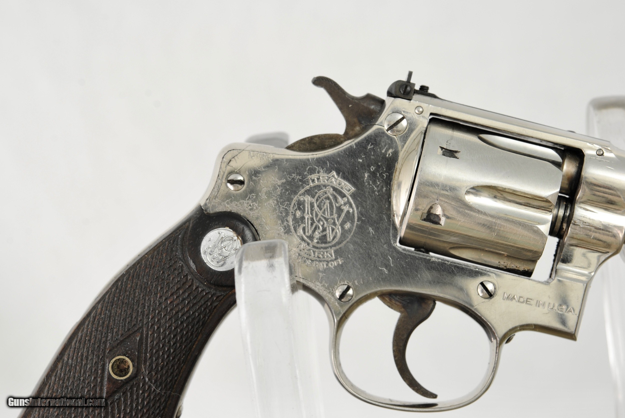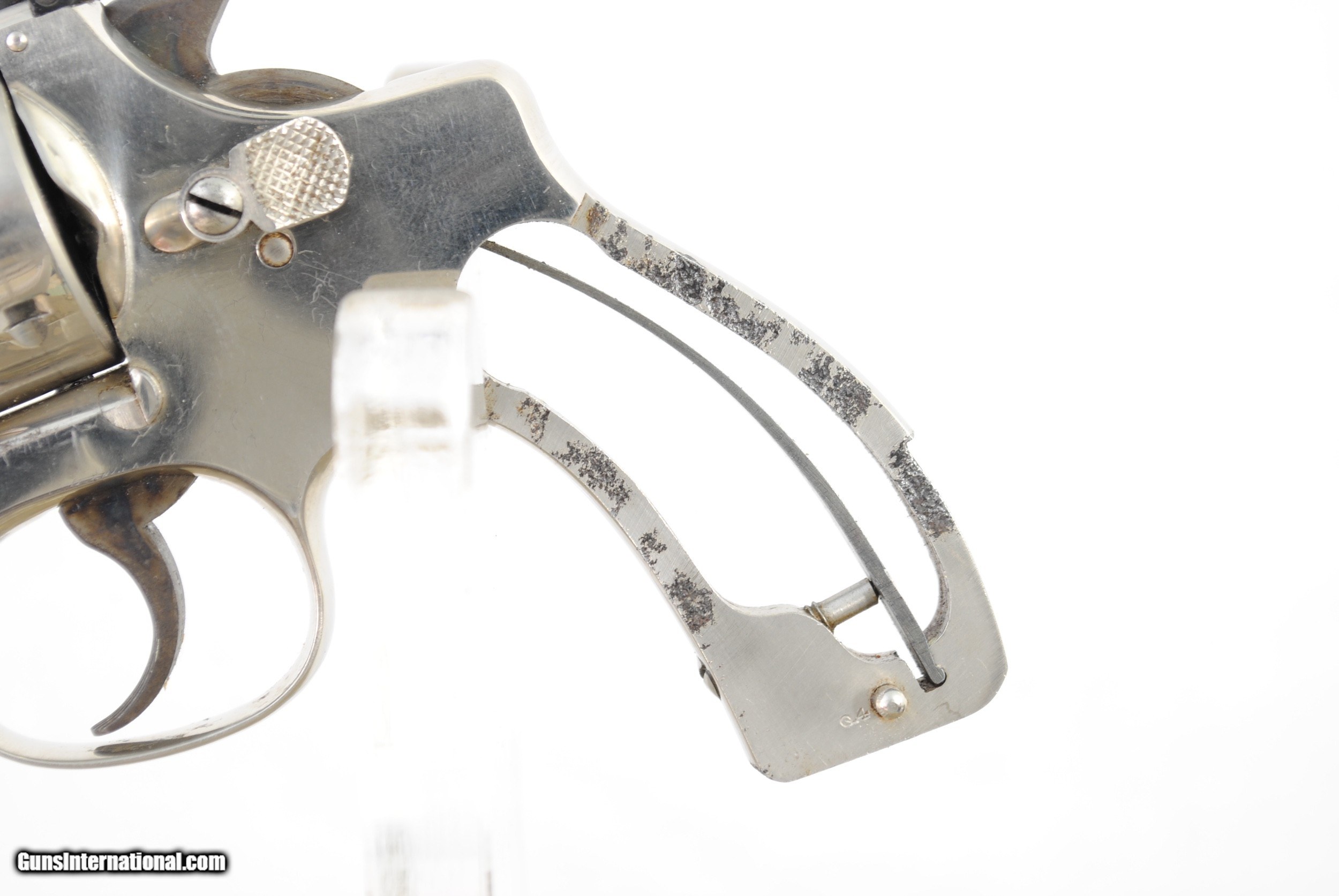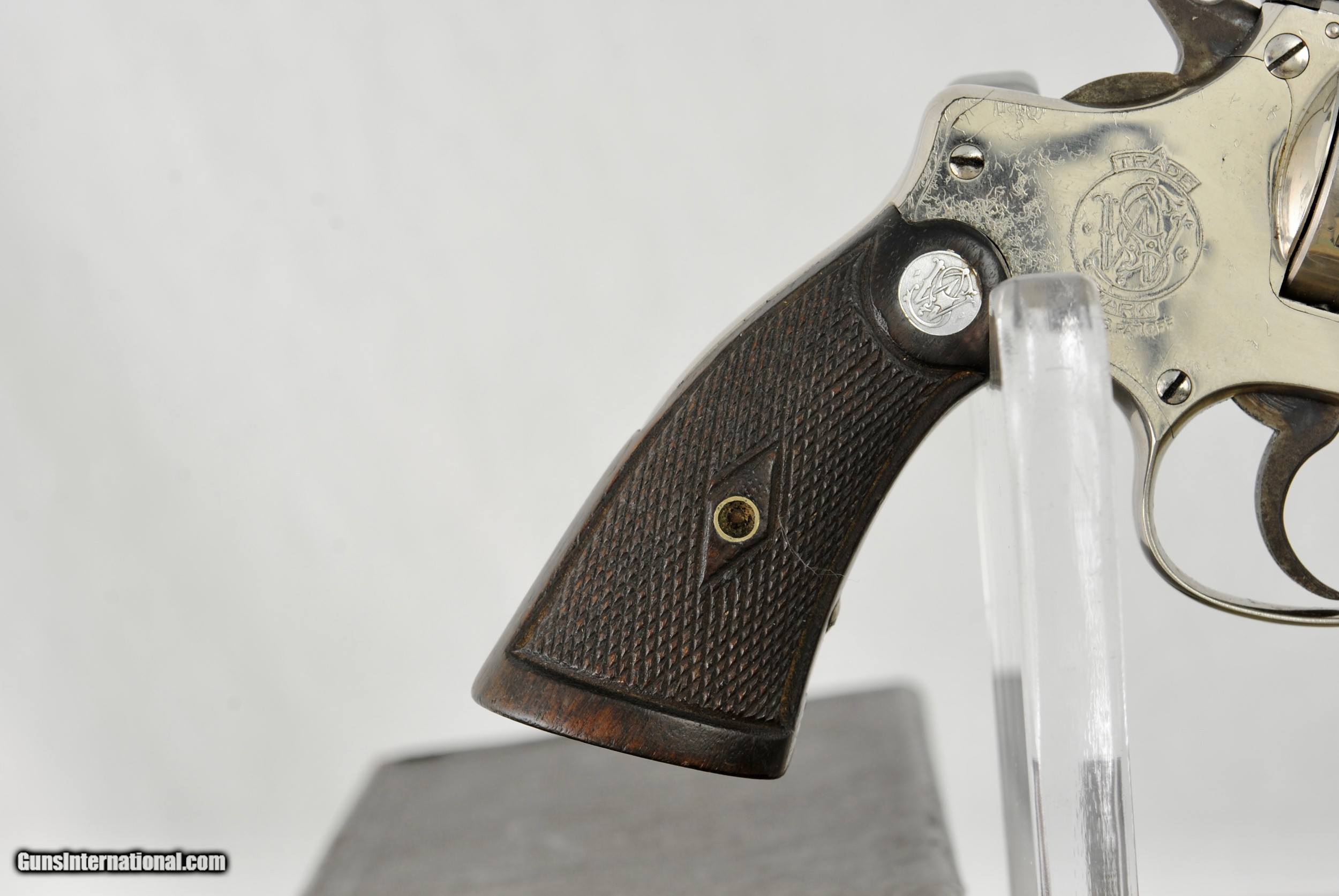 Description: Extremely rare Smith & Wesson nickel plated kit gun in 22 LR made in 1940. Original box in good condition. Smith & Wesson Historical Foundation Letter included. Nickel plating has a few areas of flaking on the crane, barrel, cylinder and under the grips. Barrel is 4". Excellent timing and lockup. Excellent bore. Diamond round butt grips. The Blue Book of Gun Values indicates that there are only three known pre-war nickel finish Kit Guns in existence. Express insured shipping $90. Credit cards are OK with no additional fee. SOLD Handgun Caliber: .22 Long Rifle |