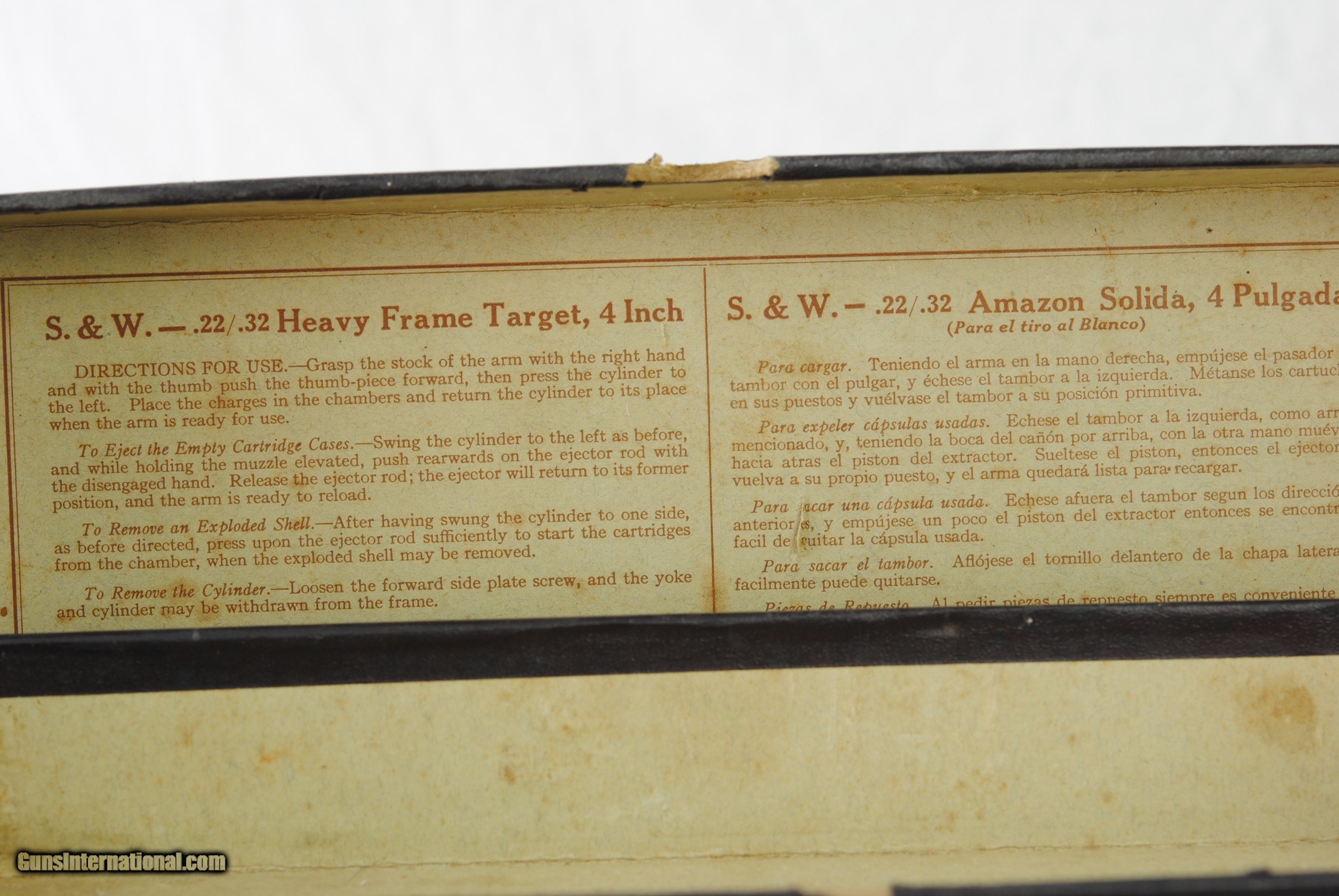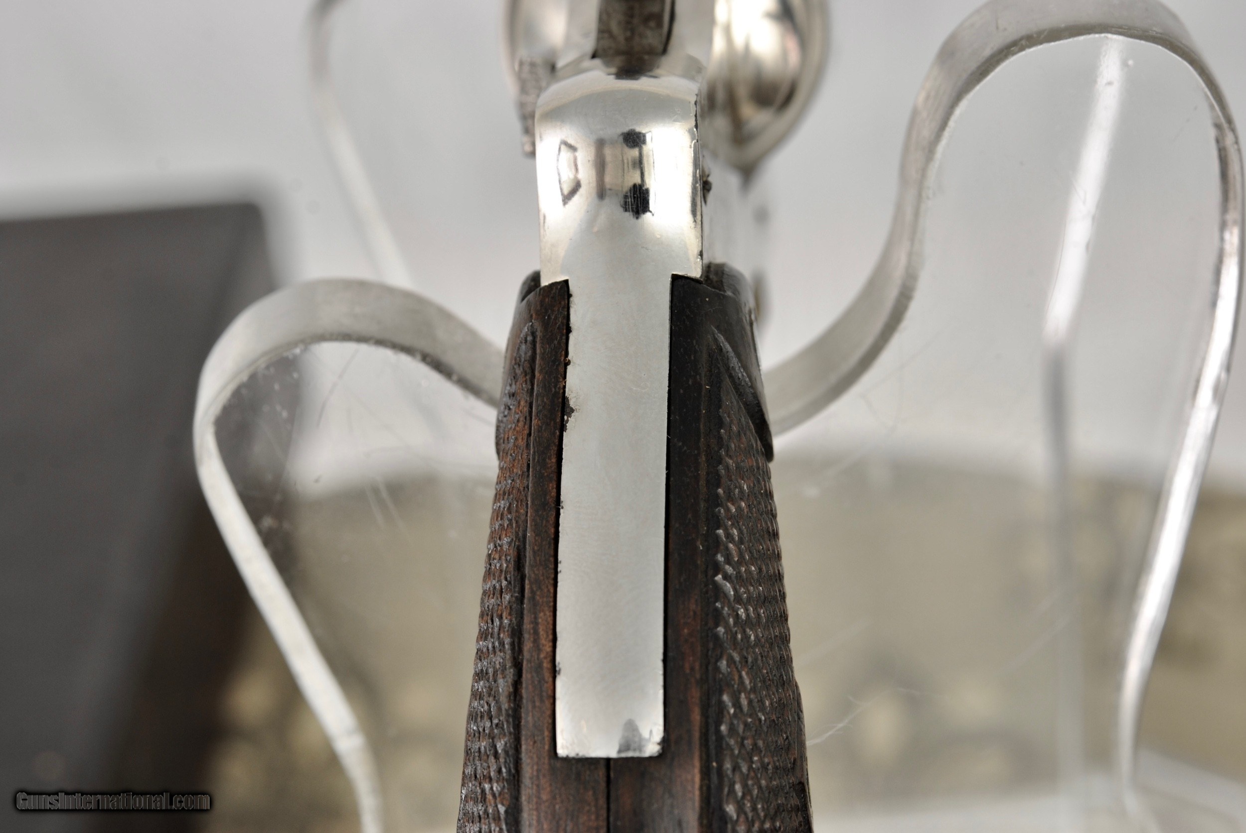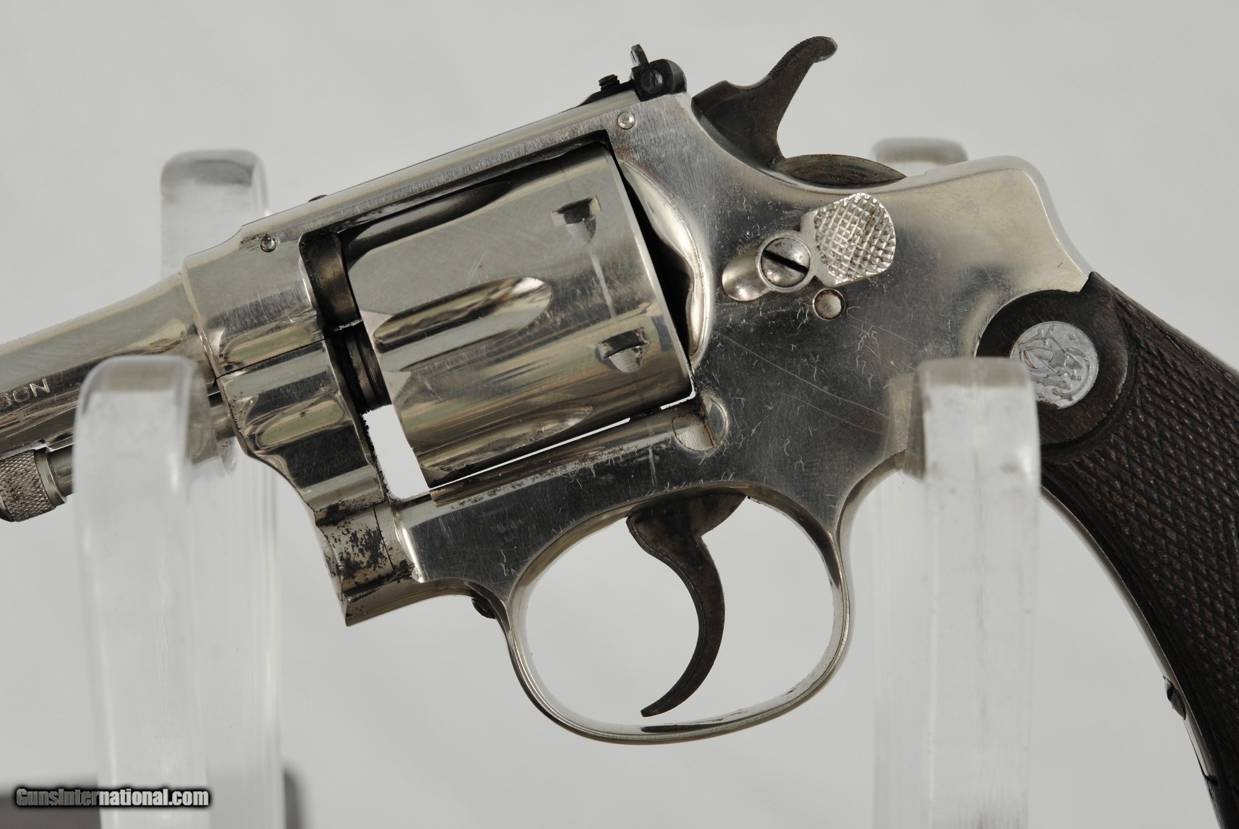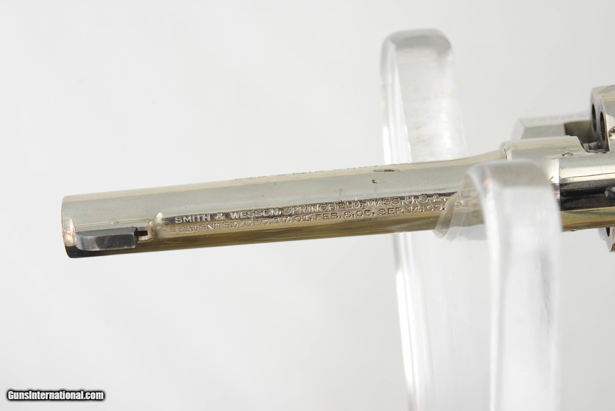 Description: Extremely rare Smith & Wesson nickel plated kit gun in 22 LR made in 1940. Original box in good condition. Smith & Wesson Historical Foundation Letter included. Nickel plating has a few areas of flaking on the crane, barrel, cylinder and under the grips. Barrel is 4". Excellent timing and lockup. Excellent bore. Diamond round butt grips. The Blue Book of Gun Values indicates that there are only three known pre-war nickel finish Kit Guns in existence. Express insured shipping $90. Credit cards are OK with no additional fee. SOLD Handgun Caliber: .22 Long Rifle |