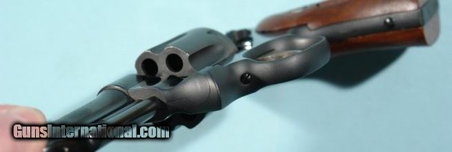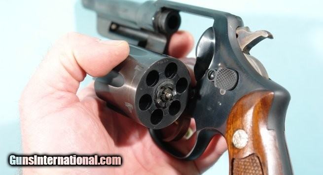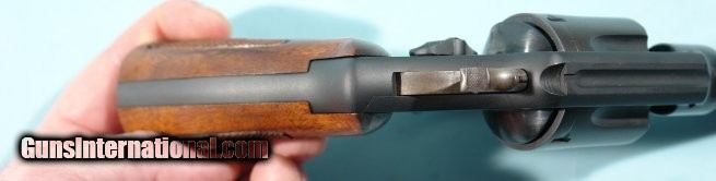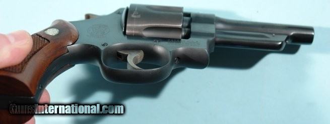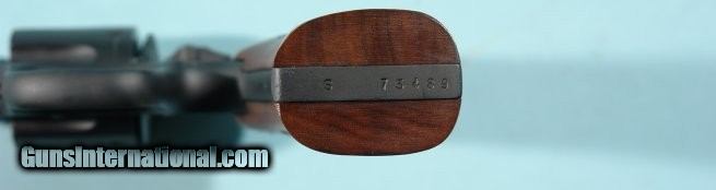 Description: 1949 SMITH & WESSON .38/44 HEAVY DUTY PRE MODEL 20 .38 SPECIAL 4" D.A. REVOLVER. Serial number "S73,XXX" and all matching including cylinder, butt, barrel and crane. Custom two tone finish professionally done with matte blue underside, backstrap, top strap and cylinder release latch. Barrel and sides both brilliant blue as well as cylinder but with flutes also matte finish. Very particular as to what customer wanted in this two tone finish. Mint bore, rilfing and chambers. Five screw frame with excellent screws. Case colors still on hammer and trigger. Later S&W medallion diamond grips numbered to another gun but period. Considered a transition model able to take higher than previously known pressure ammo in the .38 S&W special calibers. SOLD Curio/Relic: Yes |