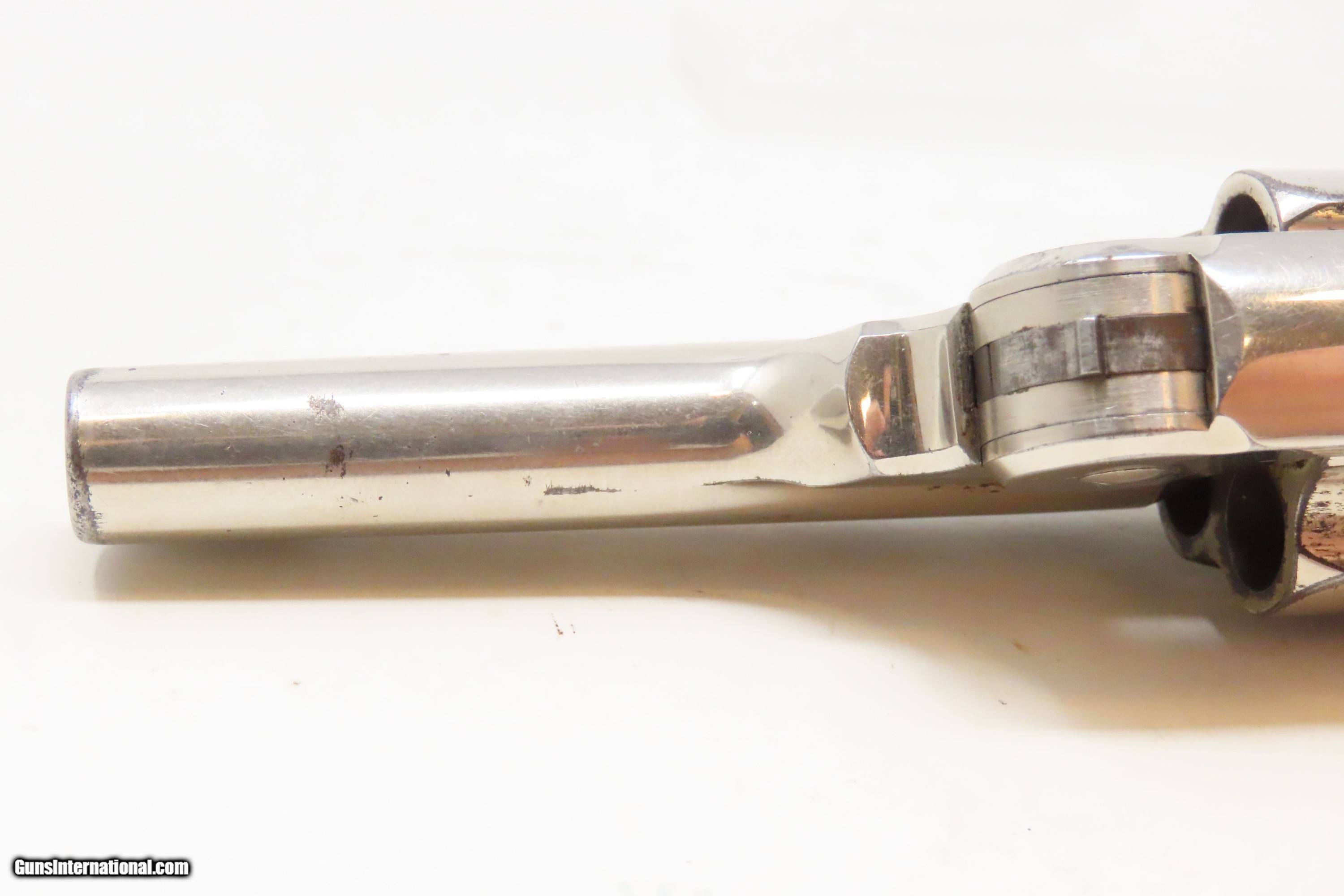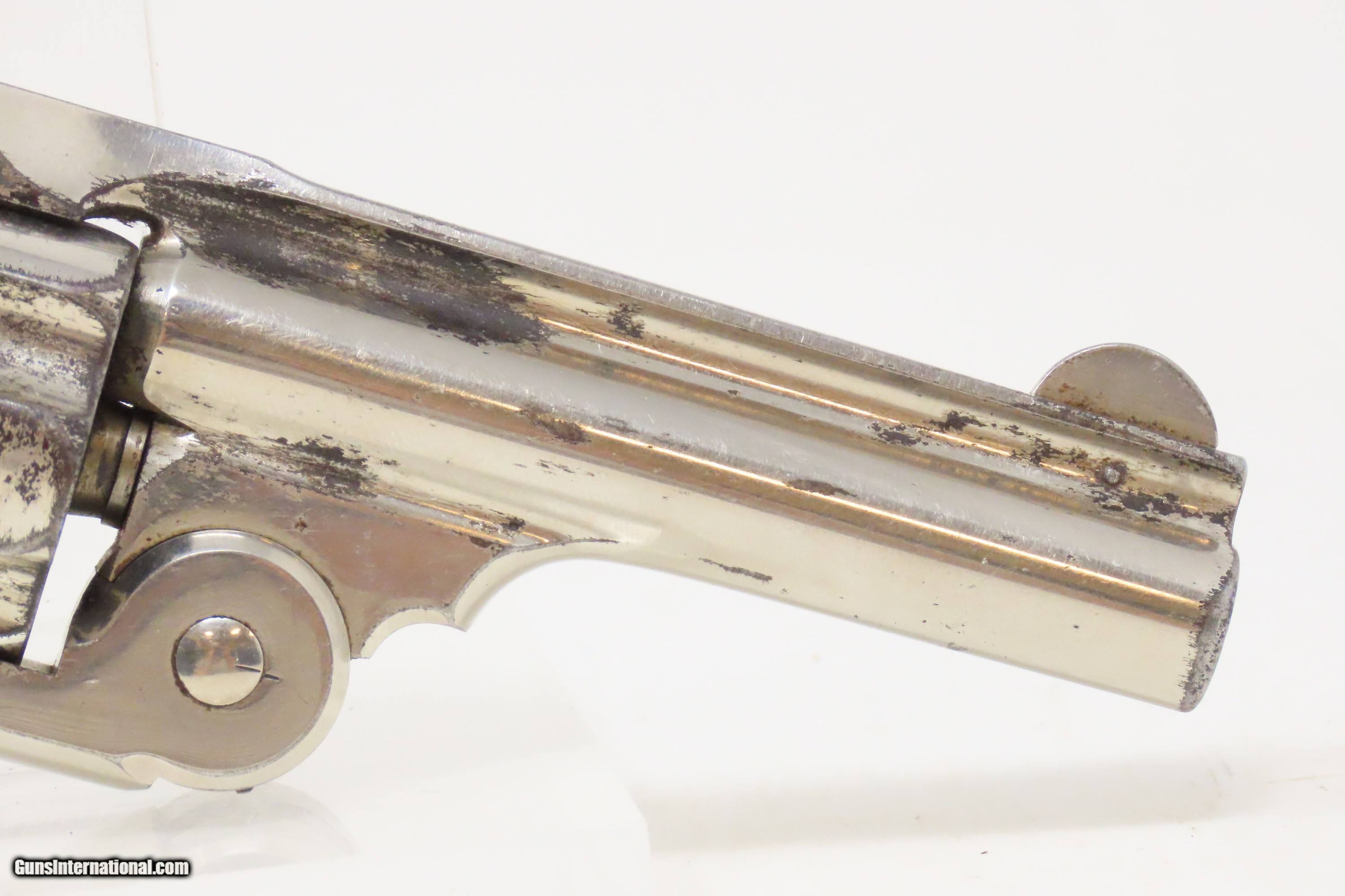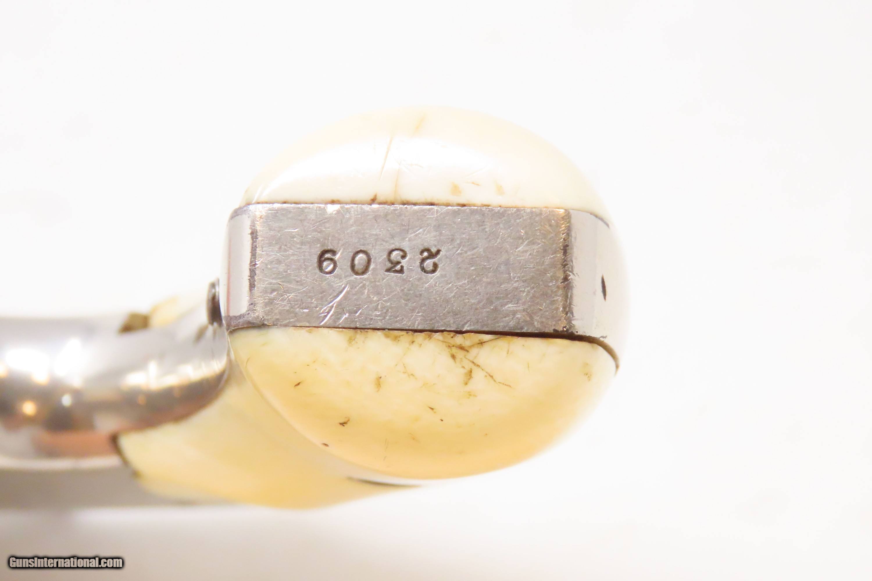 Description: FRONTIER Antique SMITH & WESSON .38 Single Action Revolver ANTIQUE IVORY Very Nice OLD WEST Hideout “BACK UP” Revolver Here we present an antique Smith & Wesson .38 Single Action Second Model Revolver, also referred to as the Model 2, Number 2 Revolver, manufactured 1877 through 1891 in Springfield, Massachusetts. Smith & Wesson manufactured approximately 108,225 of these revolvers between during its 14-year production run. This revolver was a more powerful .38 Caliber follow up to the No. 1, which was Smith & Wesson’s first metallic cartridge firearm. It utilized the idea of the “bored through cylinder”, which was patented by Rollin White and subsequently exclusively licensed by Smith & Wesson. This concept has forever changed revolving firearms design, and is the same idea used in revolvers today. S&W, via Rollin White himself, aggressively sued any patent infringers and were able to hold their monopoly on the American market for cartridge revolvers from about 1857 to 1870, whereupon their patent expired. The results were a very profitable business, a broke Rollin White, and a grudging U.S. Chief of Ordnance Alexander Dyer, who was still angry in 1870 about not being able to use the technology during the Civil War. The U.S. governmentended up giving Colt their contracts since they valued the larger .44 caliber in the Colt 1860 Armies over the .32 caliber full sized No. 2 Armies. With the exception of an improved and shortened extractor assembly and availability of additional barrel lengths of 3.25", 4", 5", 6", 8" and 10", this model is quite similar in appearance to the 1st Model. This was a good example of what someone would have used to conceal & carry in a coat pocket, because not everyone carried a Colt Single Action Army. The overall condition is fine. Original finish. Excellent action. The bore is semi-bright with rifling. Both grips are good with light handling wear and a small chip is missing on the top left. Numbers match. Markings are sharp. Own the original! This is a legitimate antique and not a reproduction. Barrel is 3-1/4 inches. Caliber: .38 S&W Overall condition as seen in photos. Very Fast. Very Safe. FREE SHIPPING WORLDWIDE. Delivered directly to your door by express mail! Guaranteed AUTHENTIC & Includes CERTIFICATE OF AUTHENTICITY. ancestryguns $1050 #234113 SOLD Antique: Yes |