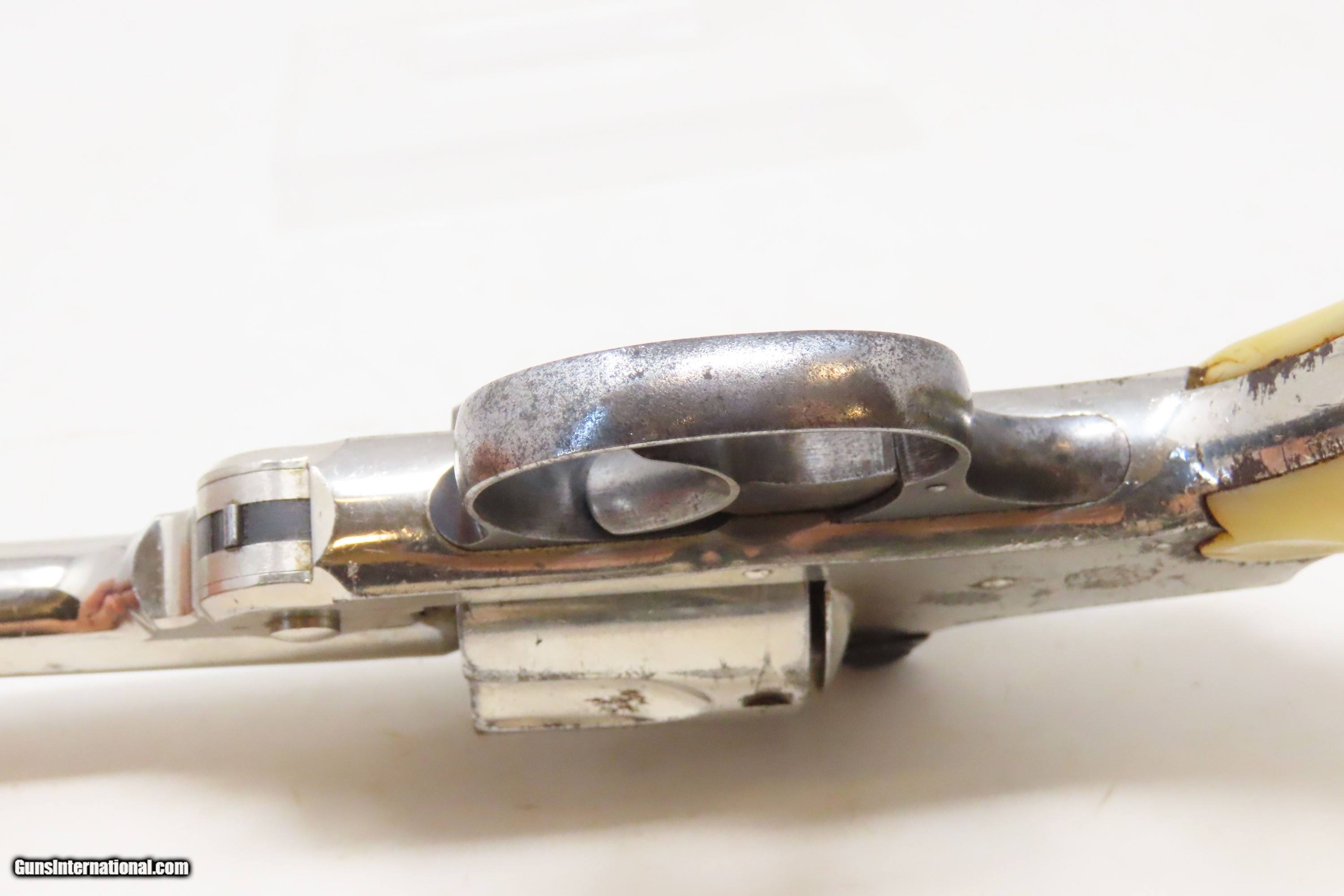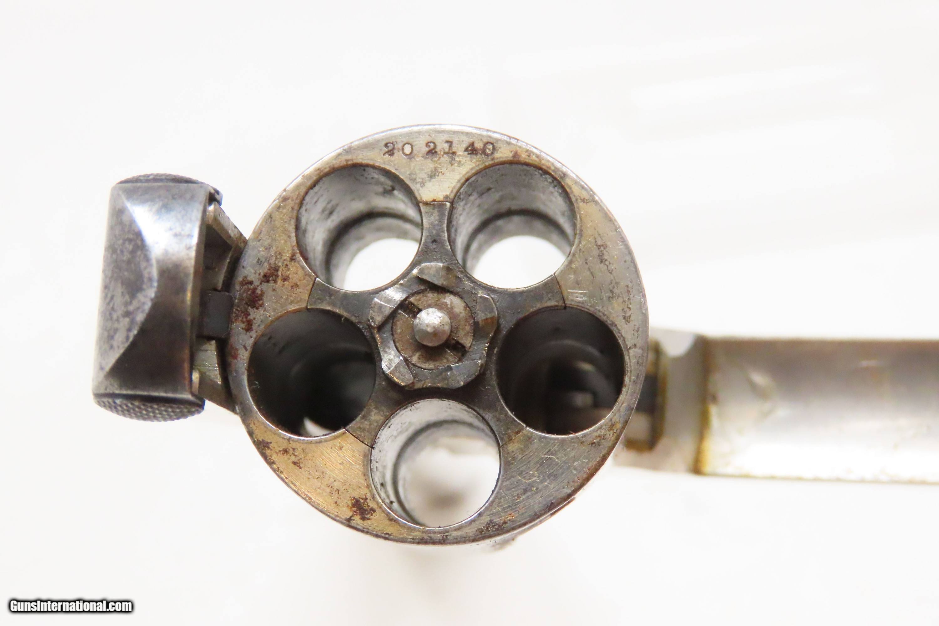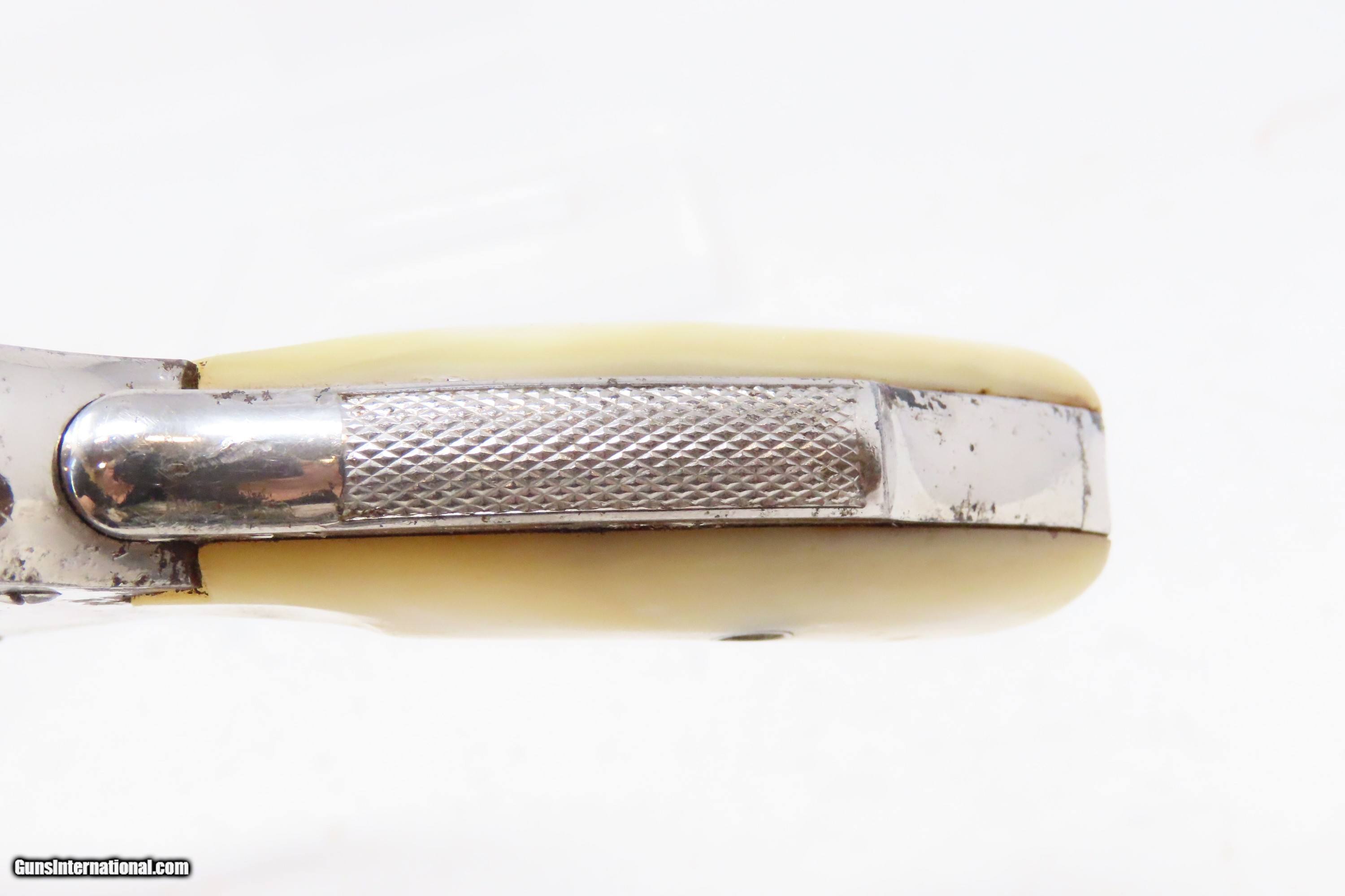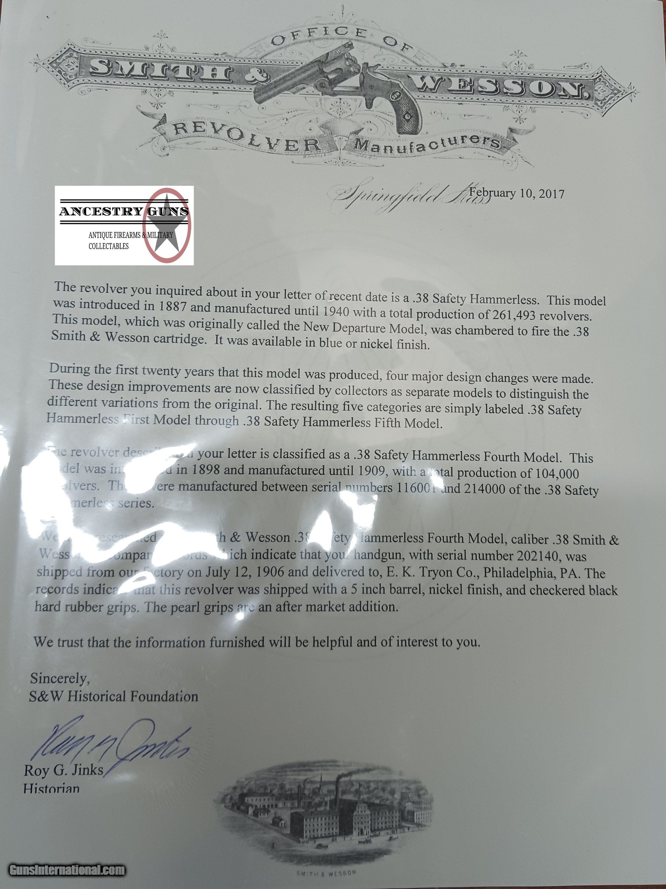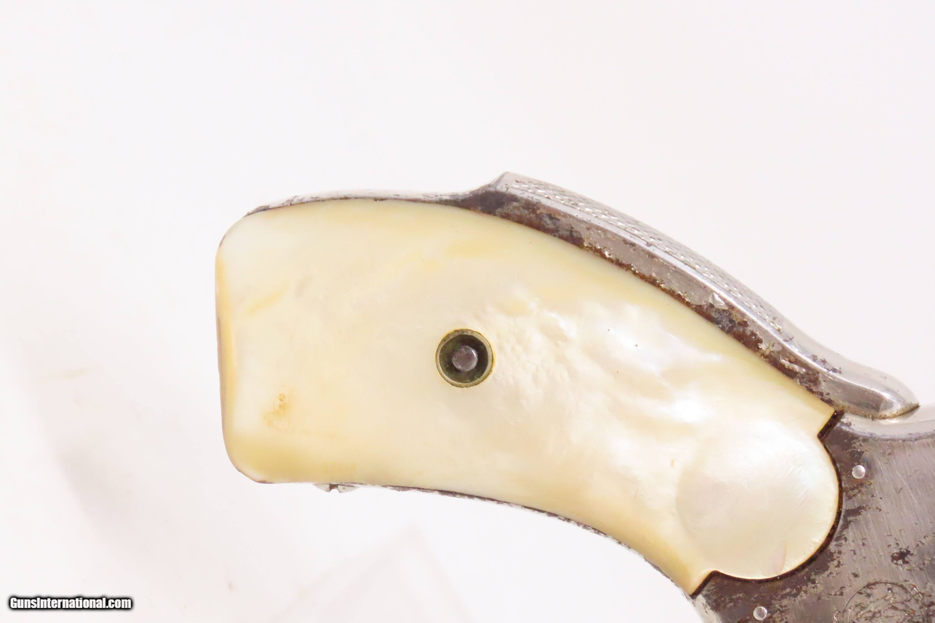 Description: LETTERED SMITH & WESSON .38 Safety Hammerless C&R Revolver with PEARL GRIPS Very Nice TURN OF THE CENTURY Top Break Revolver Here we present a C&R Smith & Wesson .38 S&W Safety Hammerless 4th Model Top Break Double Action Revolver, made in 1906 in Springfield, Massachusetts with a serial number range of 116003 through 220000. The Smith & Wesson Safety Hammerless models were produced from 1887 (1888 for the 32) to just before World War II. They were chambered in either .32 S&W or .38 S&W with a five-shot cylinder. They were most often produced with a 2-inch, 3-inch, 3.5-inch, or 4-inch barrel. But some 4-1/2”, 5” and 6" barreled versions are known to exist. This revolver was made to be a simple, compact and reliable firearm that one could carry in a pocket or a holster around the turn of the 20th Century. This revolver features an internal hammer design to remove risk of snagging or stopping the action. There is a grip safety built into the back of the grip frame. The frame is a top-break design that activates the automatic ejector. These are very nice features from the turn of the 20th Century! They were known as "The New Departure" to reflect the company's new approach to designing revolvers. With gangsters, and career criminals running rampant, this example would have been the “pocket advantage” a person needed. The factory letter confirms the current barrel length, caliber, and finish when it was shipped to E.K. Tryon Co. of Philadelphia, PA, on July 12, 1906. The overall condition is fine. Bright, original nickel finish. Shiny bore. Markings are sharp. Both grips are good with a fiery appearance. Numbers match. This firearm is classified as a Curio & Relic. Barrel is 5 inches. Caliber: .38 S&W Overall condition as seen in photos. Very Fast. Very Safe. FREE SHIPPING. Will need to be sent to your local FFL or C&R licensee. This firearm is classified as a Curio & Relic. Guaranteed AUTHENTIC & Includes CERTIFICATE OF AUTHENTICITY. ancestryguns $1000 #233477 SOLD Curio/Relic: Yes |
