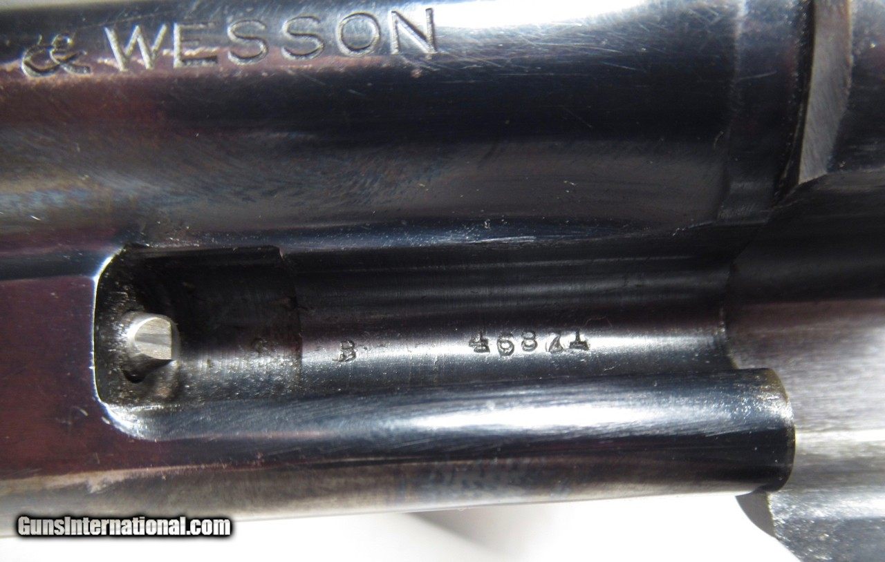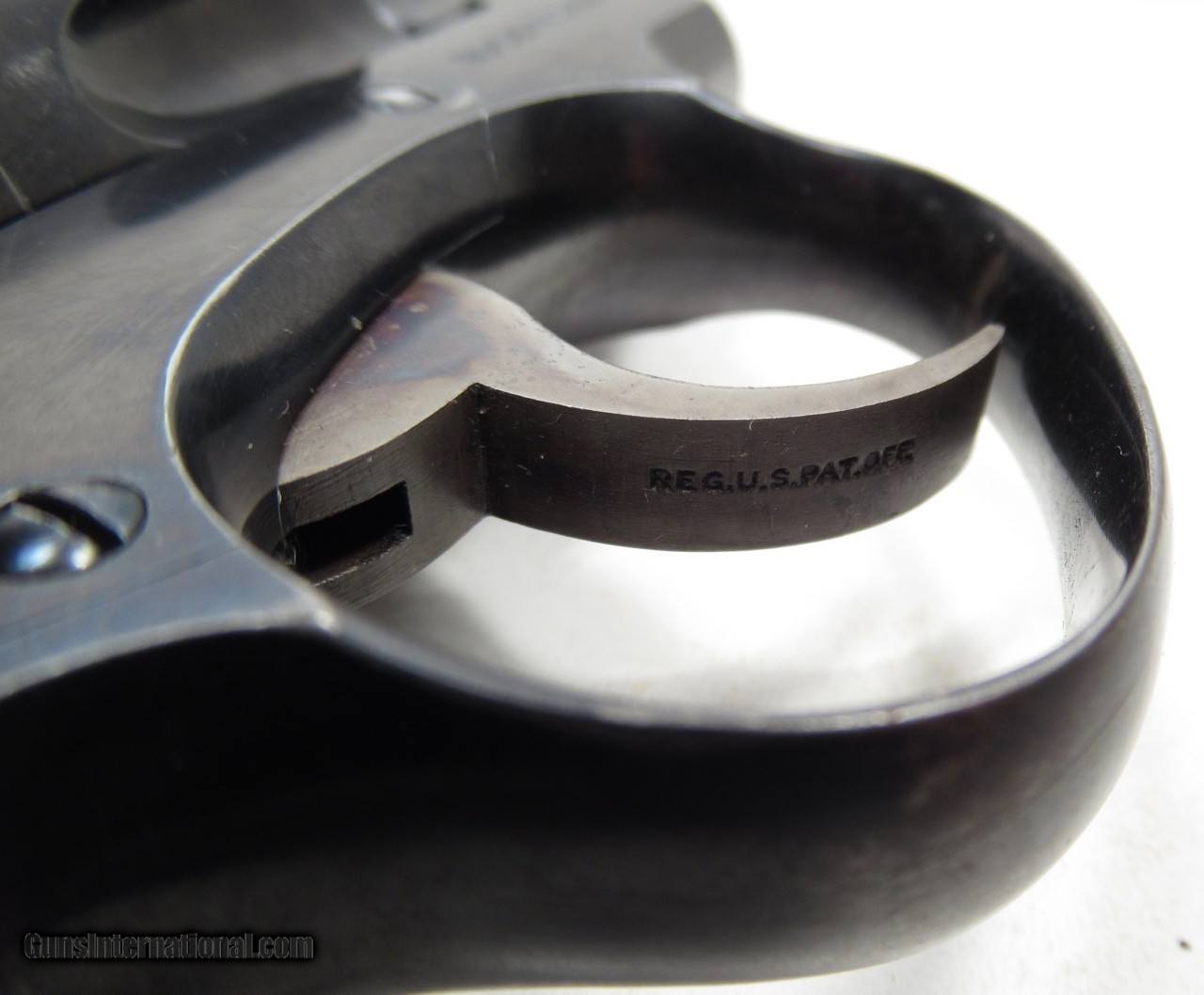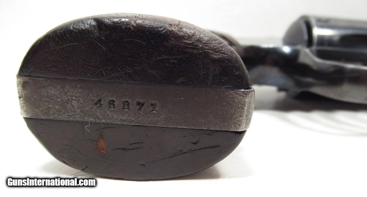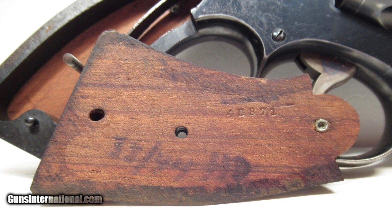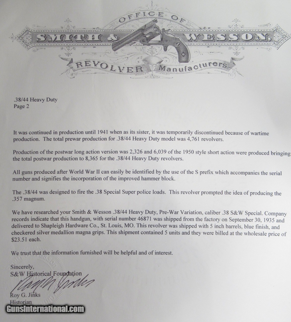 Description: Smith & Wesson Pre-War 38/44 Heavy Duty Revolver; Serial No. 46871; .38 S&W Special Cartridge with 5” Barrel; Blue Finish; All Numbers Match – Butt, Back of Cylinder, Ejector Star, Barrel, and Original Grips; Nearly All Original Metal Remains; Good Original Numbered Grips (38/44 in Black Ink on Inside); 5 Screw and Pinned Barrel; Nice Original Screws; PERFECT ACTION and BORE; Fine Original 86 Year-Old Smith & Wesson Shipped to Shapleigh Hardware Co. of St. Louis, Missouri on September 30, 1935; See All Photos for Condition; No Texts; Call (254)541-5765 or Email Only; PERSONAL PROPERTY of Harold Wieser; Price: $1,475 + $45 S&H Via USPS PRIORITY MAIL; Payment Address: Harold Wieser - 1466 U.S. Hwy 77 - Rosebud, TX 76570; SEND PAYMENTS VIA USPS PRIORITY MAIL; BEWARE of SCAMS!!! – DO NOT SEND MONEY or CORRESPONDENTS ELECTRONICALLY UNLESS YOU HAVE SPOKEN to HAROLD WIESER FIRST! 254-541-5765 SOLD Manufacturer: Smith & Wesson Model: Heavy Duty Serial Number: 46871 |