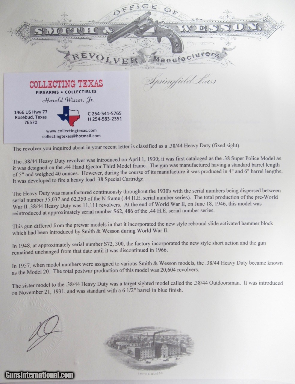 NICE ORIGINAL PRE-WWII SMITH & WESSON 38/44 HEAVY DUTY REVOLVER from COLLECTING TEXAS – FACTORY LETTER INCLUDED – SHIPPED 1935