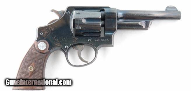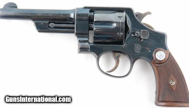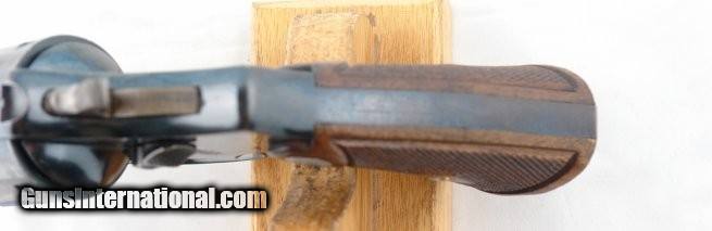 Description: PRE-WAR SMITH & WESSON MODEL 38/44 HEAVY DUTY .38 SPL. CAL REVOLVER. 5” barrel. All original and matching. Excellent with nearly all the original blue. Hammer and trigger with all the case colors. Excellent diamond checkered medallion grips. Perfect working order and mint bore. SOLD Curio/Relic: Yes |