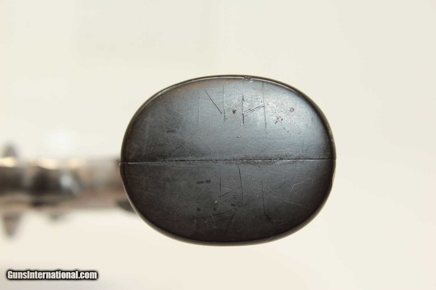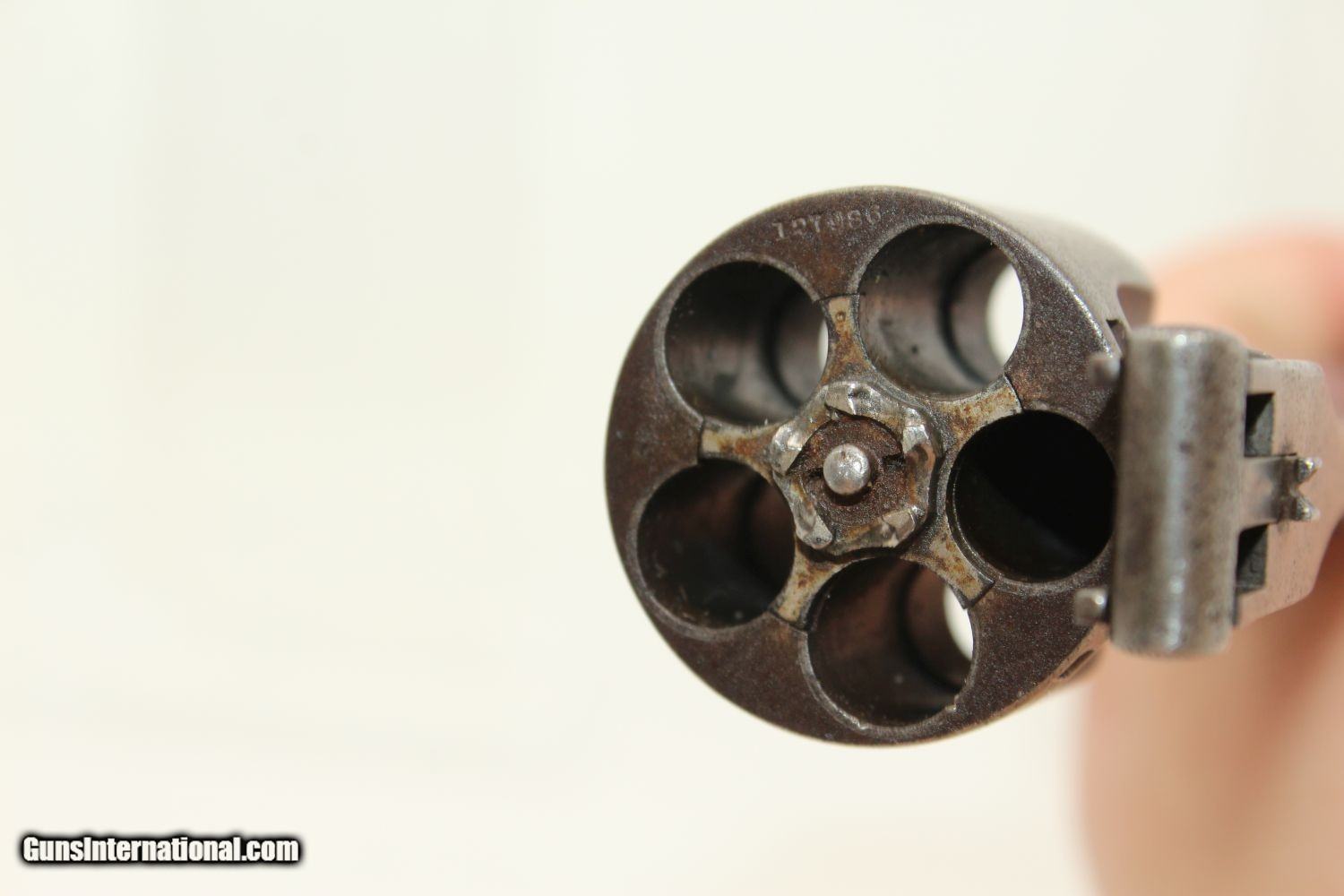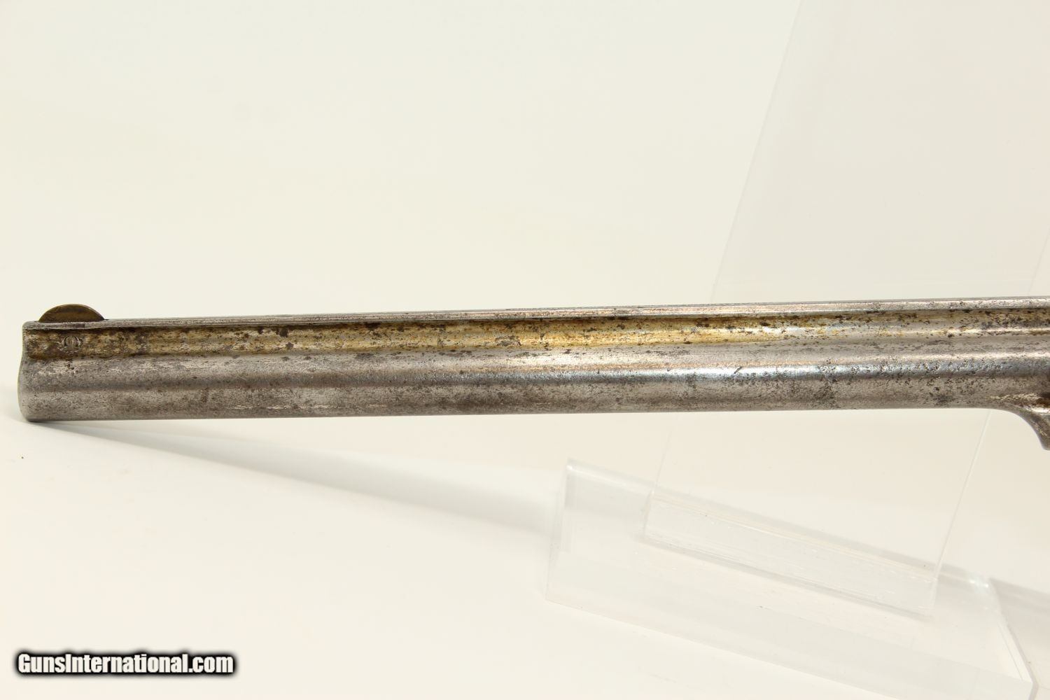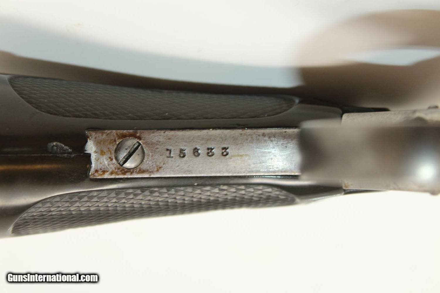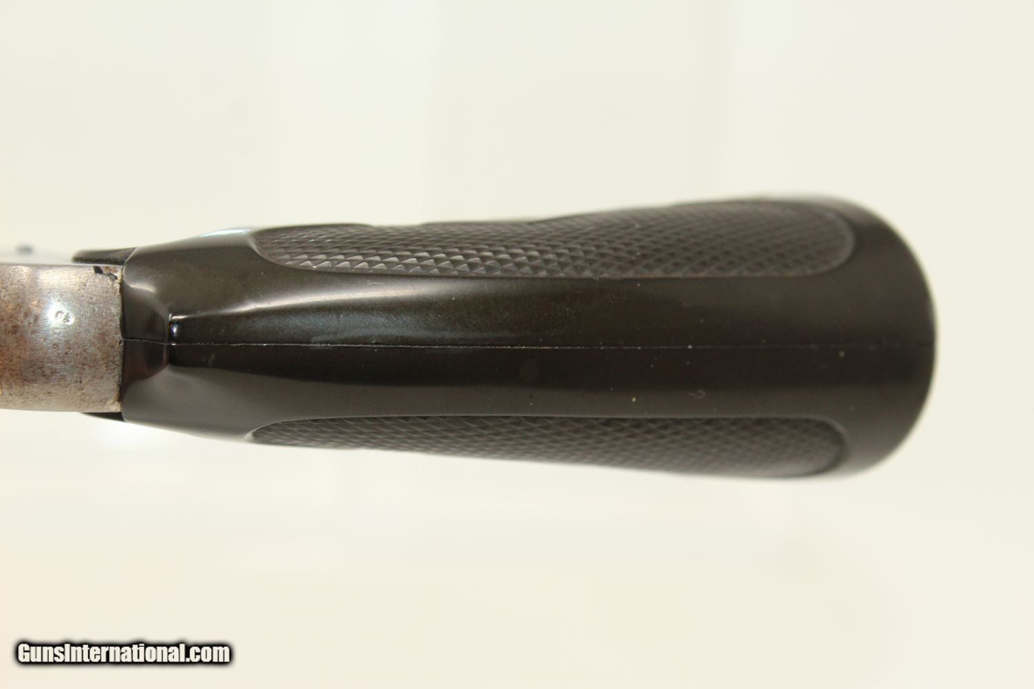 Description: SMITH & WESSON Model of 1891 .22/.38 COMBINATION Single Shot .22 Rimfire & .38 Revolver! Here we present a Smith & Wesson Model of 1891 .22 Single Action Third Model/ Combination Revolver/Pistol Set with .38 Barrel and Cylinder made circa 1900 in Springfield, Massachusetts. The Smith & Wesson Model 1891s were produced from 1891 to 1911 with a total production in all calibers of only 1251. This unusual pistol combines the frame of a .38 single action 3rd Model with a single shot barrel in .22. Also included is an extra barrel and revolving cylinder in .38 caliber. This pistol is a top break and functions exactly as a revolver does. The top of the barrel rib is marked with the two-line, two block address/patent dates with "MODEL OF 91" in the center. The extra barrel’s left side is marked "38 S&W CTG" and the right side of the frame has the S&W Trademark logo. It has a blade front and notch rear sights, blue finish with casehardened hammer, trigger and trigger guard and fitted with hard rubber grips. The barrel assemblies exchange simply with the removal of the pivot screw. The overall condition is good. The bore of the .38 barrel is in great shape, clean with sharp rifling. The bore of the .22 has been shot more and has thin rifling. The action is strong. This firearm is classified as a Curio & Relic. Barrel is 10 inches; 5 inches on second barrel Caliber: .22 Long Rifle/.38 on second barrel Overall condition as seen in photos. Very Fast. Very Safe. FREE SHIPPING. Will need to be sent to your local FFL or C&R licensee. This firearm is classified as a Curio & Relic. Guaranteed AUTHENTIC & Includes CERTIFICATE OF AUTHENTICITY. ancestryguns $1200 #190158 SOLD Curio/Relic: Yes |
