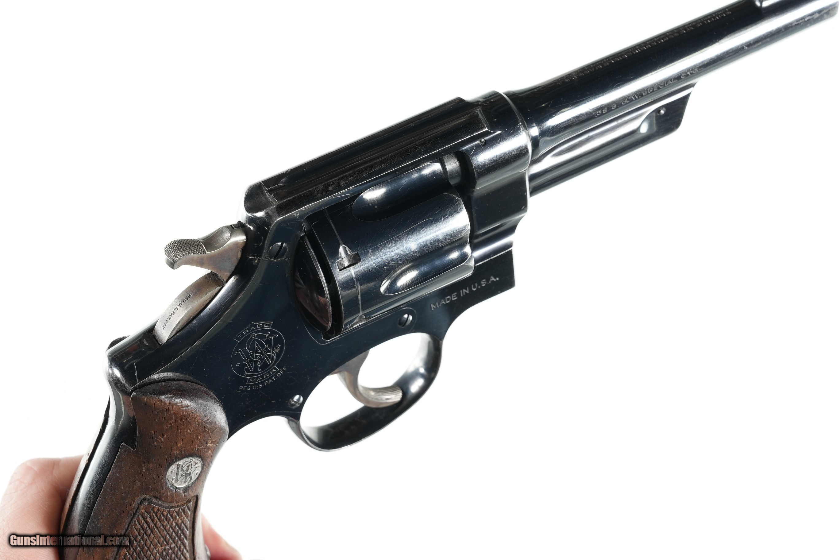 Description: Smith & Wesson Model 38/44 Double Action Heavy Duty Revolver with 5" Bbl and diamond pattern checkered grips with Factory medallions. Case color hammer & trigger. Condition, Very good with over 90% finish, bright bore and chambers. Grips are good with scuffs and some material loss. Mechanically fine • Free Shipping, No Credit Card Fees. • Lay-a-way available for this firearm. • 1/3 Down, a 1/3 in 30 Days 1/3 in 60 Days. SOLD Curio/Relic: Yes Manufacturer: Smith & Wesson Model: 38/44 Serial Number: 51650 Barrel Length: 5 |