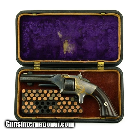 Description: " Cased Smith & Wesson 1st Model 1st Issue 3rd Variation. Early gun! The barrel has mostly dark brown patina. Frame is mostly silver. Very good grips. There were only around 1800 or so of these models made. This gun comes in a very fine gutta percha case. SOLD Antique: Yes |
