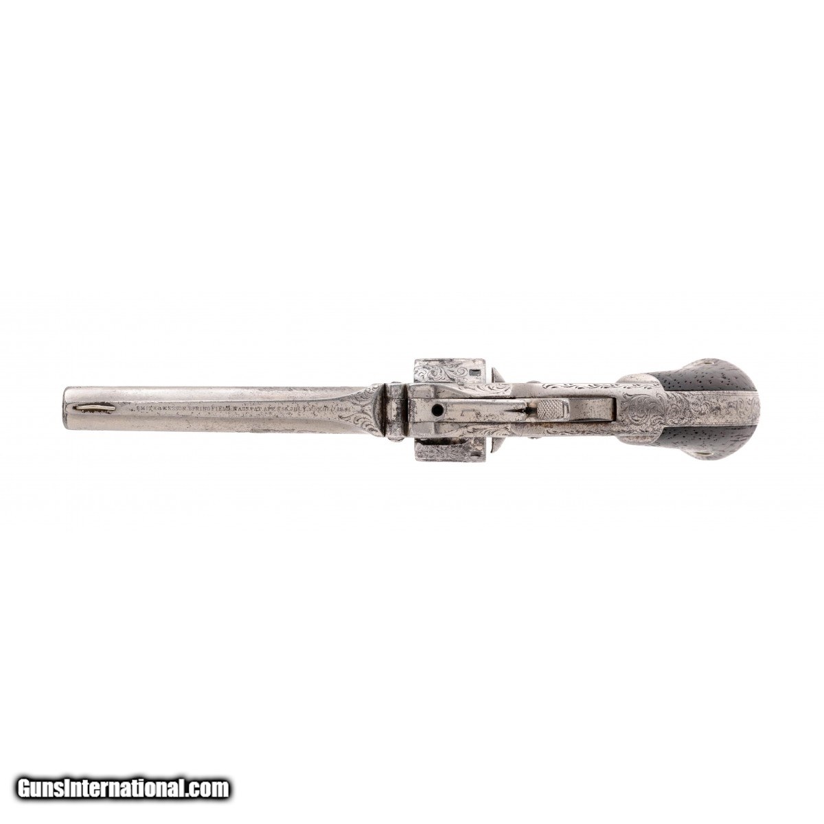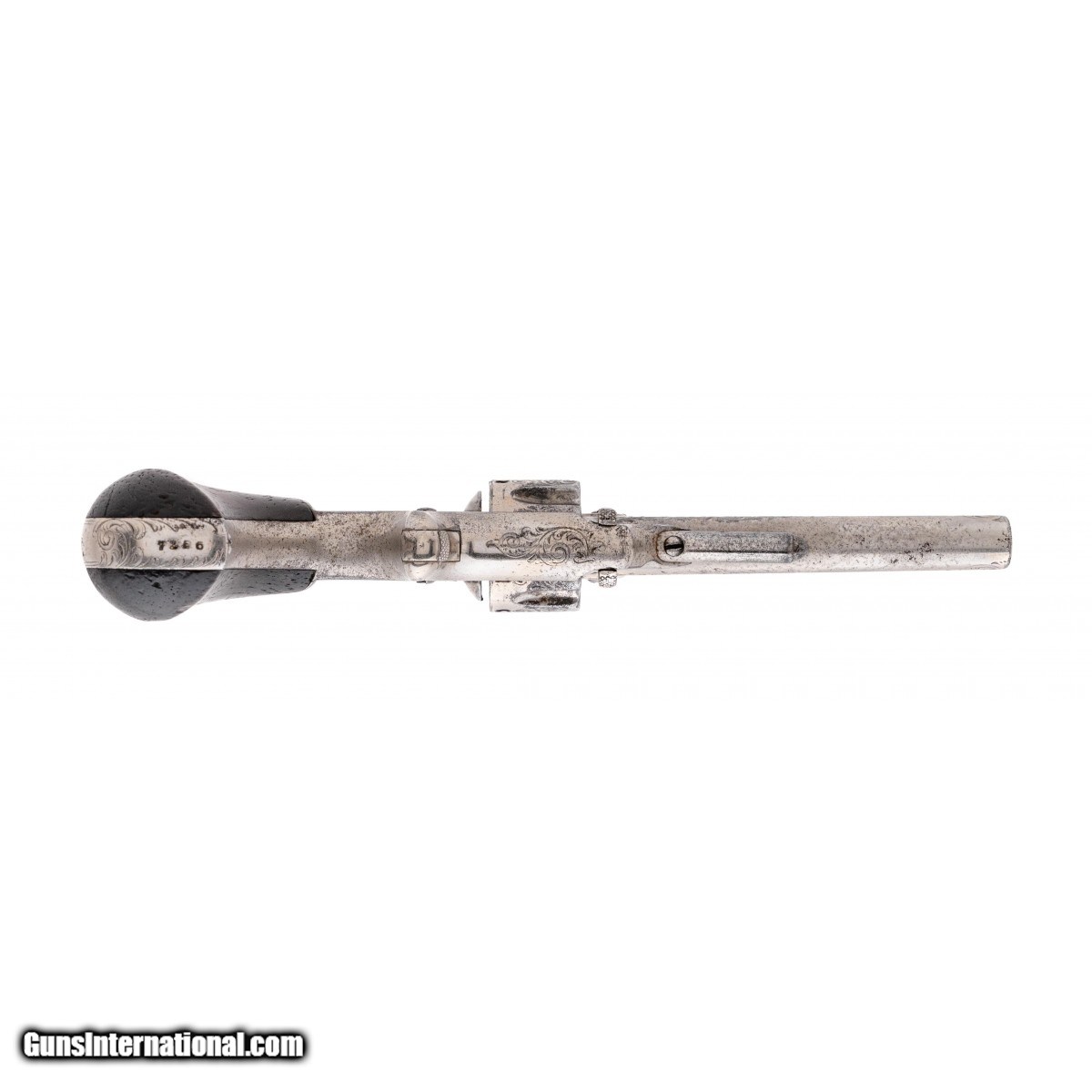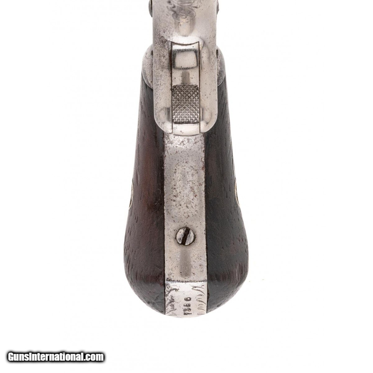 Description: "Serial No. 7366, circa 1868-1870's, .22 short RF, 3 3/16"" round ribbed barrel. Revolver has a dull nickel patina finish, with light oxidation visible in some areas mostly right side forward of the cylinder. Bore is dark with frosting and pitting noted in the grooves, faint rifling remains. Rosewood bird head grips have nicks, scratches present from handling. Action does not indexes properly but functions. Consignment. SOLD Antique: Yes |