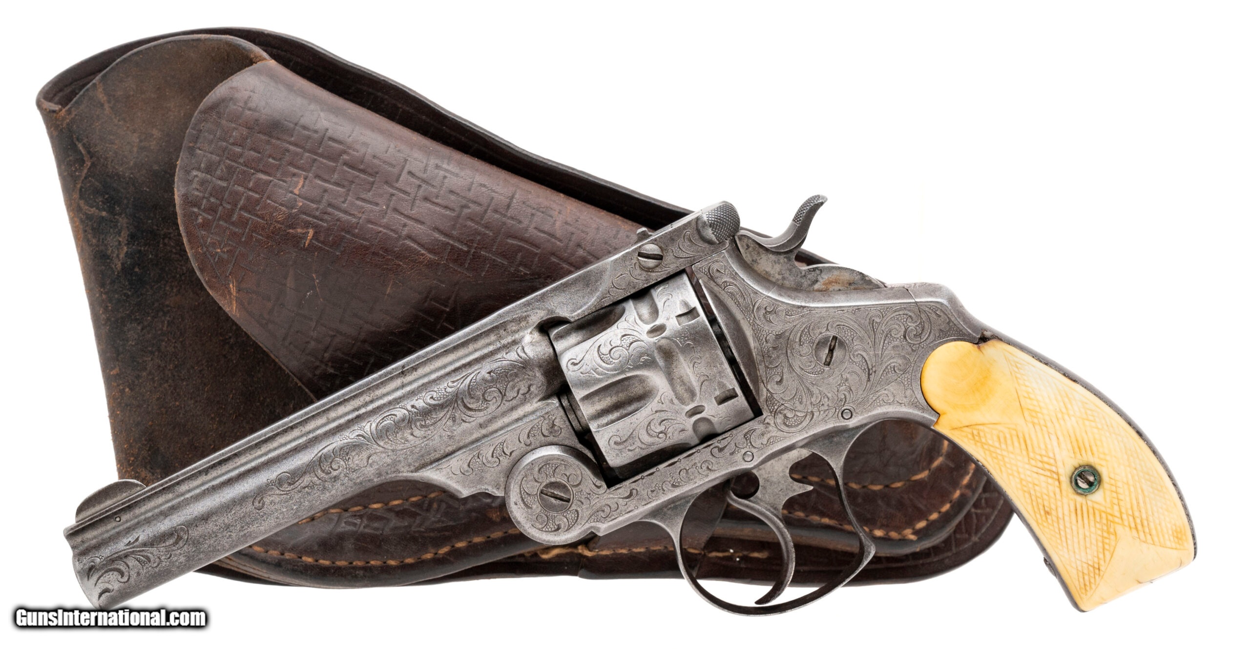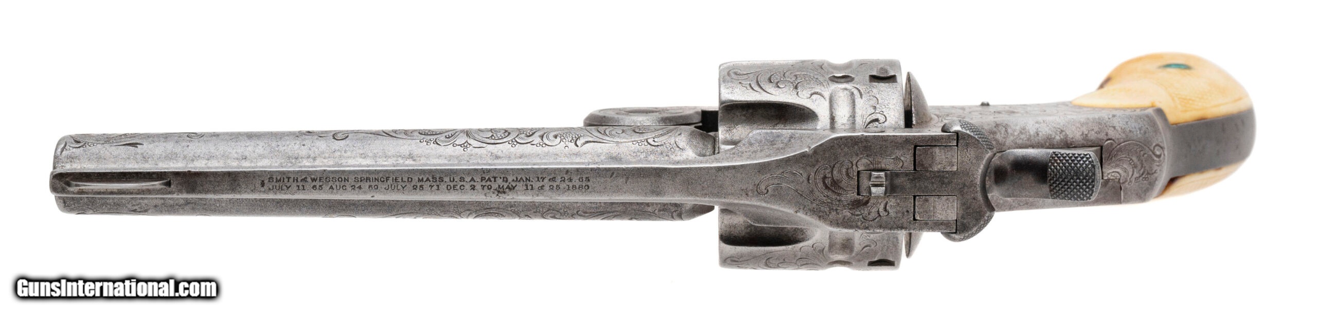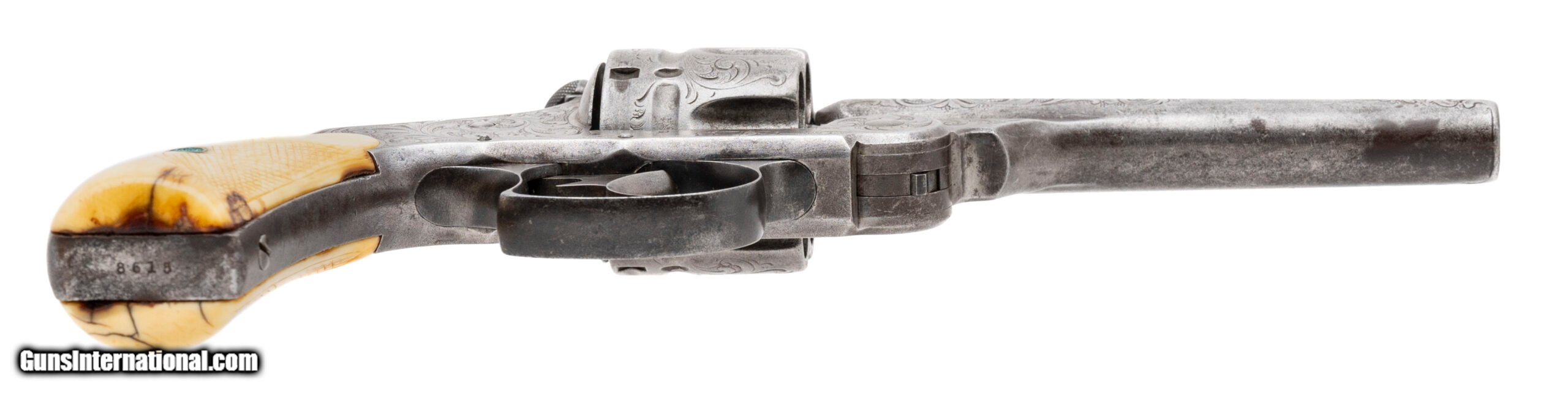 Description: "Serial number 8615. Made in 1884. 44 S&W caliber with a 5" barrel. This gun has a even gray patina. It is New York engraved and the engraving remains nice and sharp. The grips are worn checkered ivories. This gun comes with a single loop holster. Along with this gun comes a factory letter confirming the configuration. This gun was shipped to Smith & Wesson distributor M.W. Robinson. SOLD Antique: Yes |