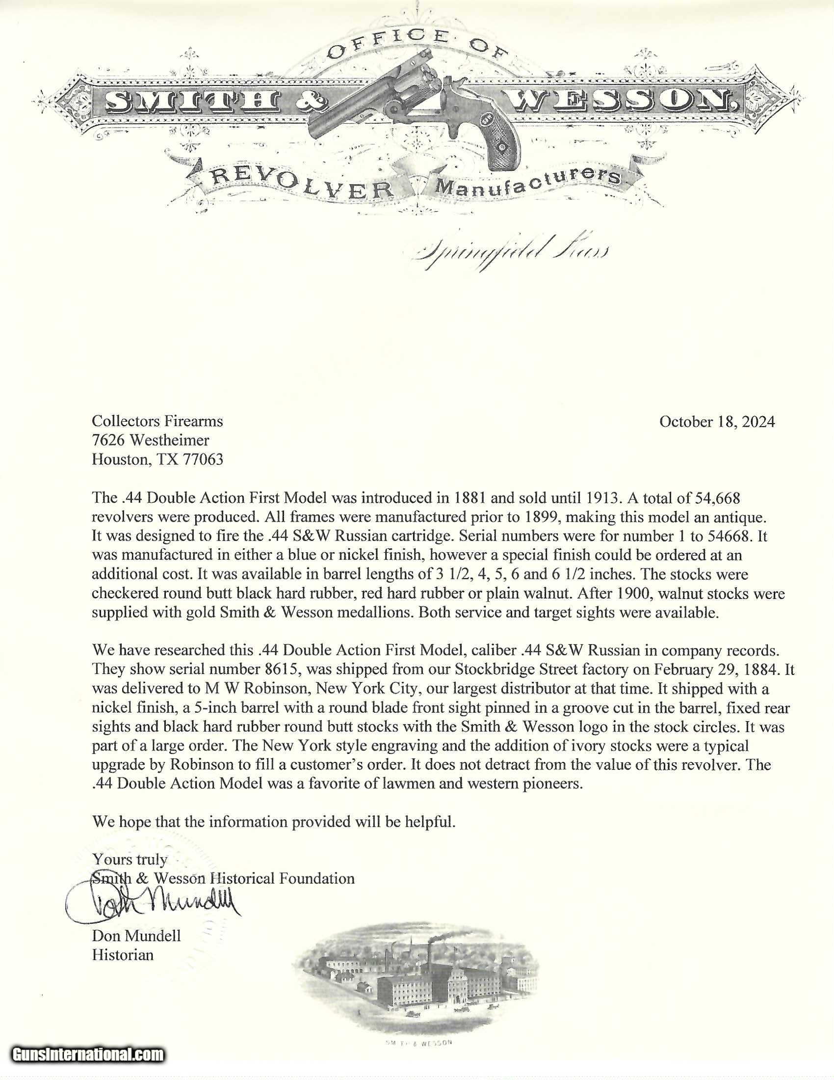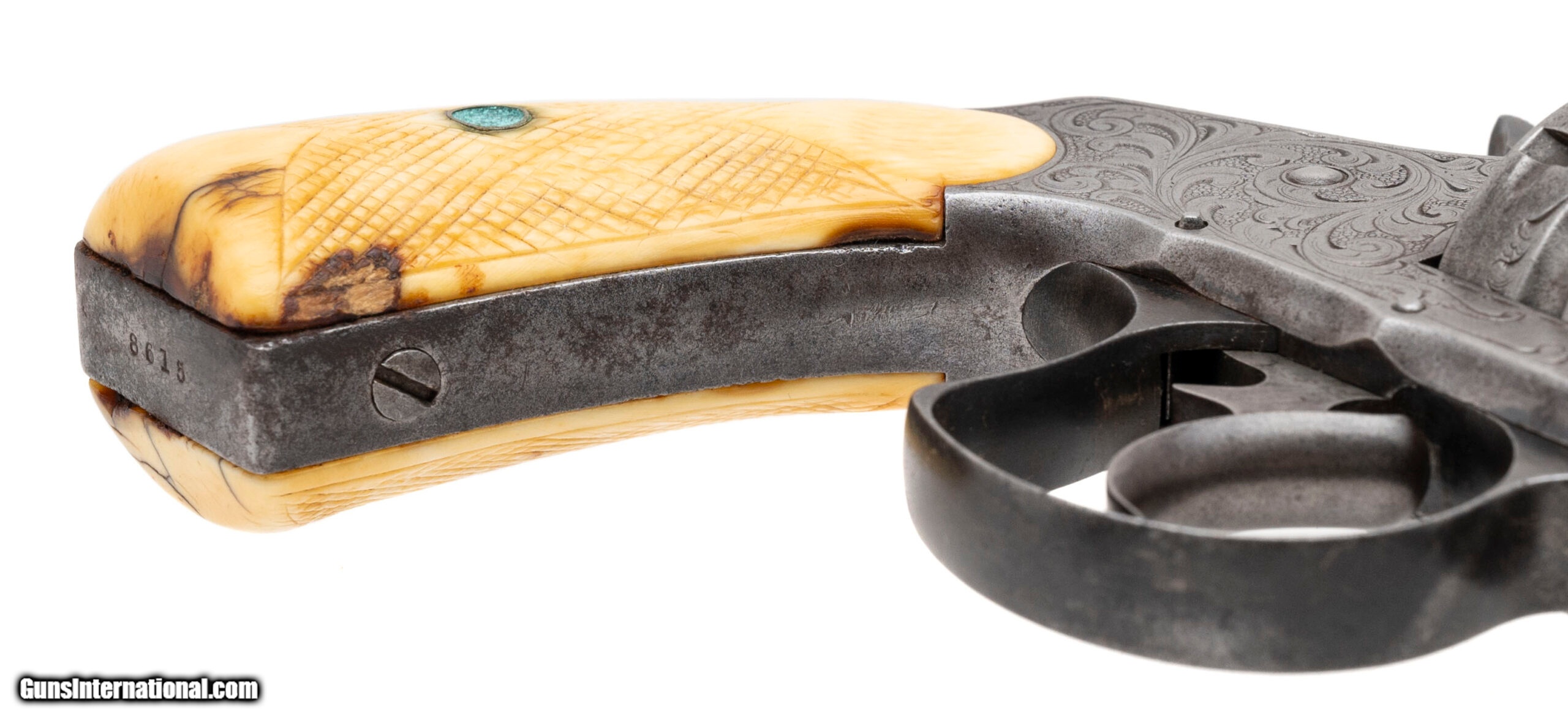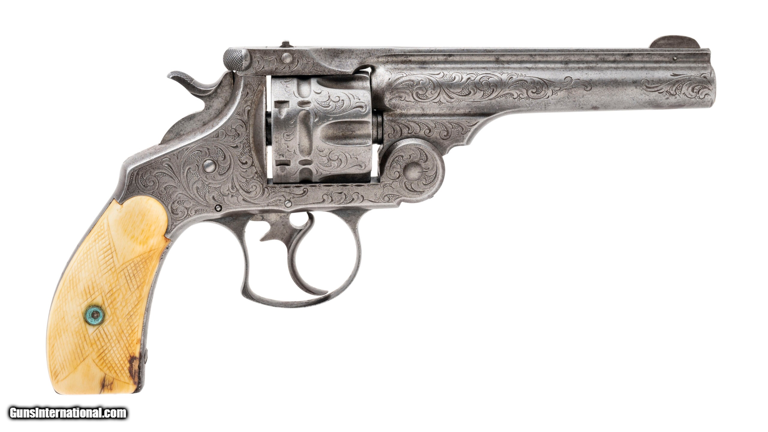 Description: "Serial number 8615. Made in 1884. 44 S&W caliber with a 5" barrel. This gun has a even gray patina. It is New York engraved and the engraving remains nice and sharp. The grips are worn checkered ivories. This gun comes with a single loop holster. Along with this gun comes a factory letter confirming the configuration. This gun was shipped to Smith & Wesson distributor M.W. Robinson. SOLD Antique: Yes |