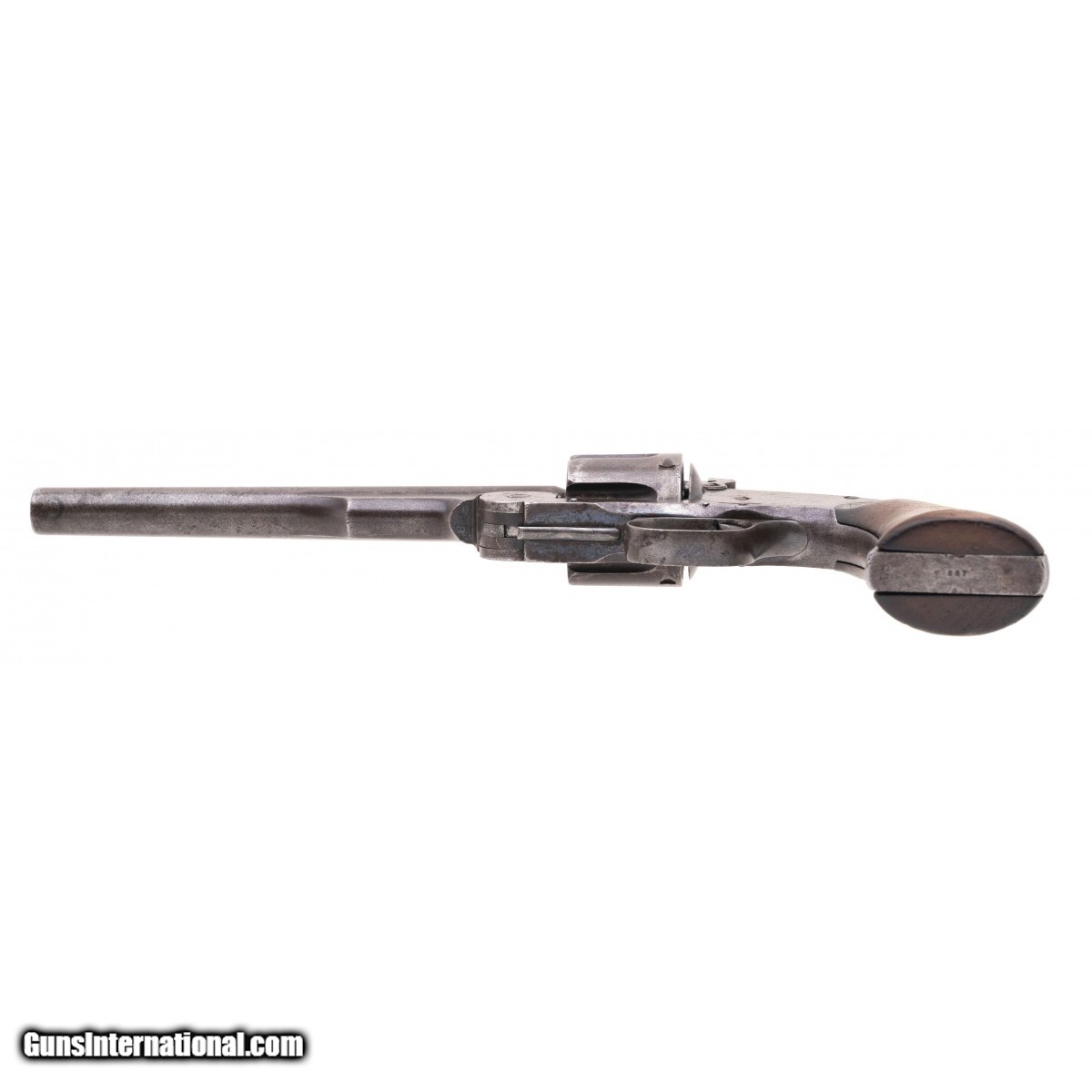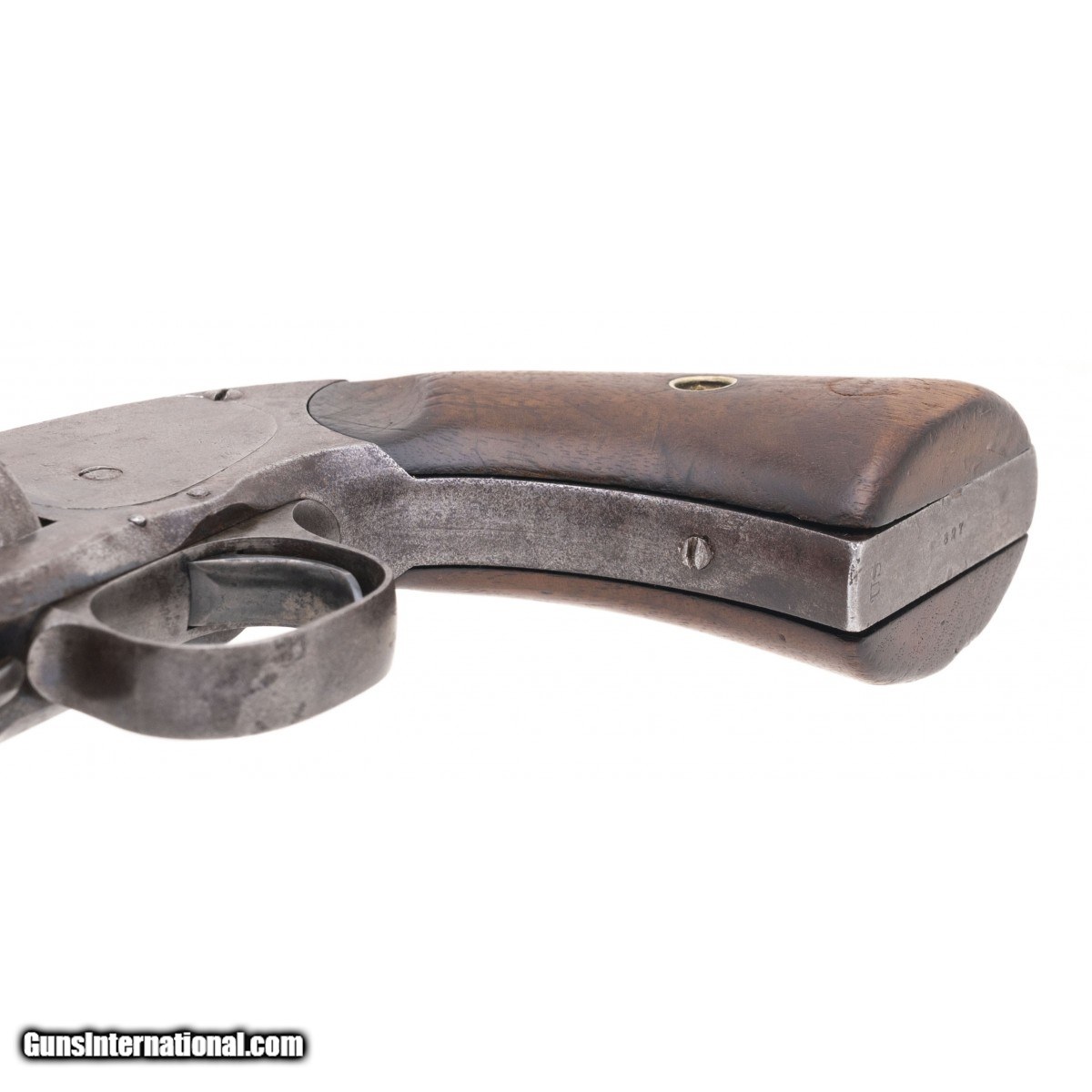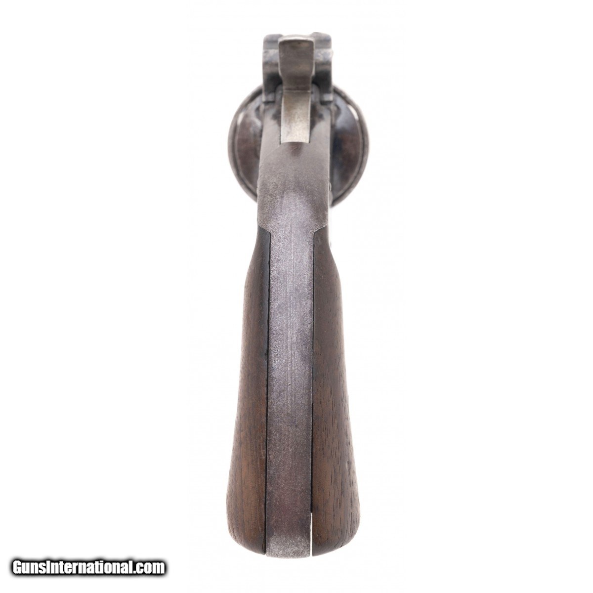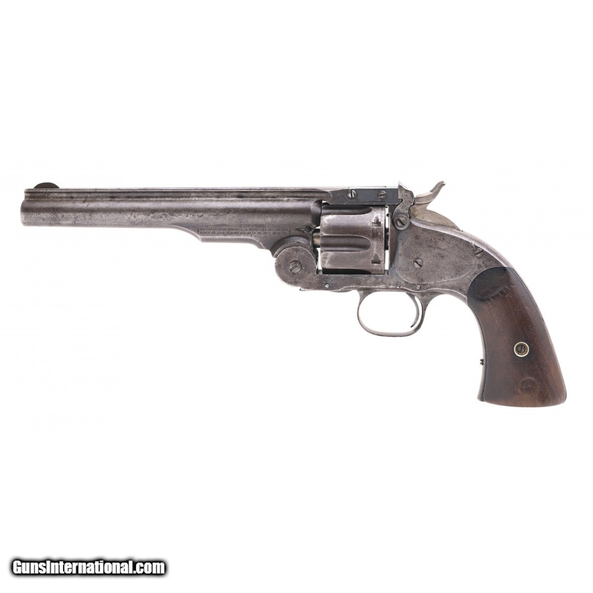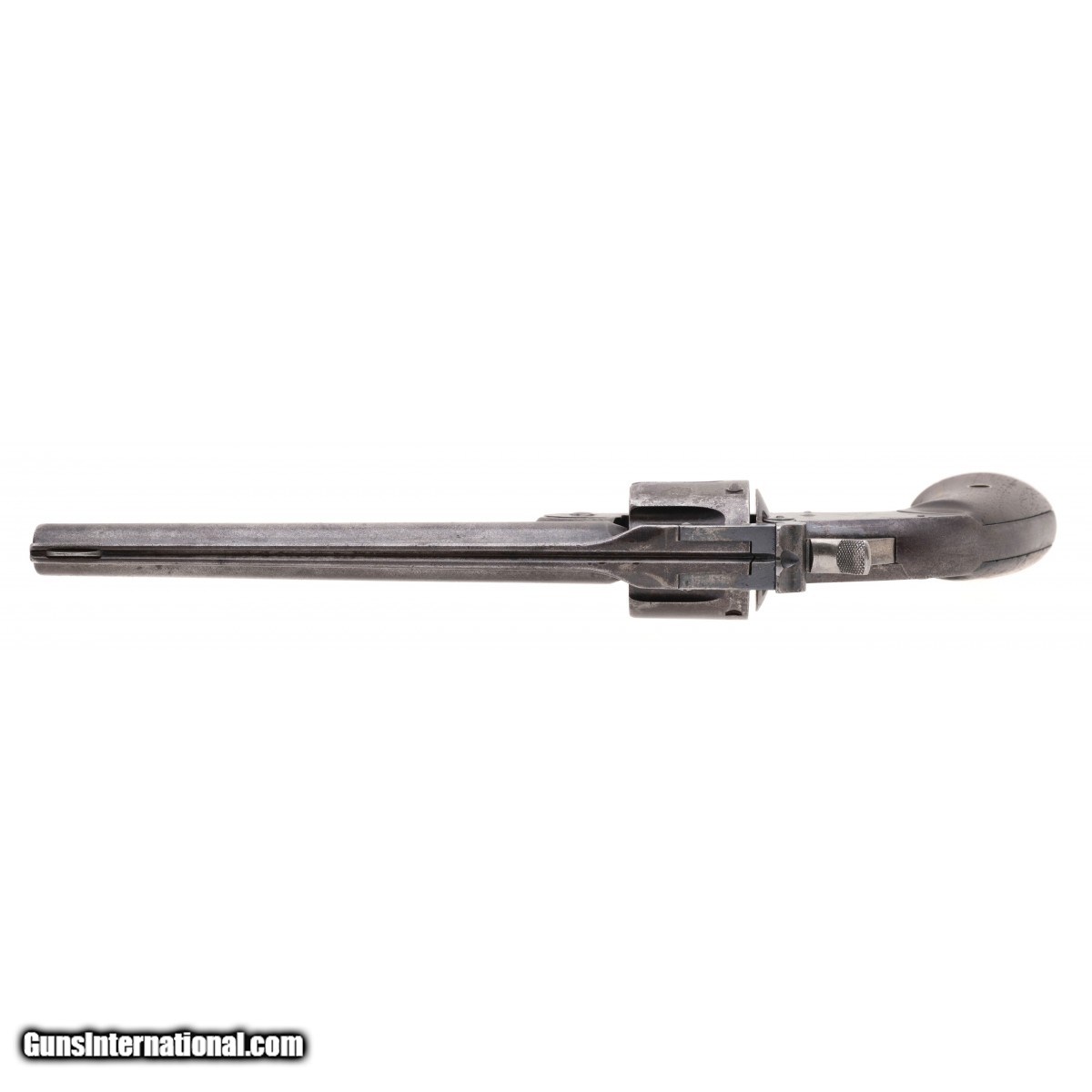 Description: " Serial No. 827, made in 1875, .45 S&W, 7"" round barrel. Rare martially marked 1st Model Schofield Revolver with ""US"" stamped on the butt. The cylinder is mis-matched and is numbered 785. Gun has an even brown patina with traces of original blue in protected areas, mostly around the recoil plate. Bore is bright and shiny with light frosting visible in the grooves, handsome rifling remains. Two piece walnut grips have light nicks and dings noted. Action indexes correctly with a tight lock up. Most of these revolvers were issued to the 4th, 9th and 10th cavalry during the Indian Wars! Consignment. SOLD Antique: Yes |
