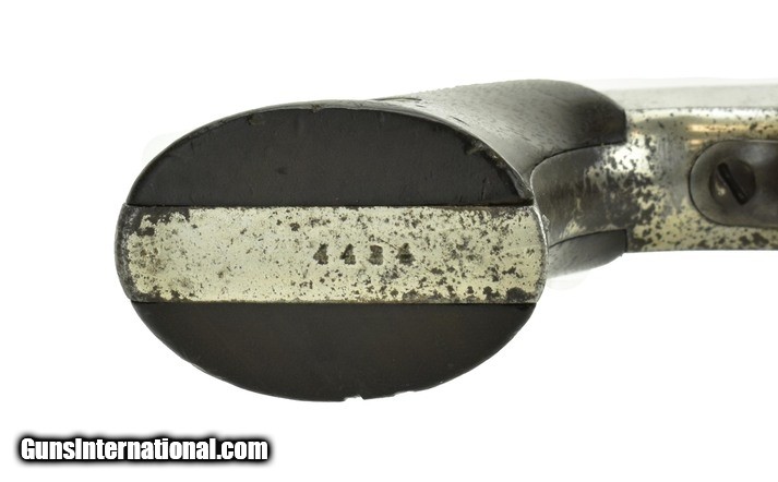 Description: "Smith & Wesson 1st Model American .44 S&W American. 8" Ribbed round barrel with a good bore showing scattered light pitting, partially bright areas and still crisp rifling throughout. The metal surfaces retain about 85% original nickel finish showing overall light flaking toning to a deep brown patina, scattered light dings and some sparse pinprick pitting. The trigger guard has toned to a plum-brown patina and the hammer is a dark gray showing some faint remnants of case-hardened colors lurking about. The area around the barrel hinge lock screw has been enlarged somewhat and the screw heads show light slot wear. The barrel address remains mostly crisp and legible. The smooth walnut grips remain in very good plus condition showing some light dings and handling marks. The right panel is stamp-numbered to the gun, the left is un-numbered and the remaining numbered parts are matching by assembly number. Barrel-to-frame fit is solid and the action seems to function well mechanically with excellent timing and lock-up. An attractive first model for the Smith & Wesson collector. SOLD Antique: Yes |