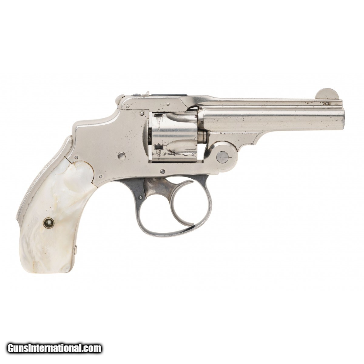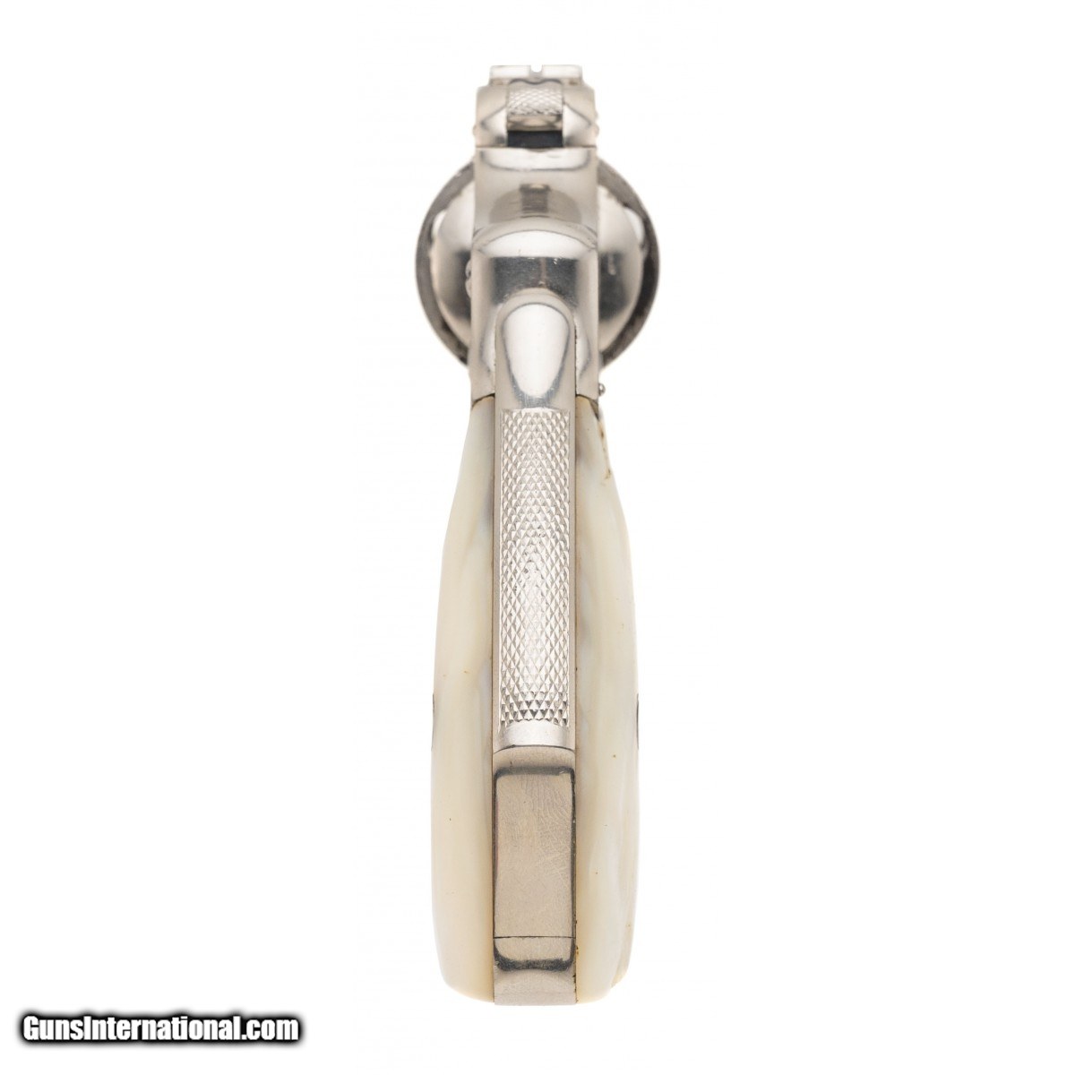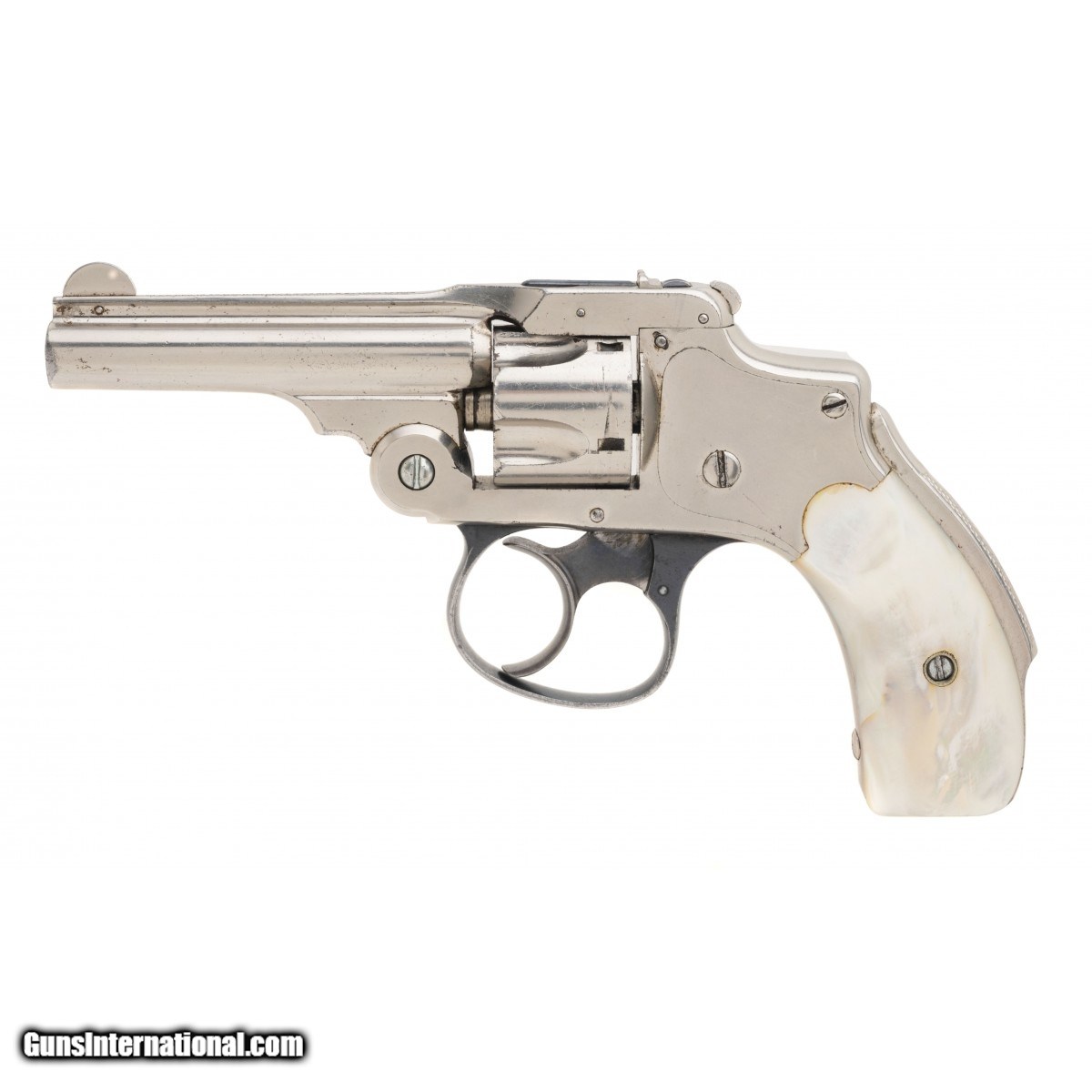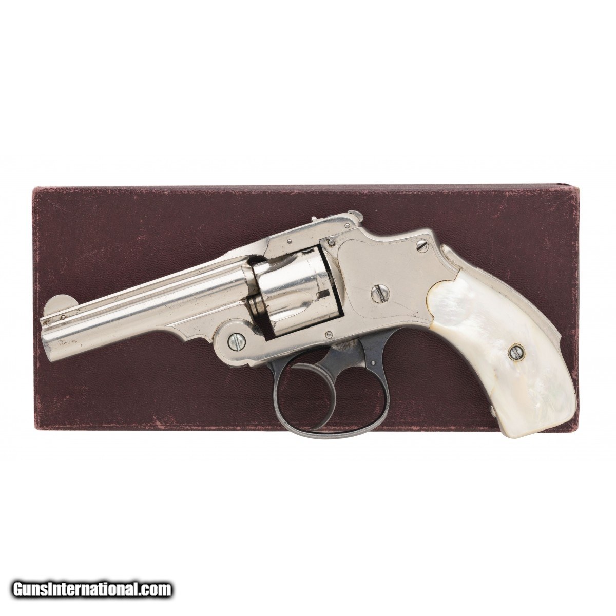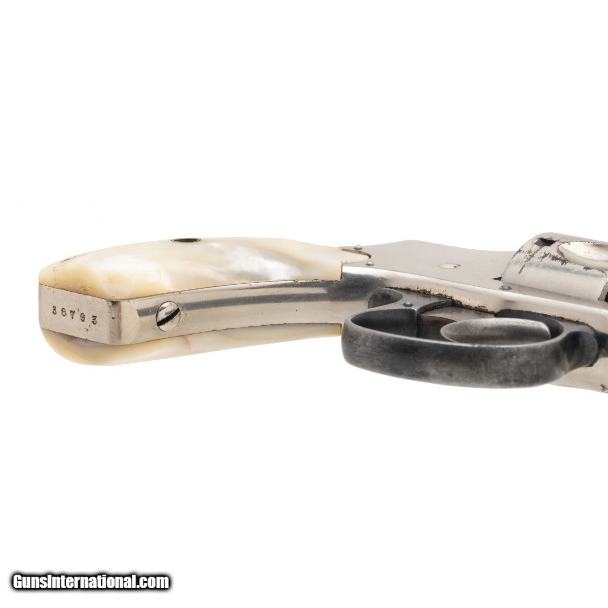 Description: " Serial No. 38793, circa 1890's, .32 S&W, 3"" round barrel. Nickel finish is in very good condition with light scratches noted. Bore is bright with a small area of pitting visible near the chamber, rifling remains strong. Mother of Pearl grips are good, left side has minor surface cracks and chips at the toe. Action indexes correctly with a tight lock up. Comes with original. Consignment SOLD Antique: Yes |
