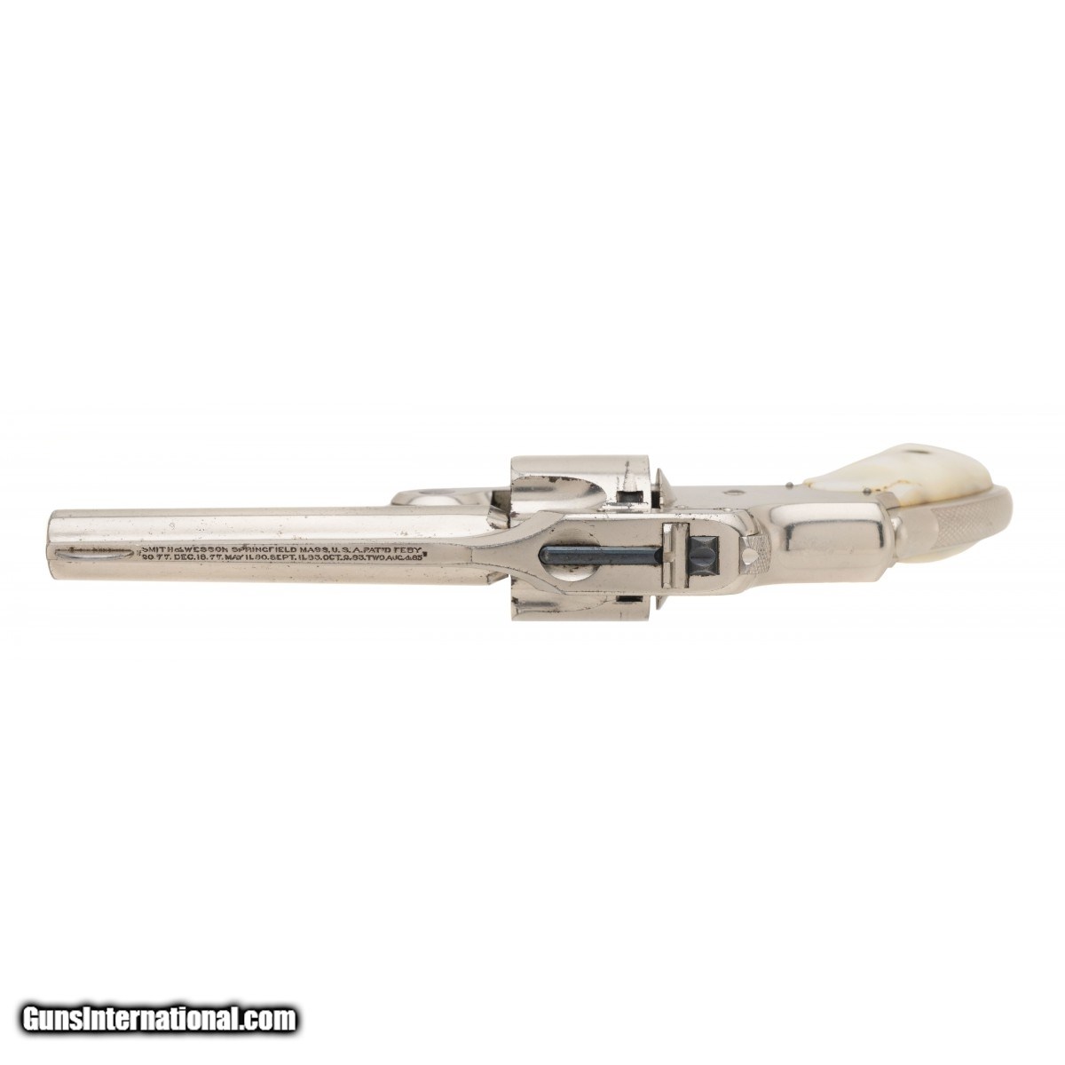 Description: " Serial No. 38793, circa 1890's, .32 S&W, 3"" round barrel. Nickel finish is in very good condition with light scratches noted. Bore is bright with a small area of pitting visible near the chamber, rifling remains strong. Mother of Pearl grips are good, left side has minor surface cracks and chips at the toe. Action indexes correctly with a tight lock up. Comes with original. Consignment SOLD Antique: Yes |