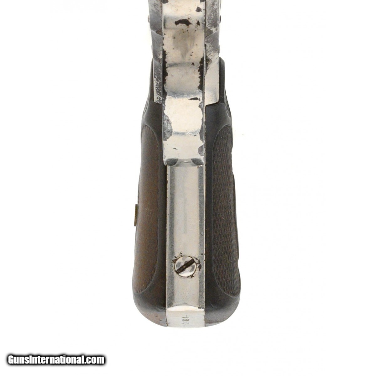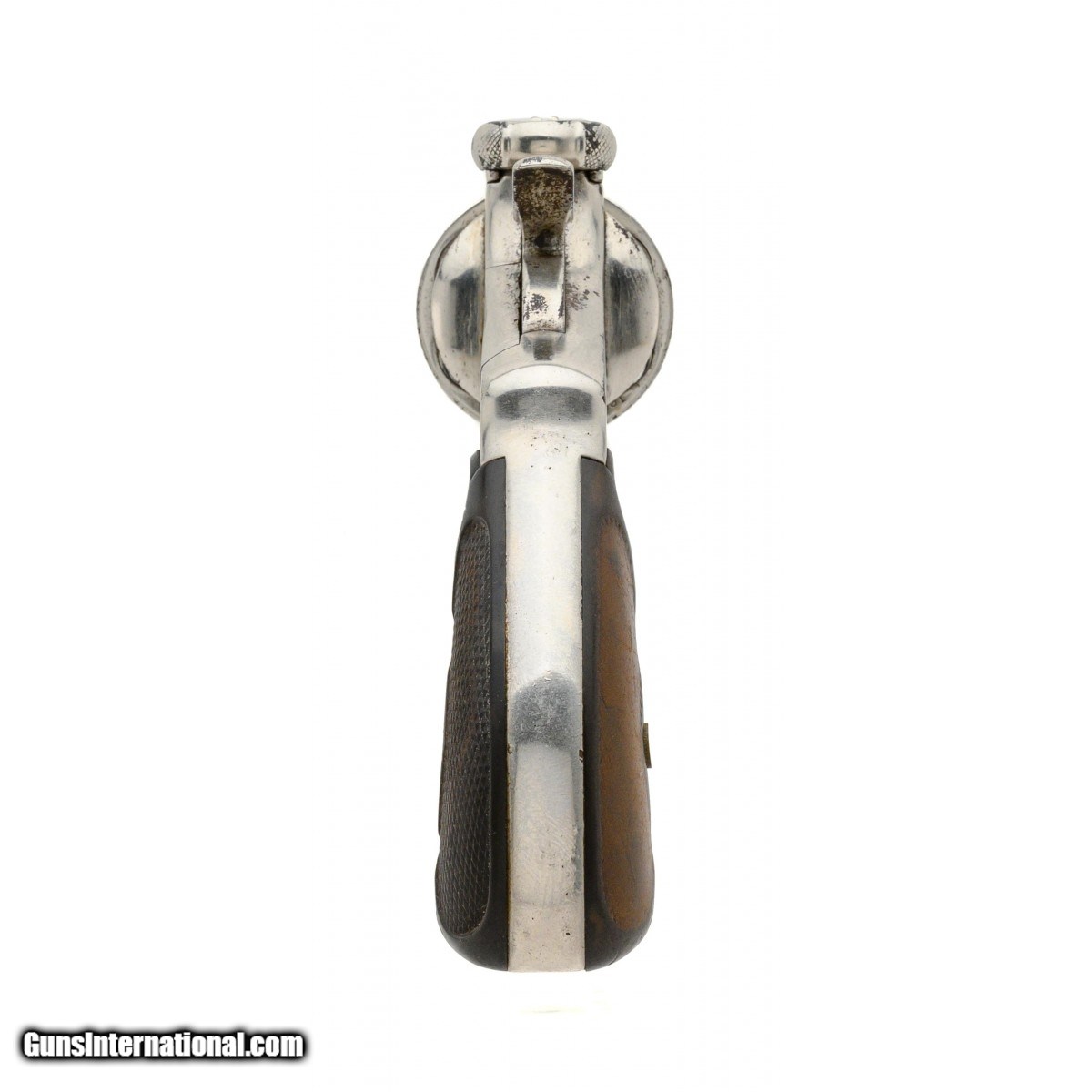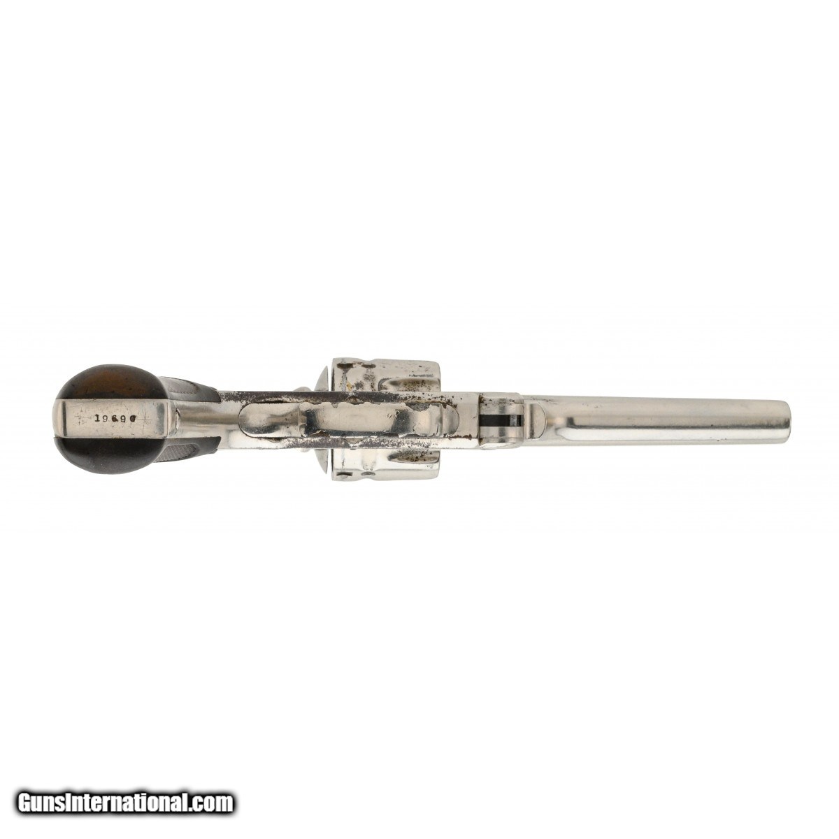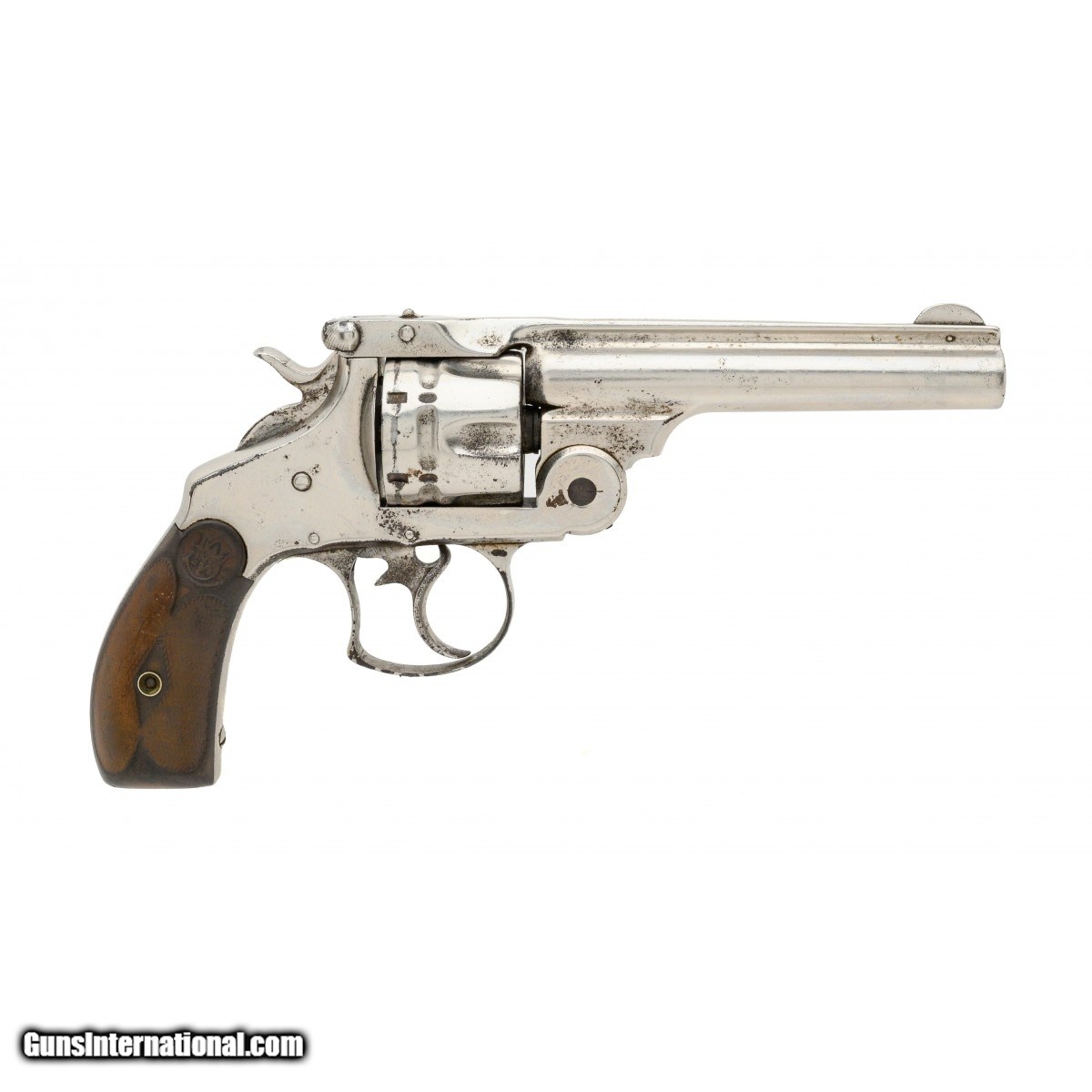 Description: "SN:19690. Made circa 1880's. .44 S&W with a 5"" barrel. Bore is dark in groves and is in good condition. Double action top break revolver. Finish is good with scattered patina. Grips are good with wear on right side grip. Overall condition is good. (CONSIGNMENT) SOLD Antique: Yes |