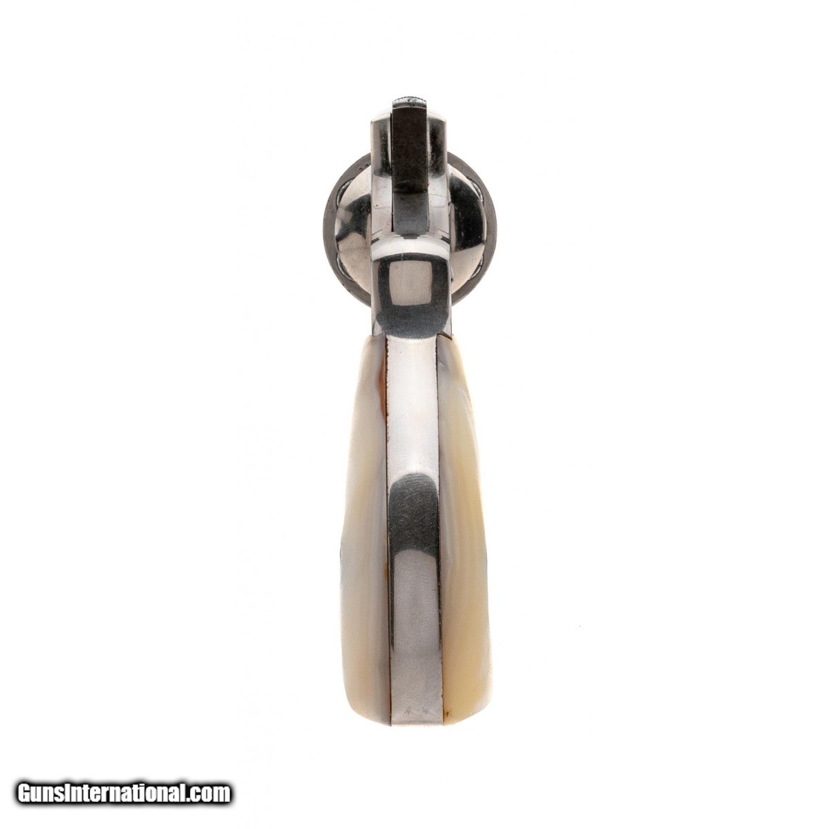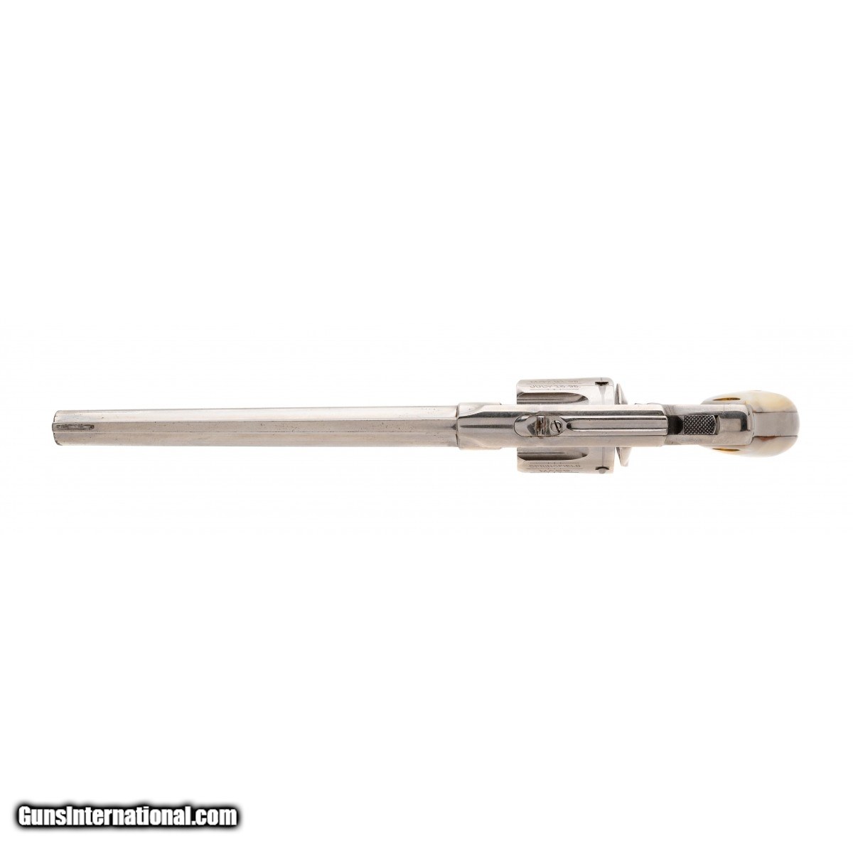 Description: " Serial No. 11772, circa 1896-1898, .32 S&W, 6"" round barrel. Nickel finish rates near excellent with scattered light pin-prick oxidation noted in some areas. Bore is bright with frosting visible in the grooves. Rifling remains strong. Beautiful Mother of Pearl Medallion grips are in excellent condition. Overall a very fine example of an early Hand Ejector Model! Consignment SOLD Antique: Yes |