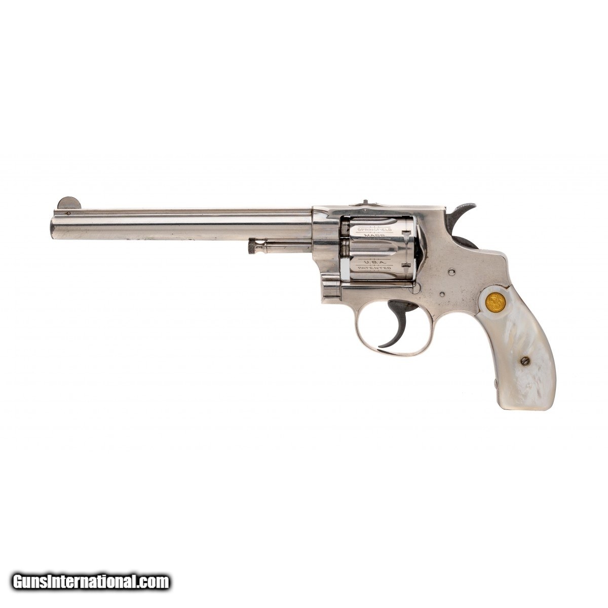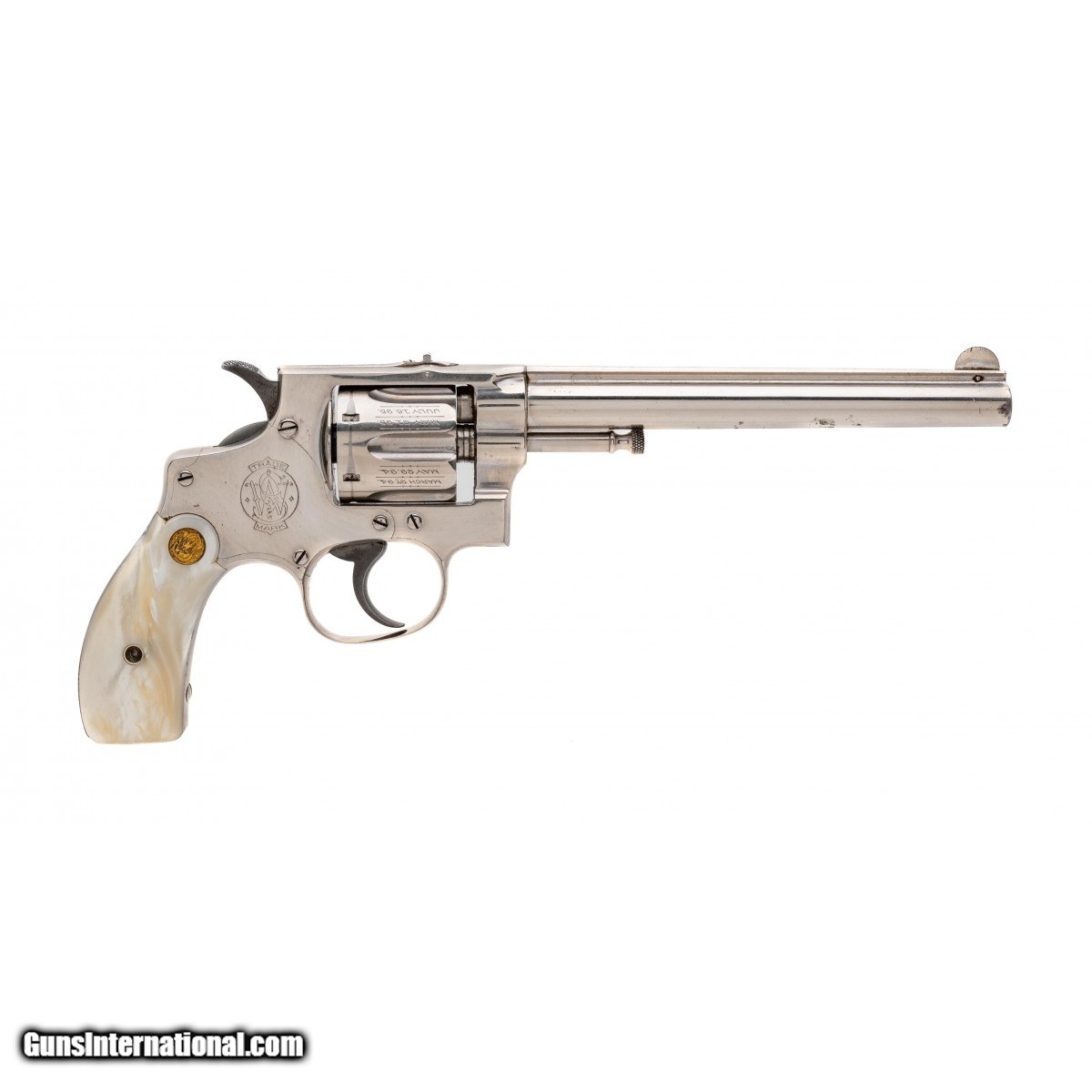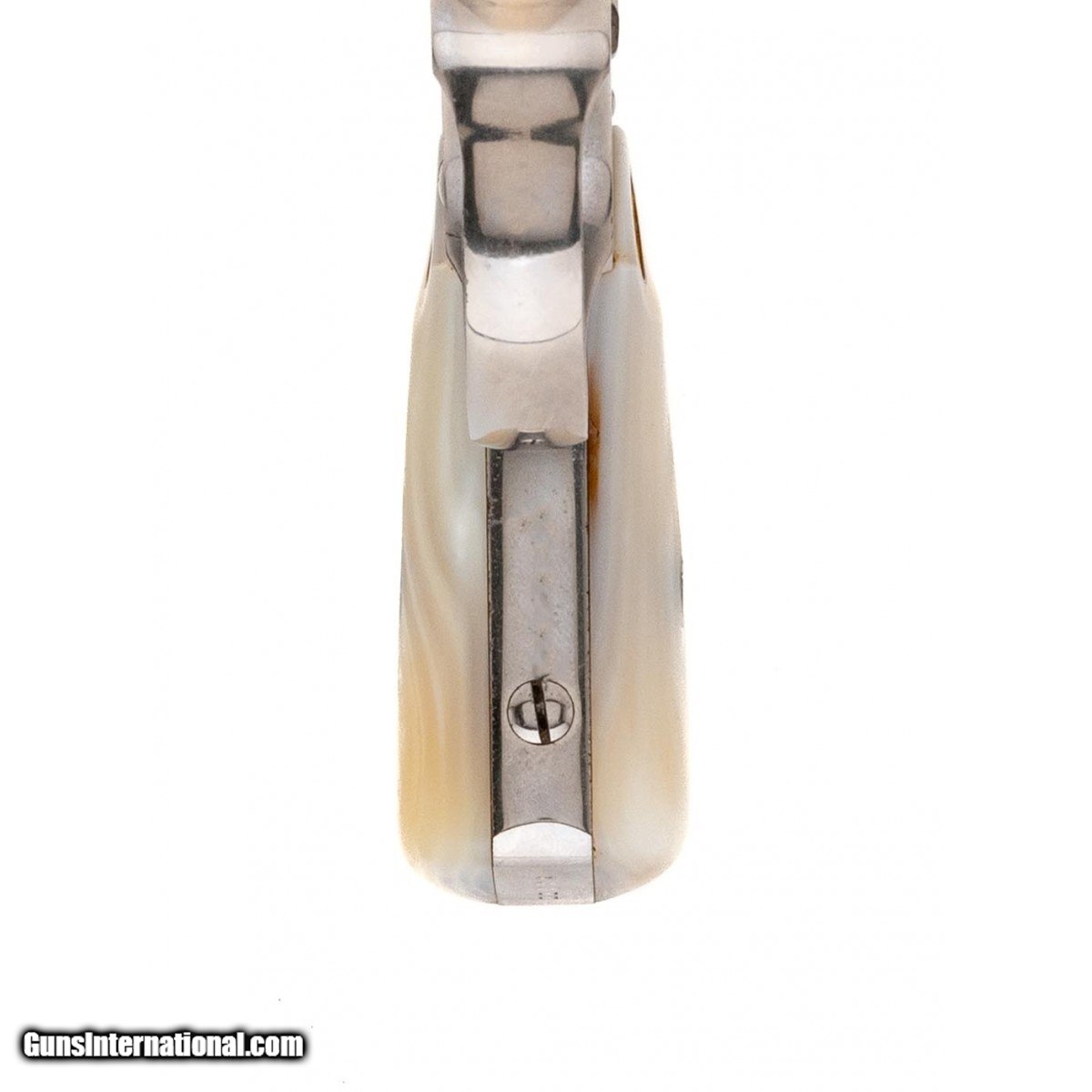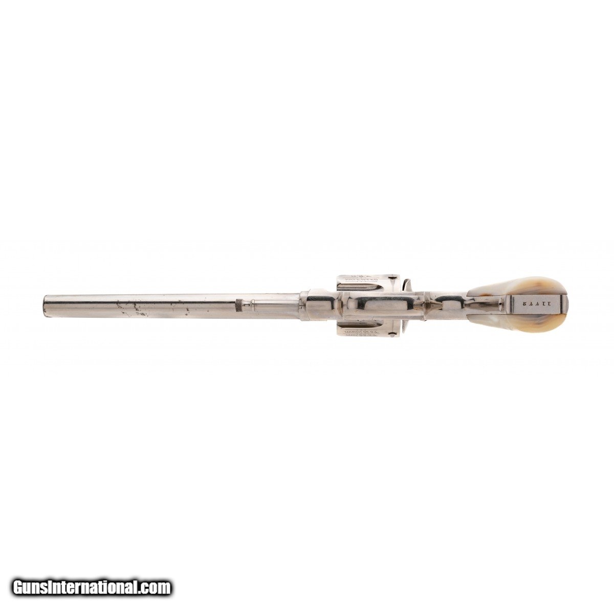 Description: " Serial No. 11772, circa 1896-1898, .32 S&W, 6"" round barrel. Nickel finish rates near excellent with scattered light pin-prick oxidation noted in some areas. Bore is bright with frosting visible in the grooves. Rifling remains strong. Beautiful Mother of Pearl Medallion grips are in excellent condition. Overall a very fine example of an early Hand Ejector Model! Consignment SOLD Antique: Yes |