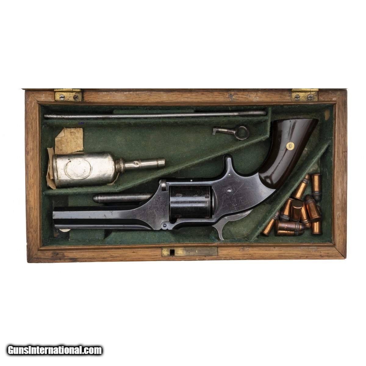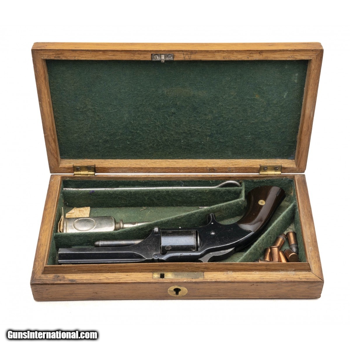 Serial No. 20343, circa 1865-1868, .32RF, 3.5"" round barrel. Beautiful revolver with 95% blue remaining, cylinder has British proof and acceptance marks. Bore has light surface frosting in the grooves. Two piece rosewood grips are in near excellent condition with very light handling wear visible. Action functions correctly, comes with case that has oiler, cleaning rod, key and 10 loose rounds. ConsignmentÂ