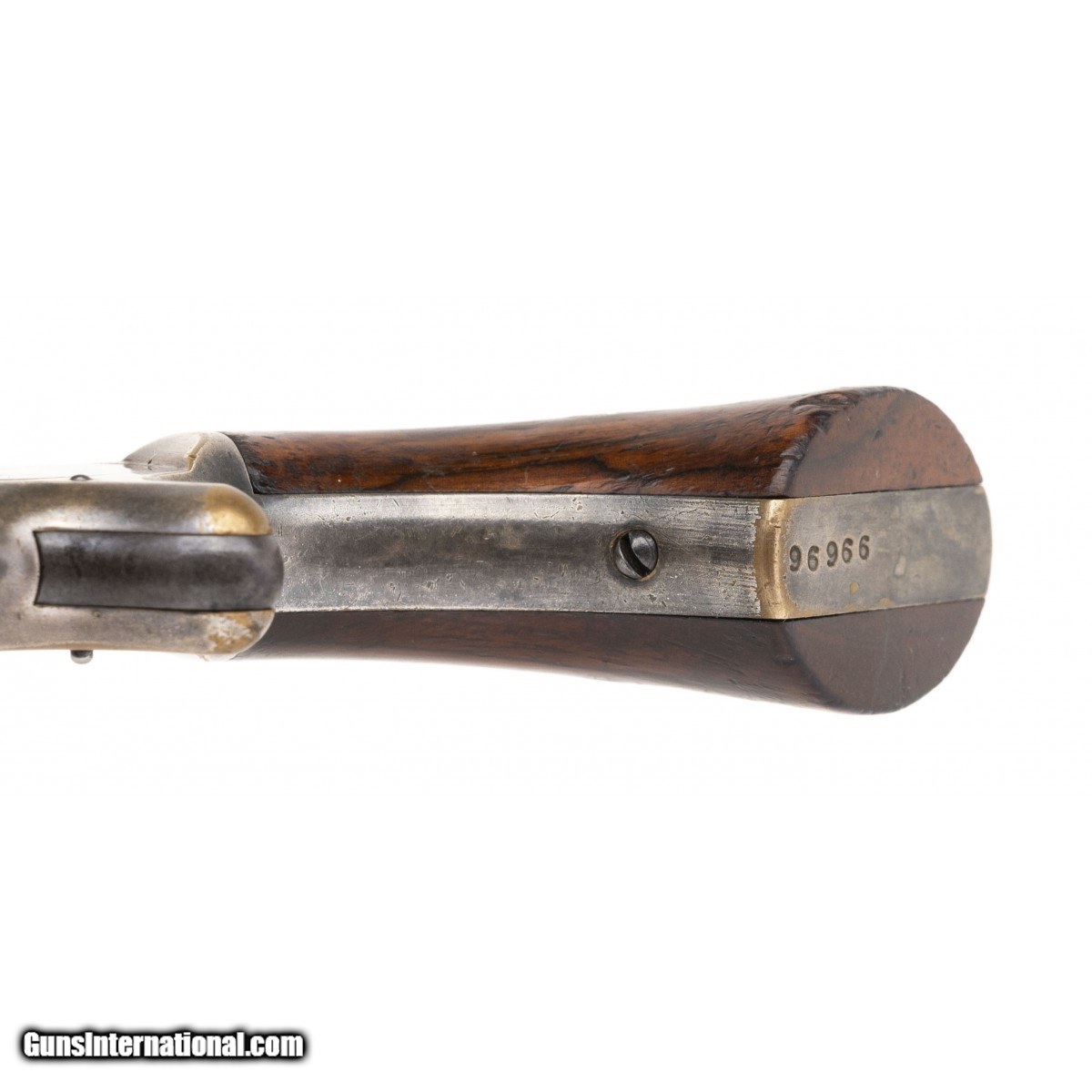 Description: " This Smith & Wesson Model 1 Second Issue revolver is circa 1860 to 1868. The 3 3/16"" 22 Short octagon barrel has a fair dark bore with visible rifling. The round 7-shot non-fluted cylinder has the 1855, 1859, and 1860 patent date markings. The barrel assembly is bright with scattered staining and light roughness, especially at the muzzle. The silver plated brass frame retains approx. 85% silver. The rosewood grips are fine with most of their original finish and a couple of small chips on the lower left edge. The action functions correctly. The Model No. 1 was a popular private purchase revolver for Civil War soldiers. This is a nice representative example at a reasonable price. SOLD Antique: Yes |