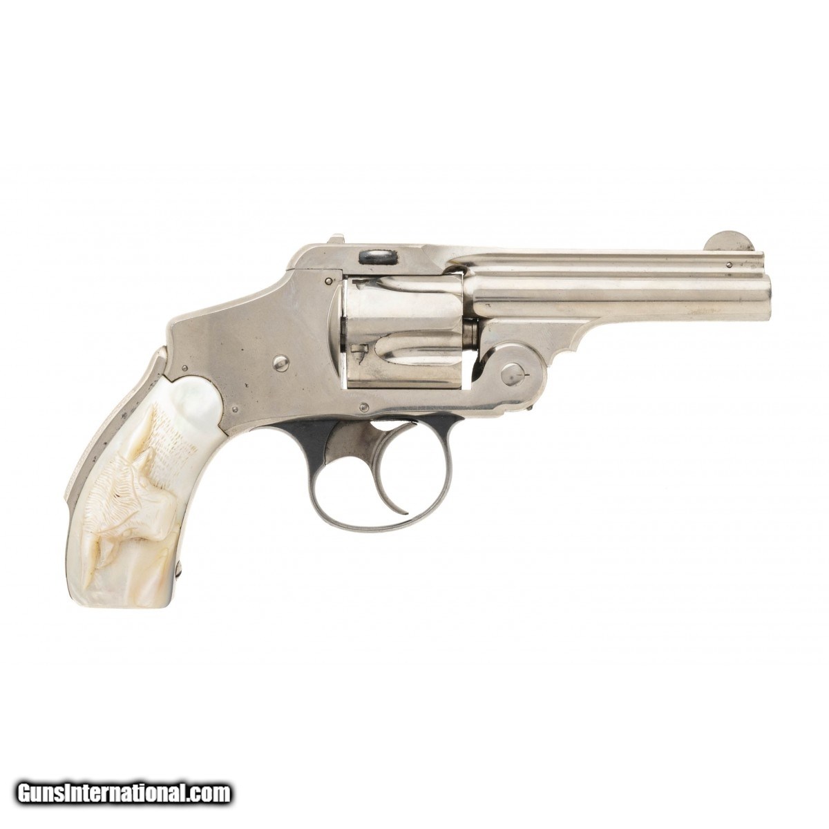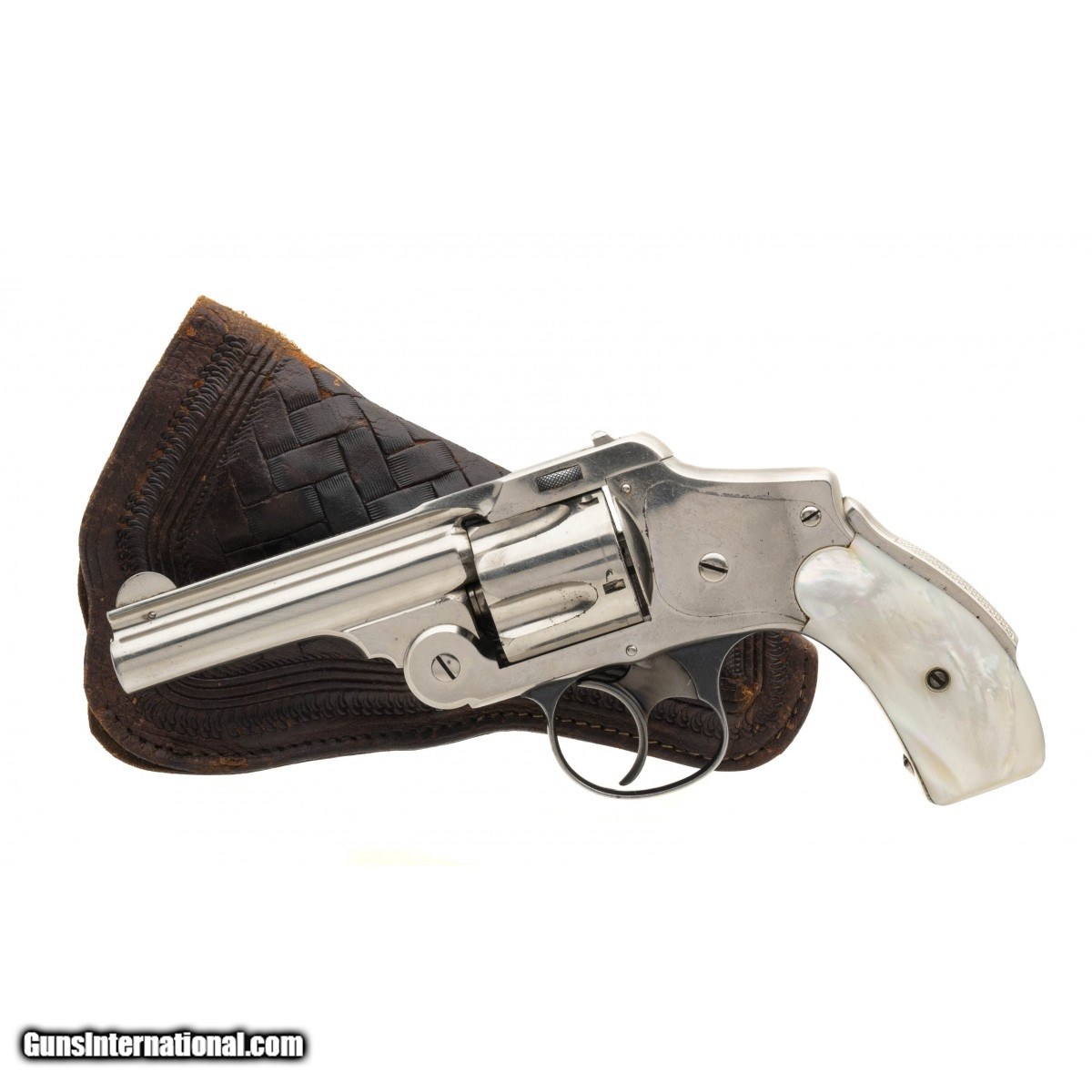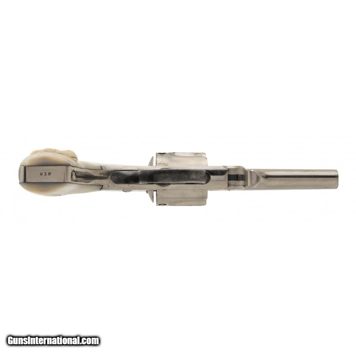 Description: "Serial number 910. Made in 1887. 38 S&W caliber with a 3 ¼" barrel. Very fine 1st Model 38 S&W caliber New Departure Model. This gun is in excellent original condition with 95%+ of the original nickel finish. The grips are two piece pearls with a carved steer head on the right hand side. Along with this gun is a weaved leather holster. Very fine Smith & Wesson New Departure w/ Holster! SOLD Antique: Yes |